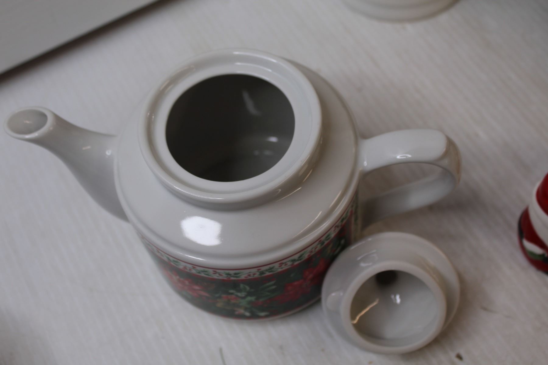 (6) Christmas Mugs, Christmas Tea Pot, Mr & Mrs Claus Toothpick Holders, Tea Light Holder, (4) Ashtr