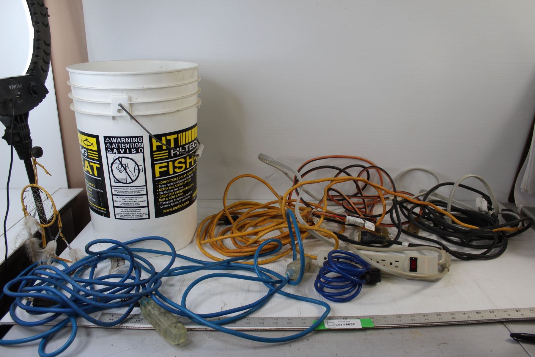 (6) Extension Cords, Extension Block, Bike Lock, Pale