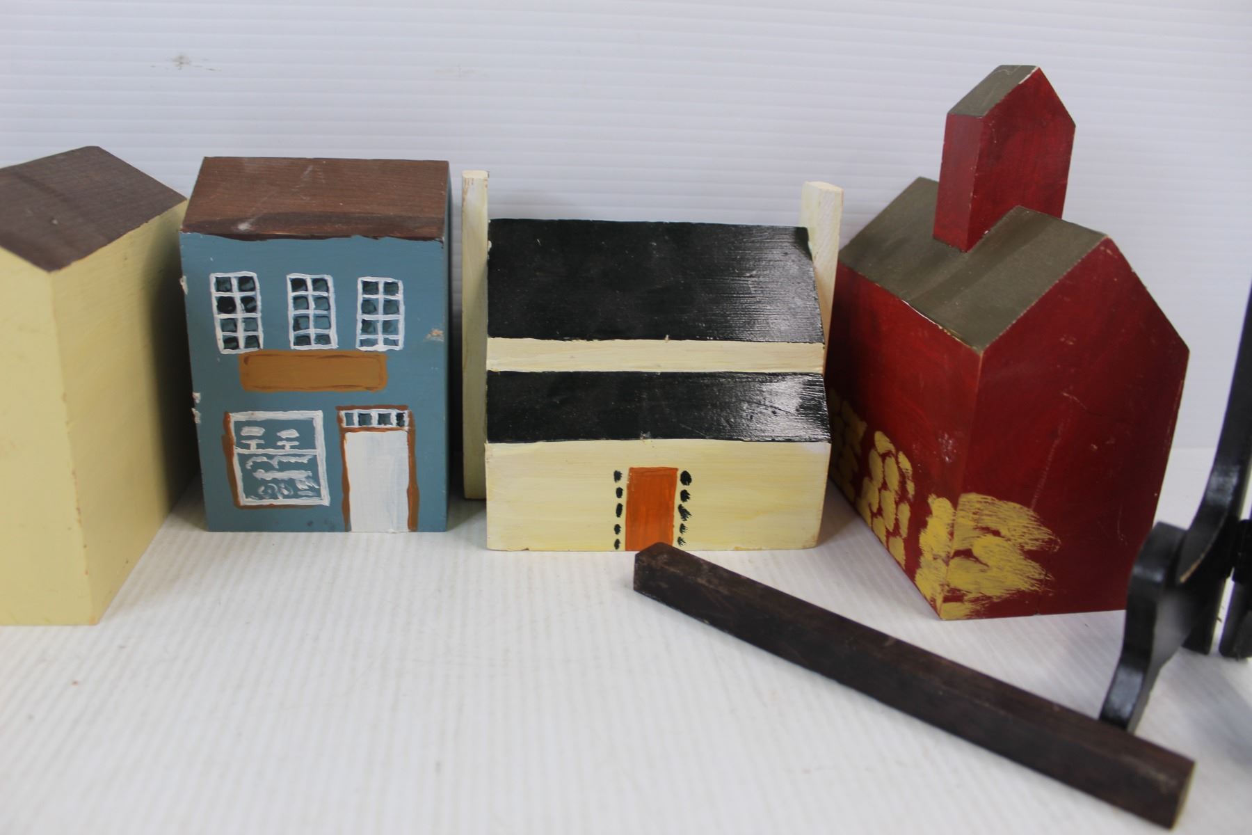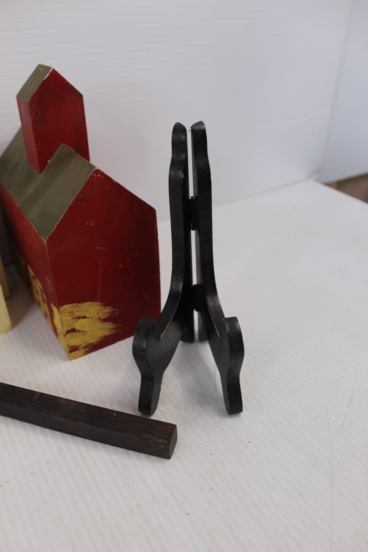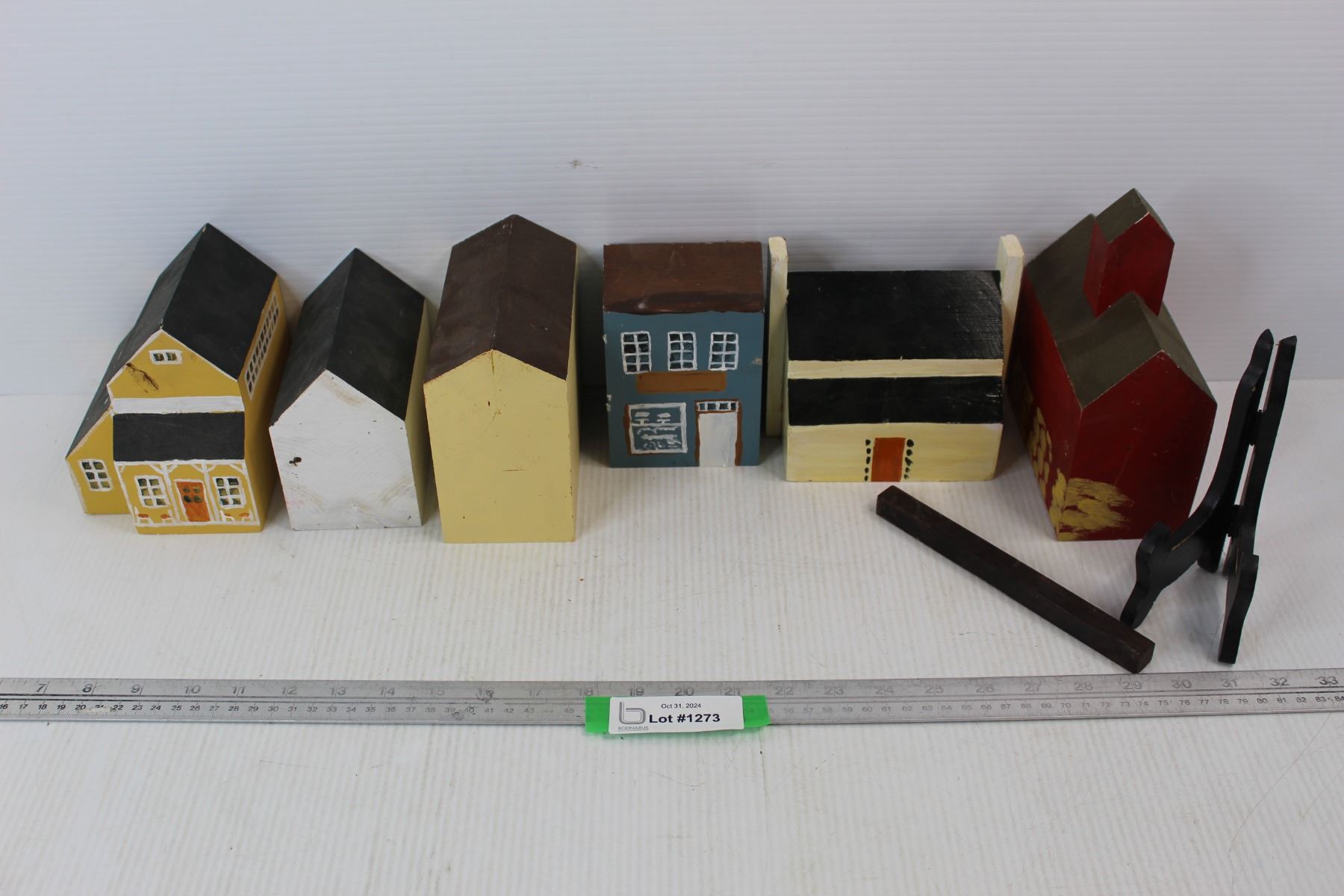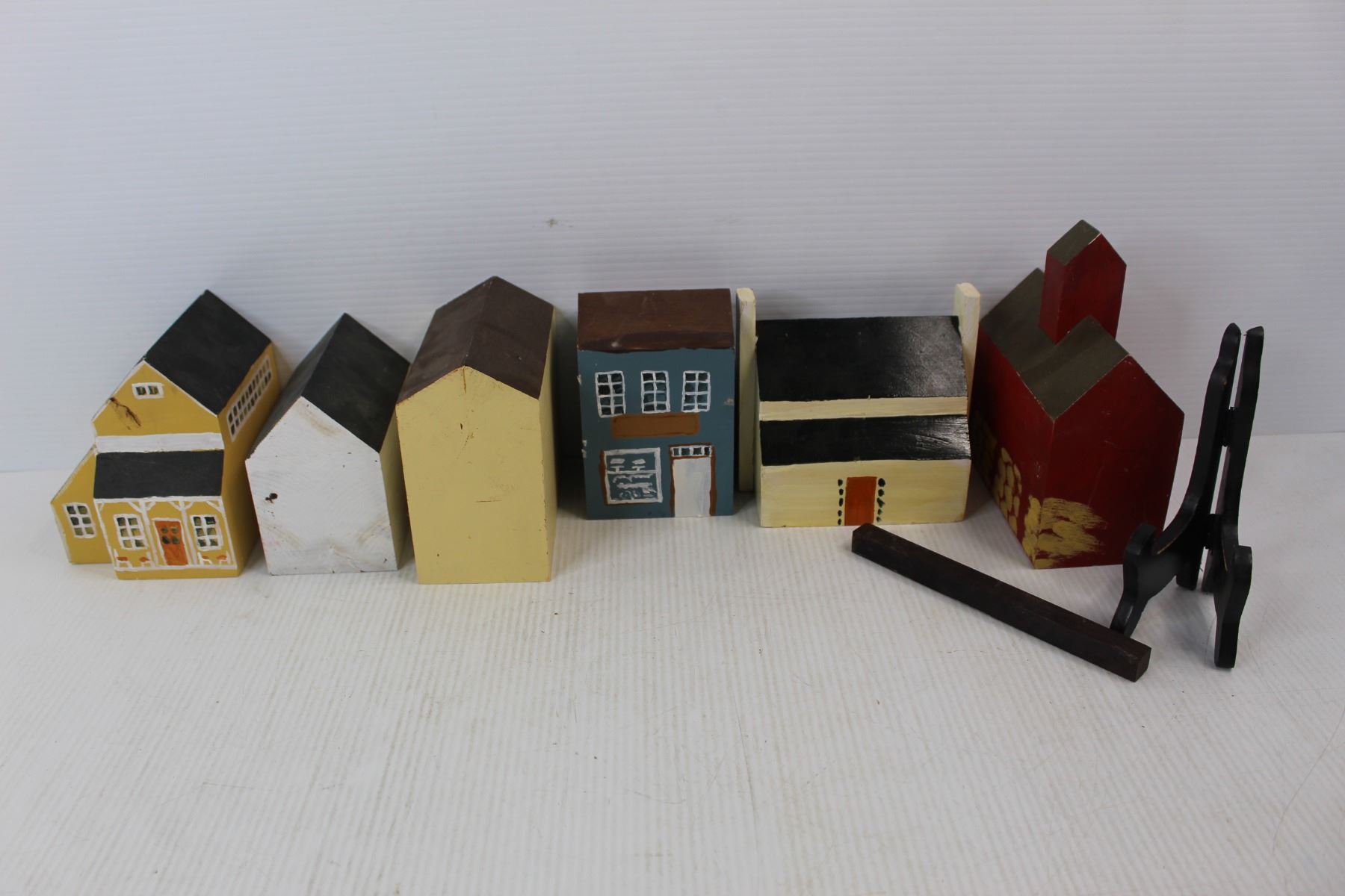 (6) Homemade Hand Painted Wooden Houses/ Buildings, Wooden Picture Stand, Misc.