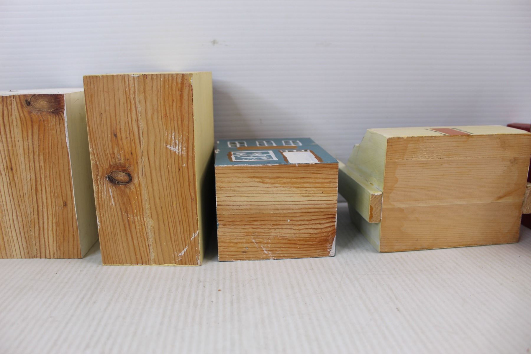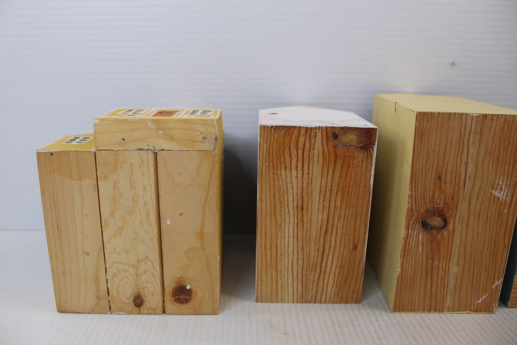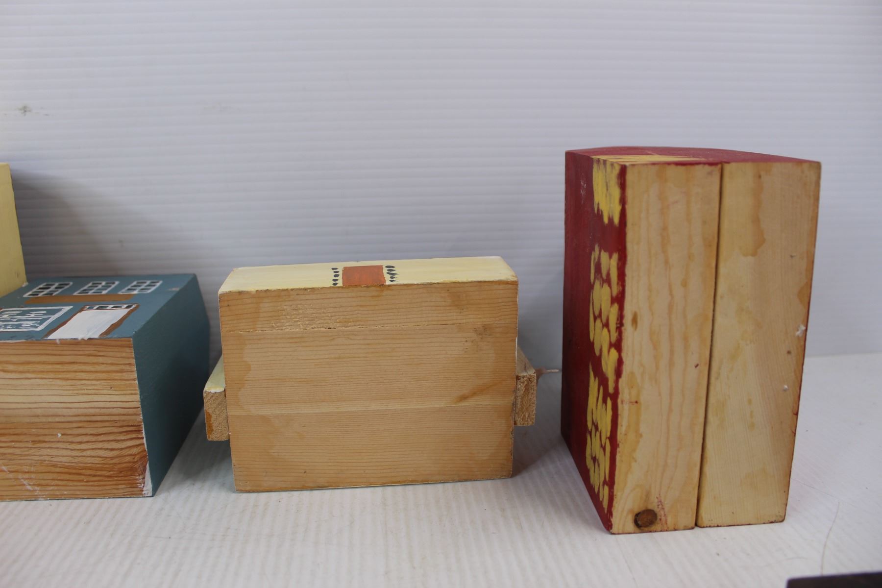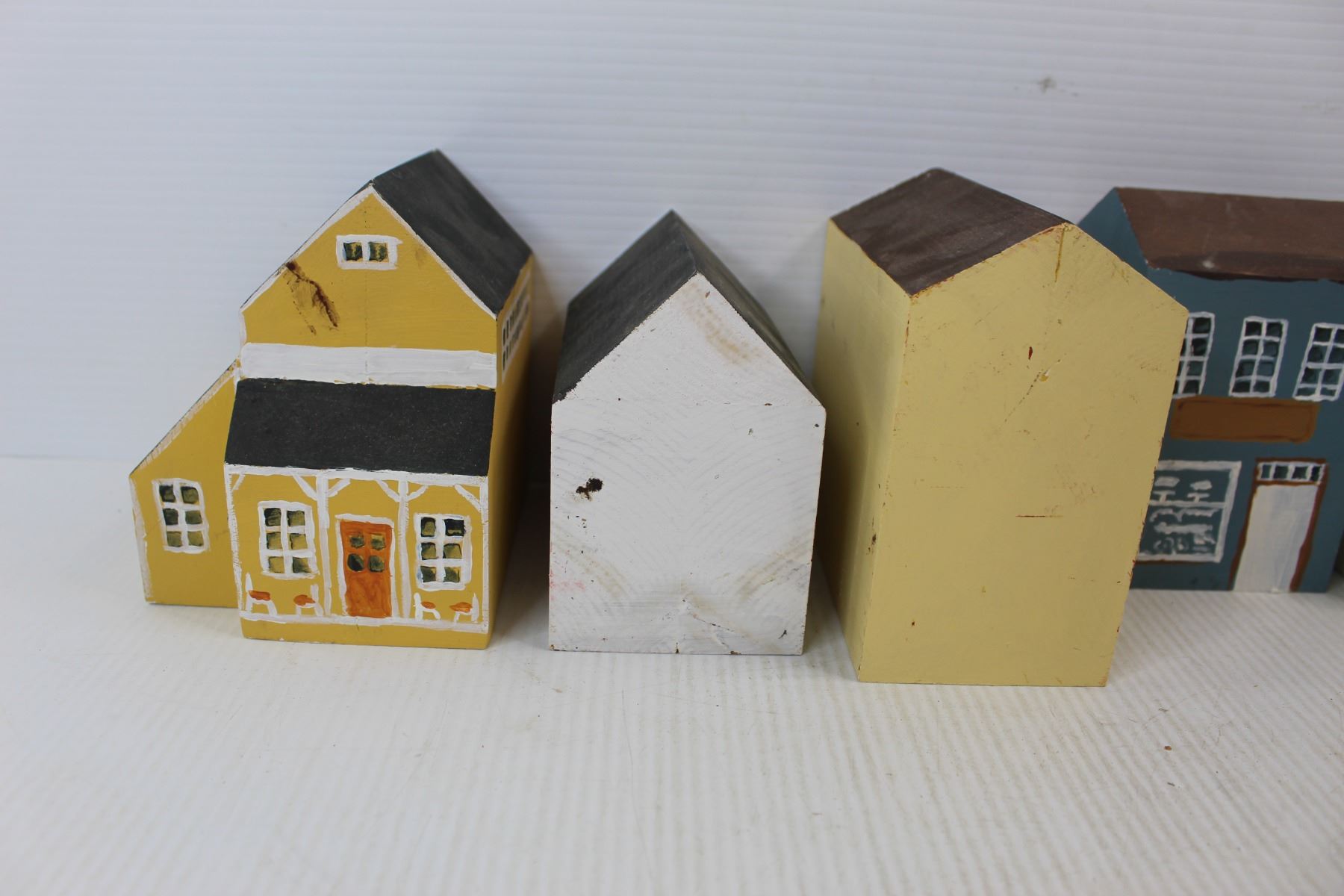 (6) Homemade Hand Painted Wooden Houses/ Buildings, Wooden Picture Stand, Misc.