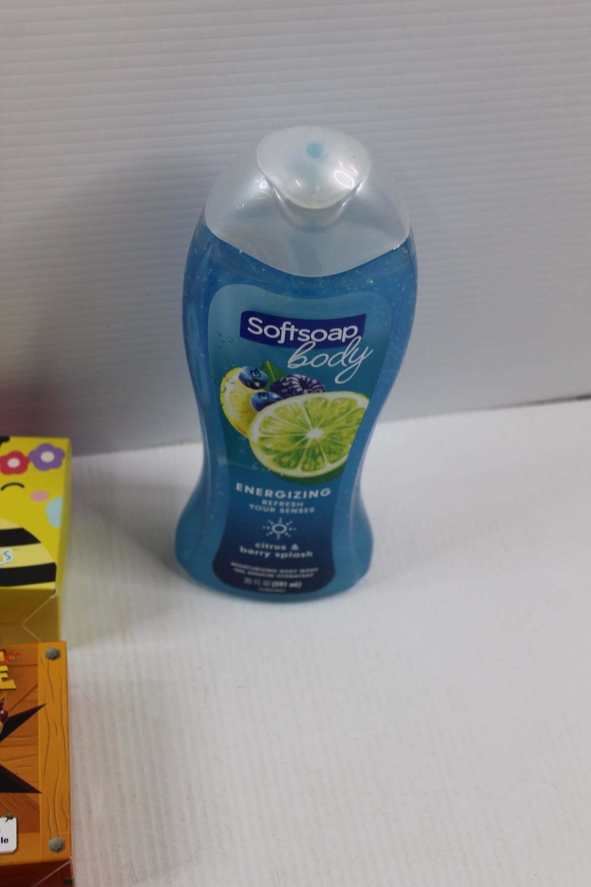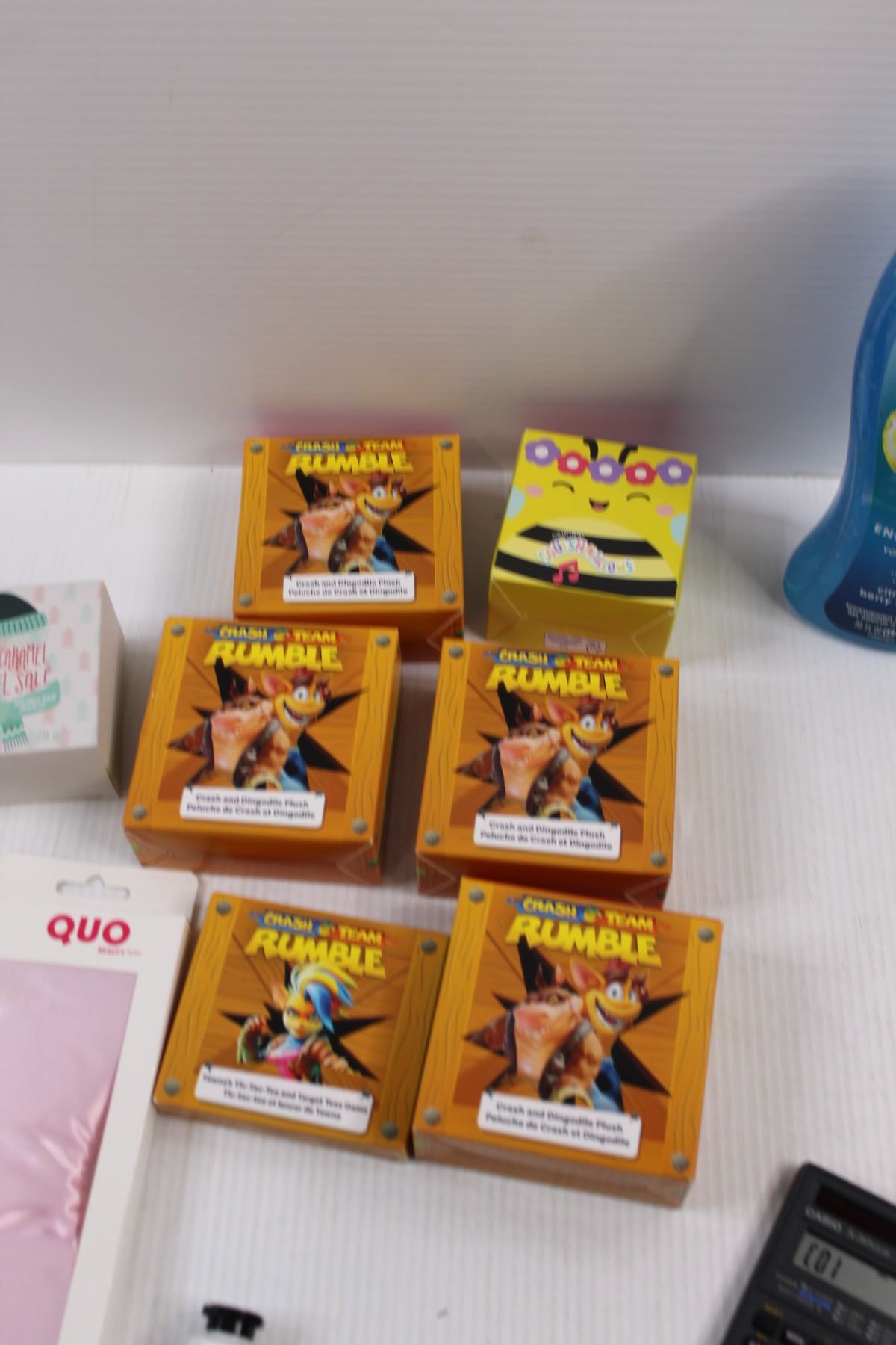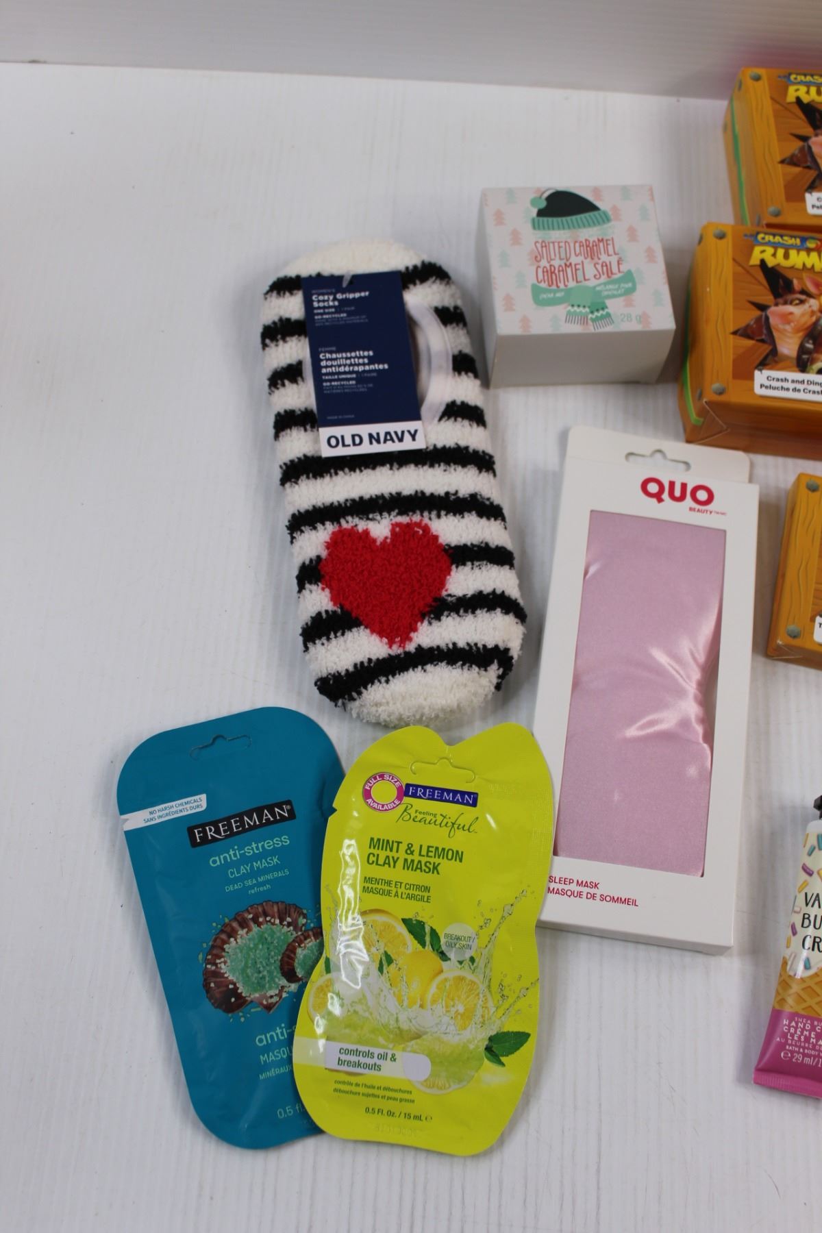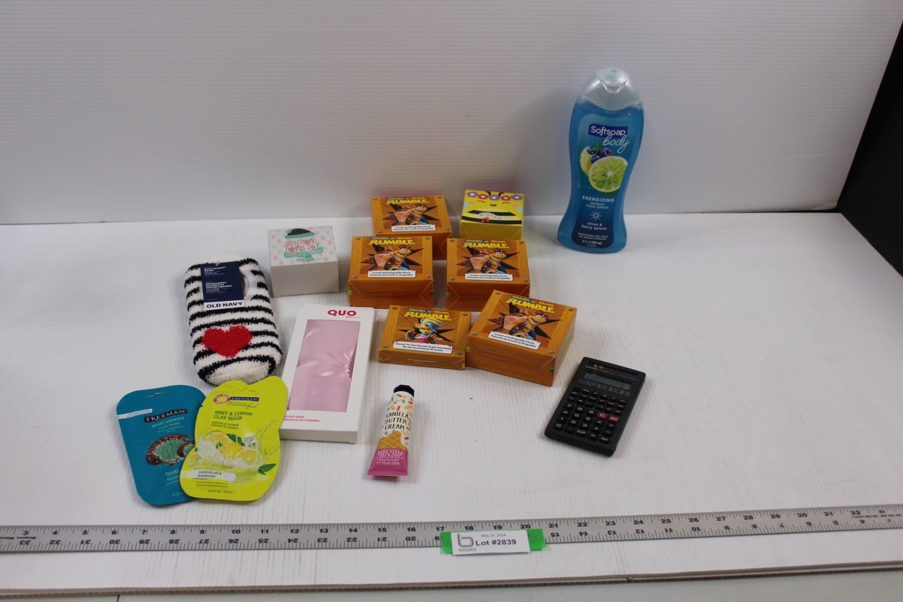 (6) McDonalds Happy Meal Toys (NIB), Cozy Gripper Socks, Beauty Masks, Sleep Mask, Shea Butter Hand Cream, Soft-soap Body Wash, Calculator & Salted Caramel Cocoa Mix