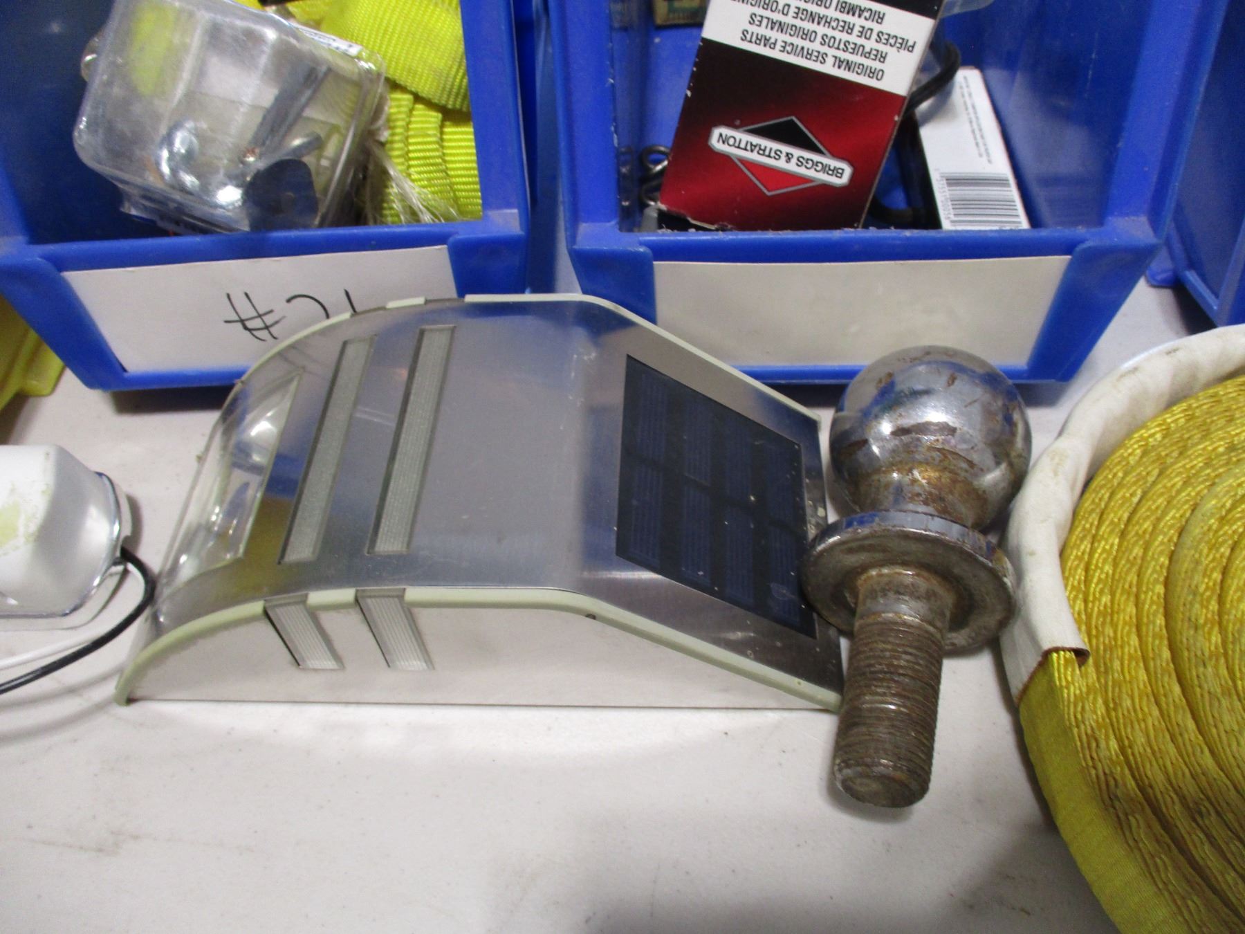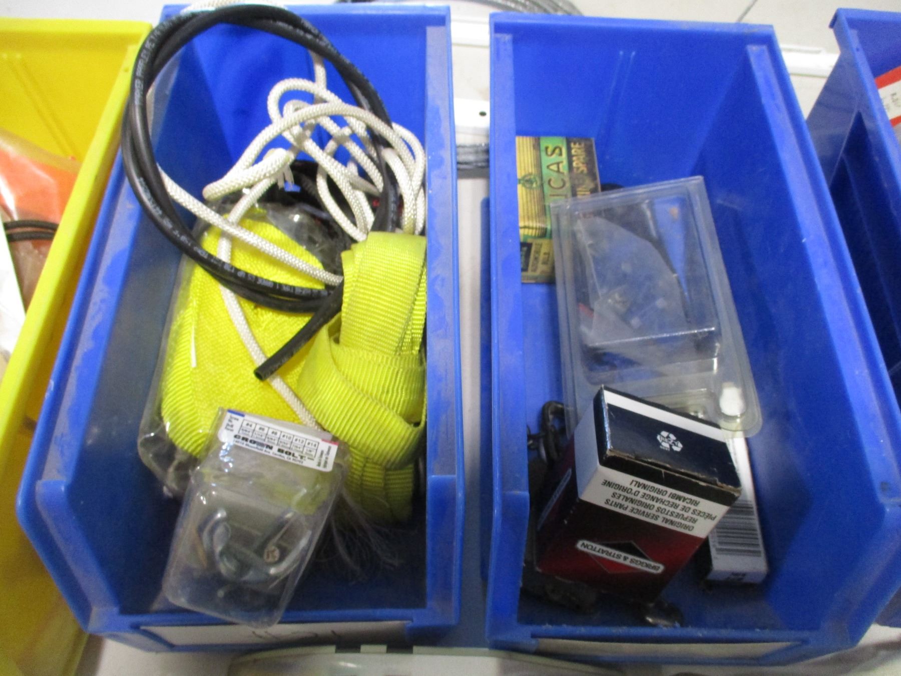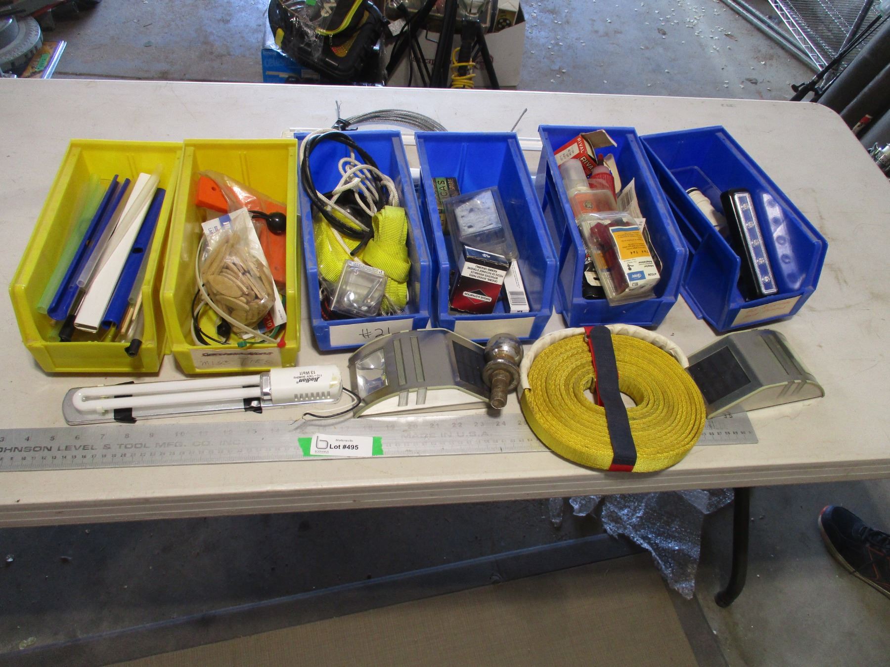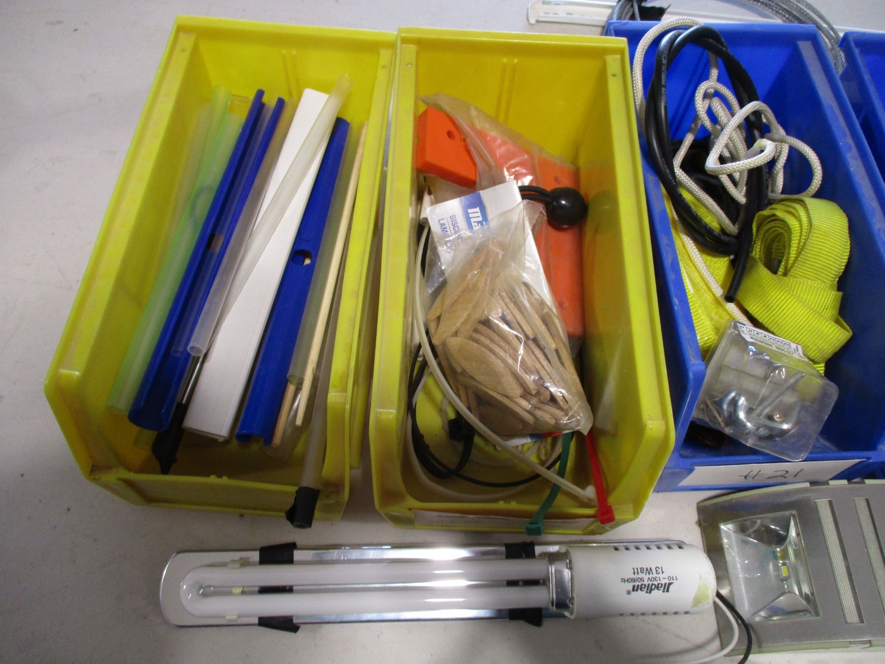 (6) Medium Sized Stackable Storage Trays w/Contents (Lights, Webbed Sling, Adapters Cables etc.)