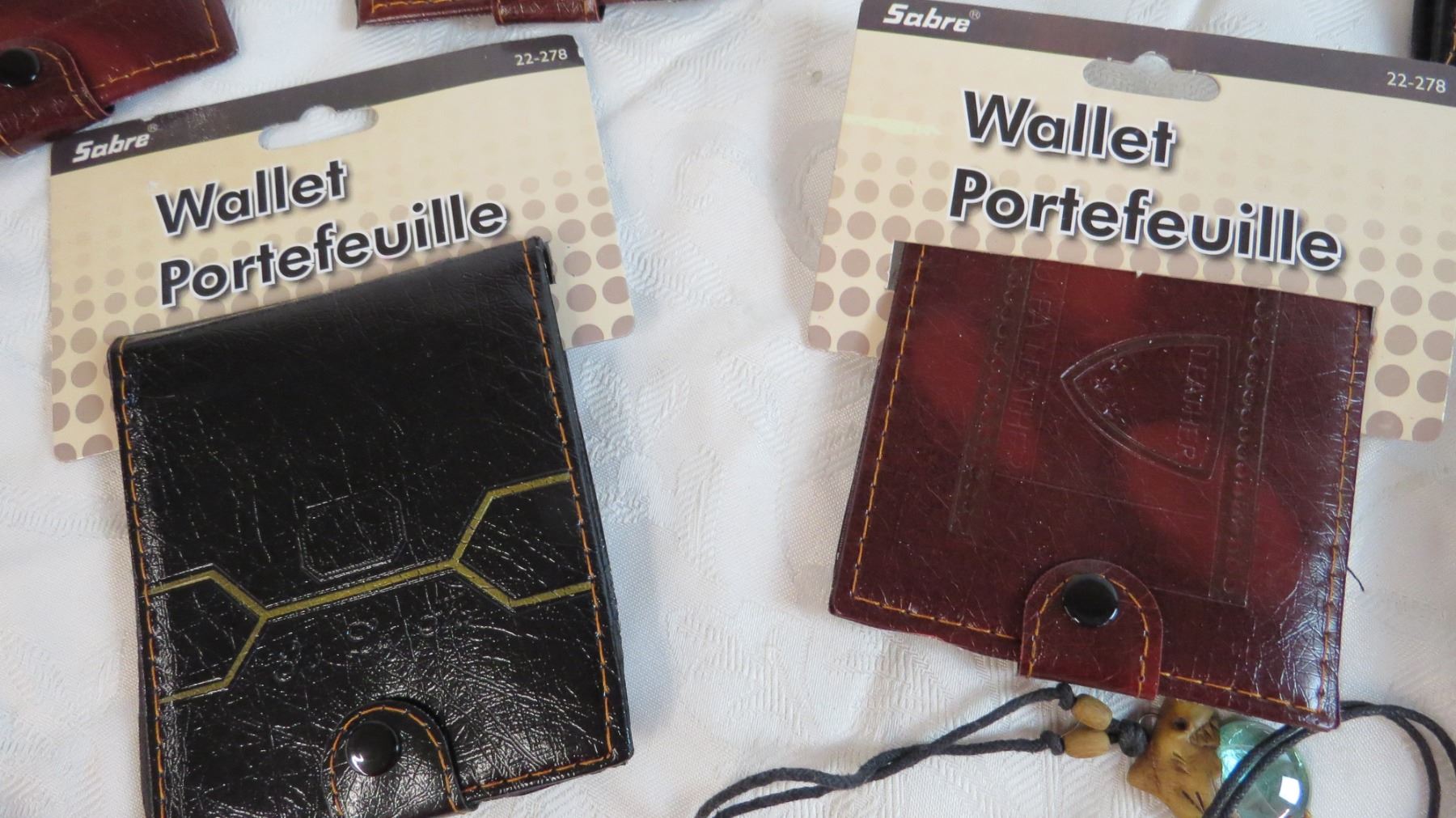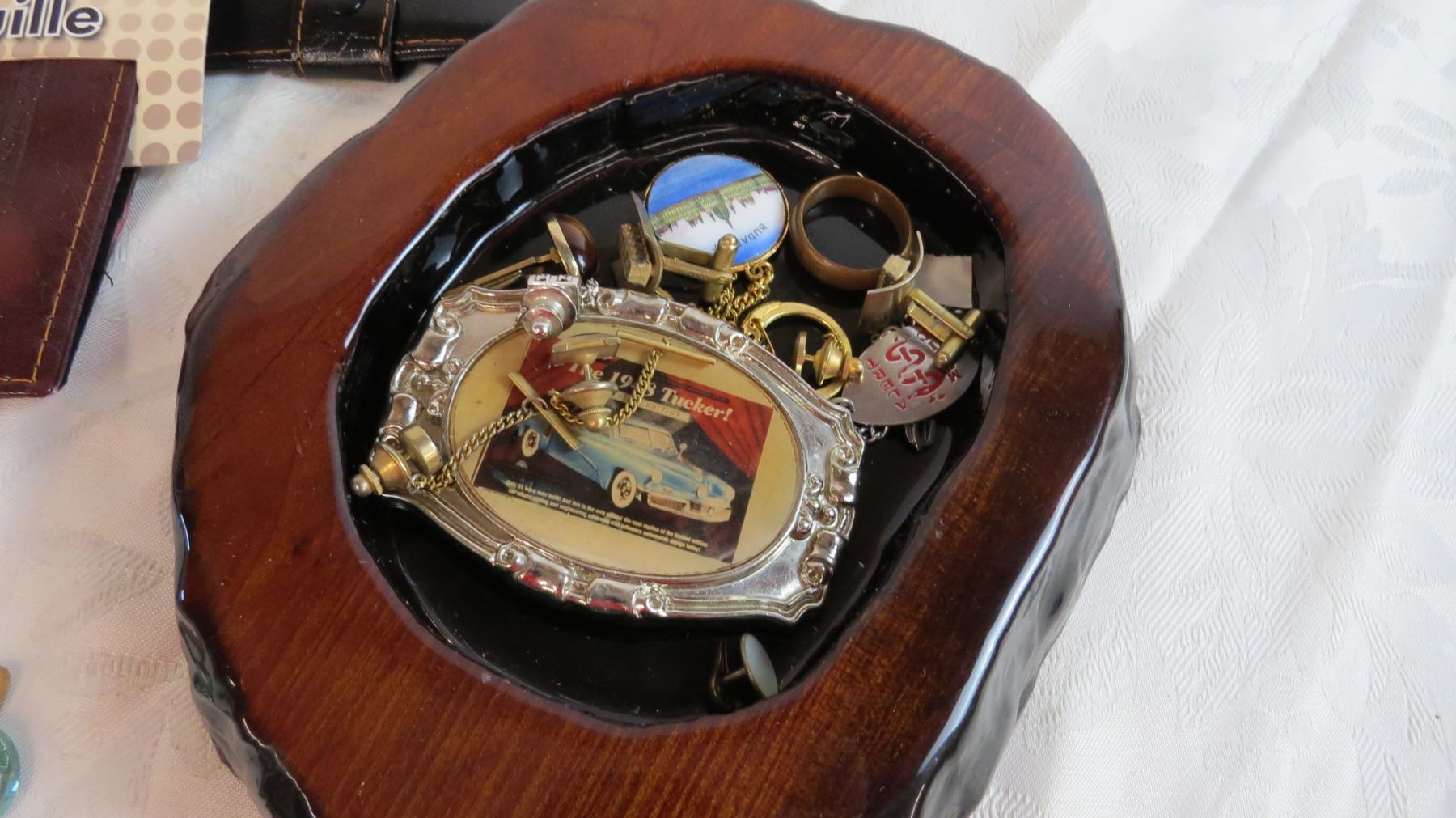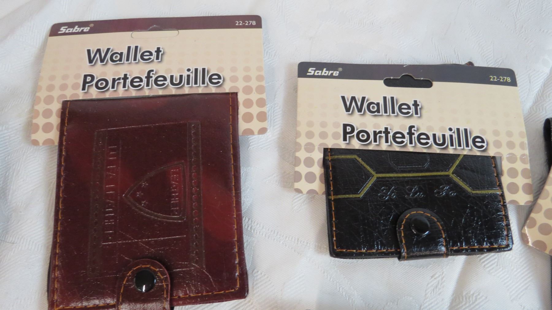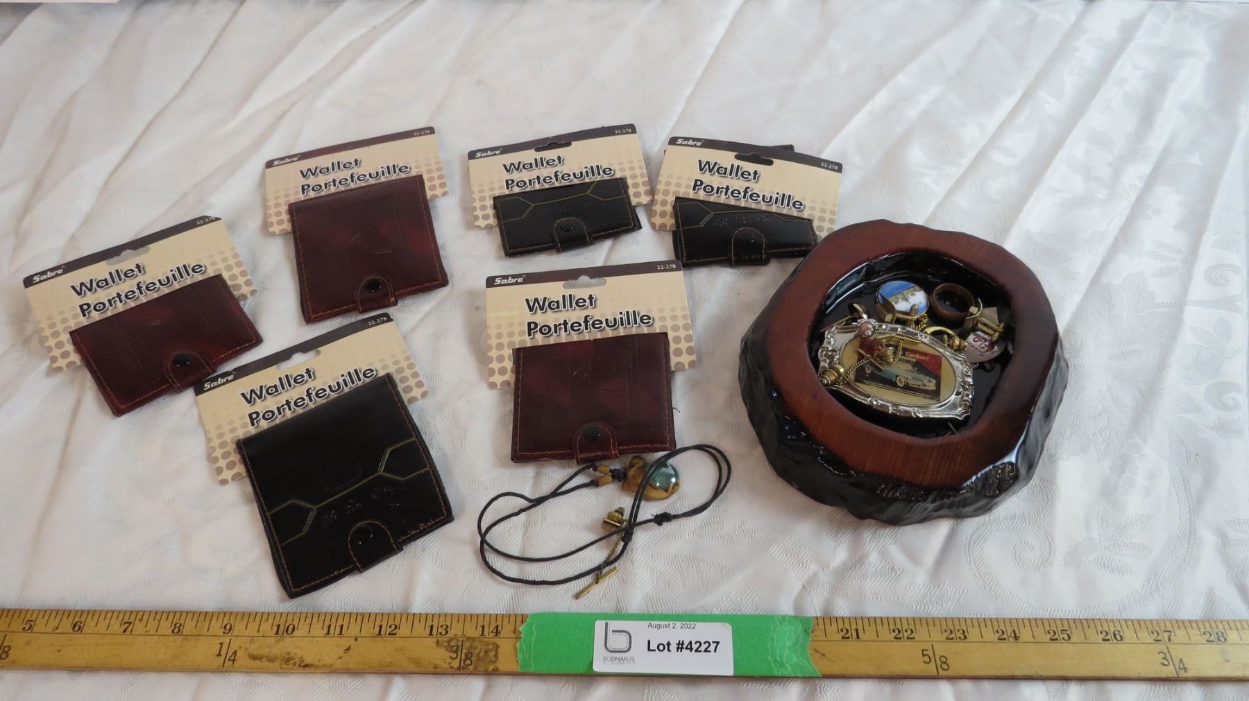 (6) Mens Wallets + Faux Wood Tray with mens accessories