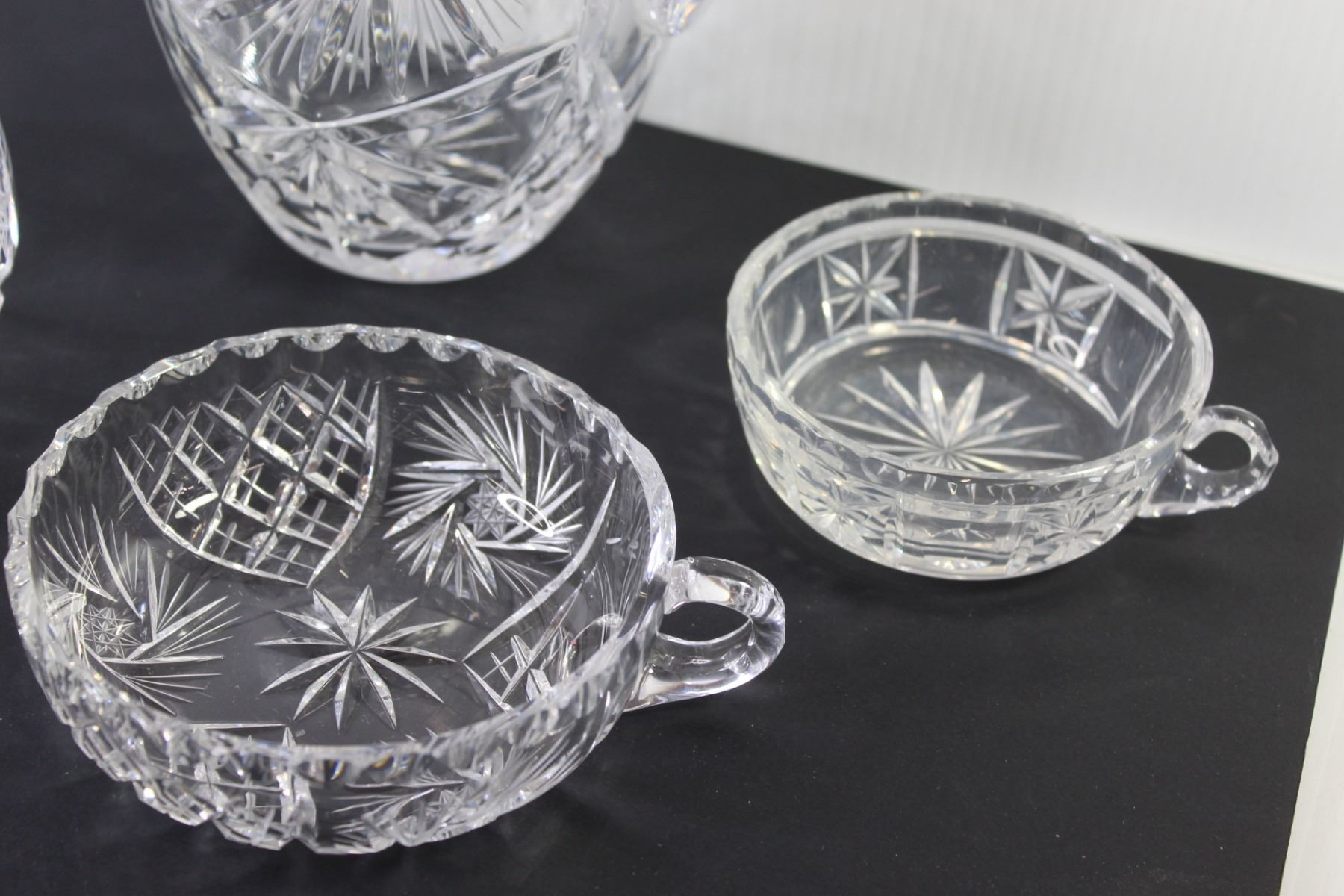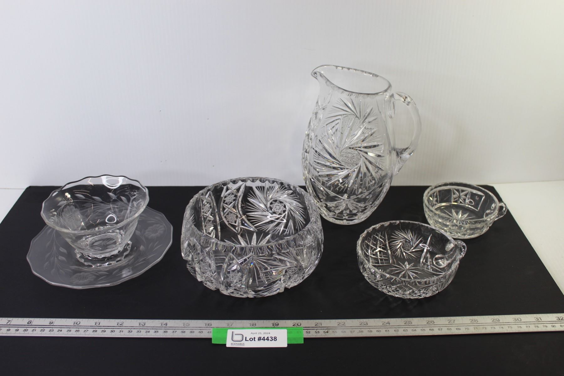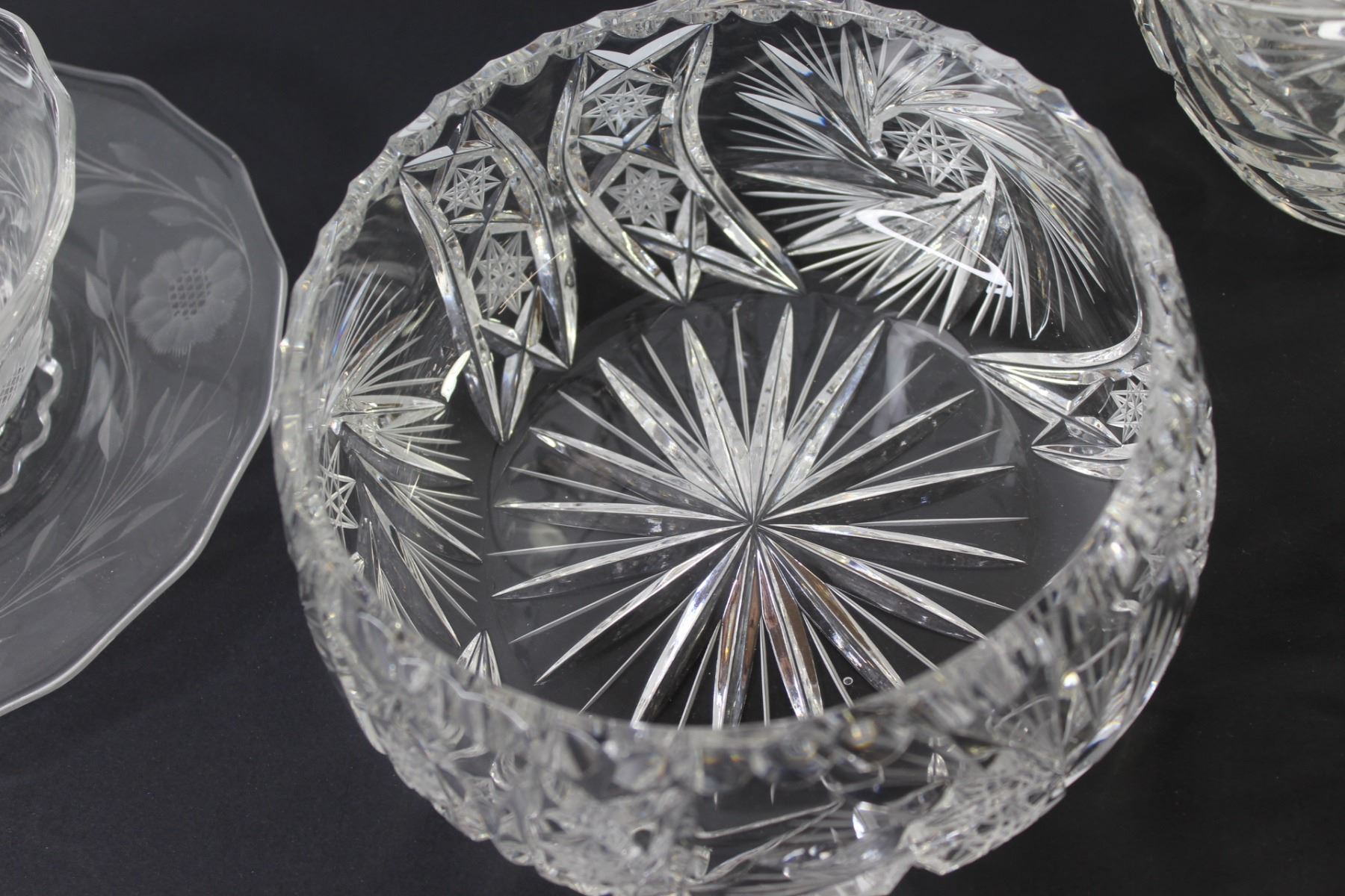 (6) Pin Wheel Crystal Glass: Pitcher, Serving Bowls, Plate & Candy Dishes