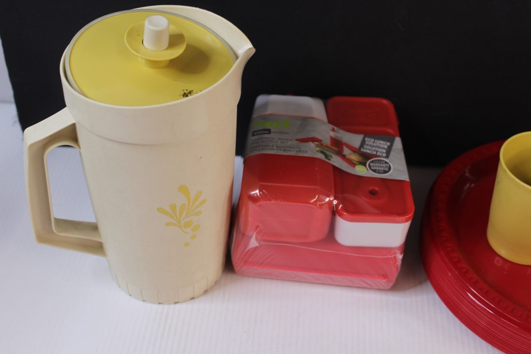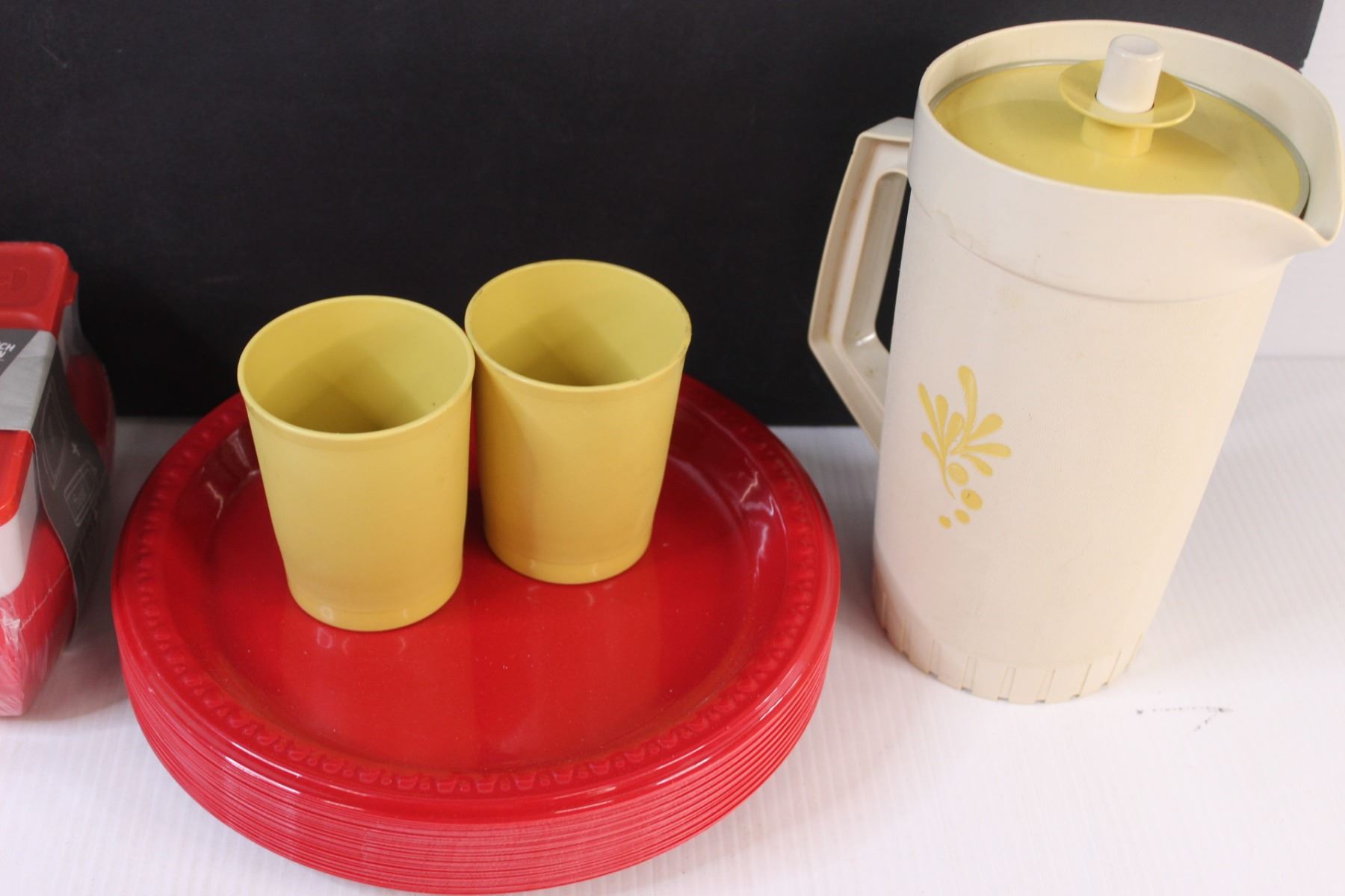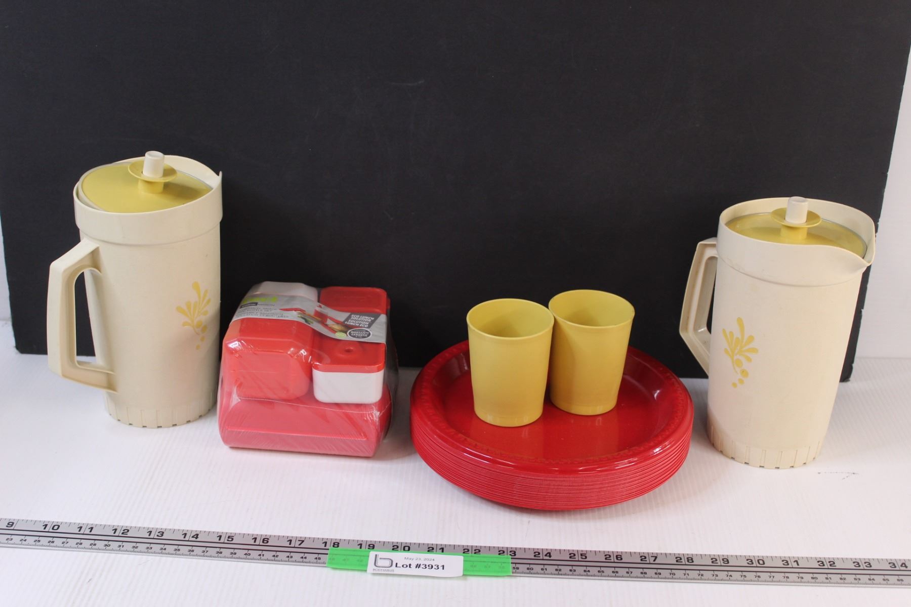(6) Plastic Kitchenware: 2 - Tupperware Juice Jugs; Stack of Plastic Plates; NIB Snack Set