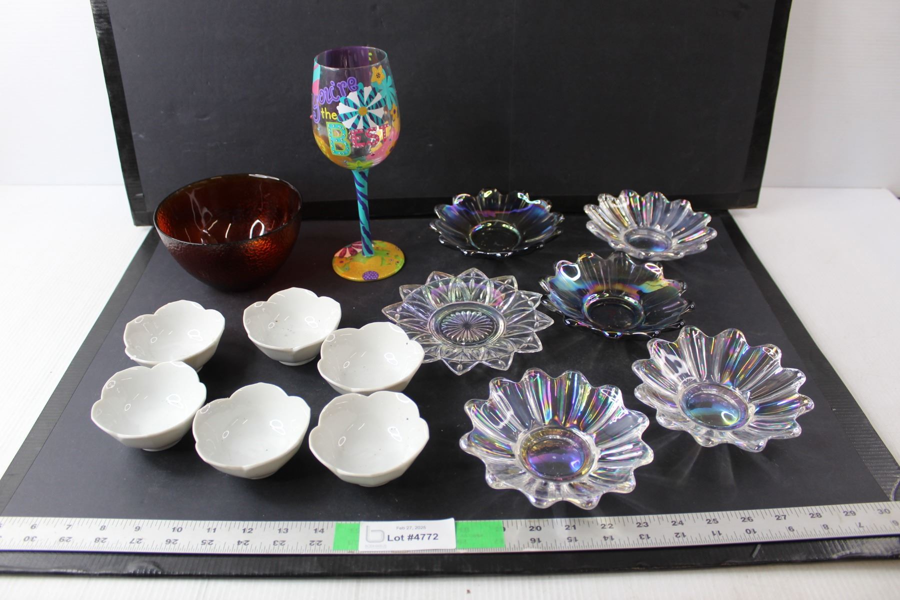(6) Rainbow Glass Dishes, Wine Glass, (6) Miniature Ceramic Bowls, Amber Glass Bowl