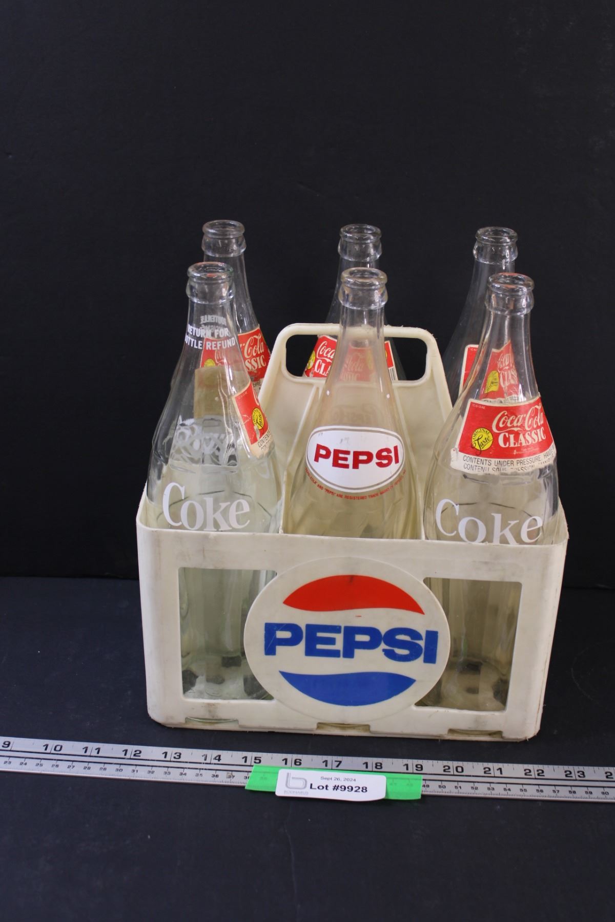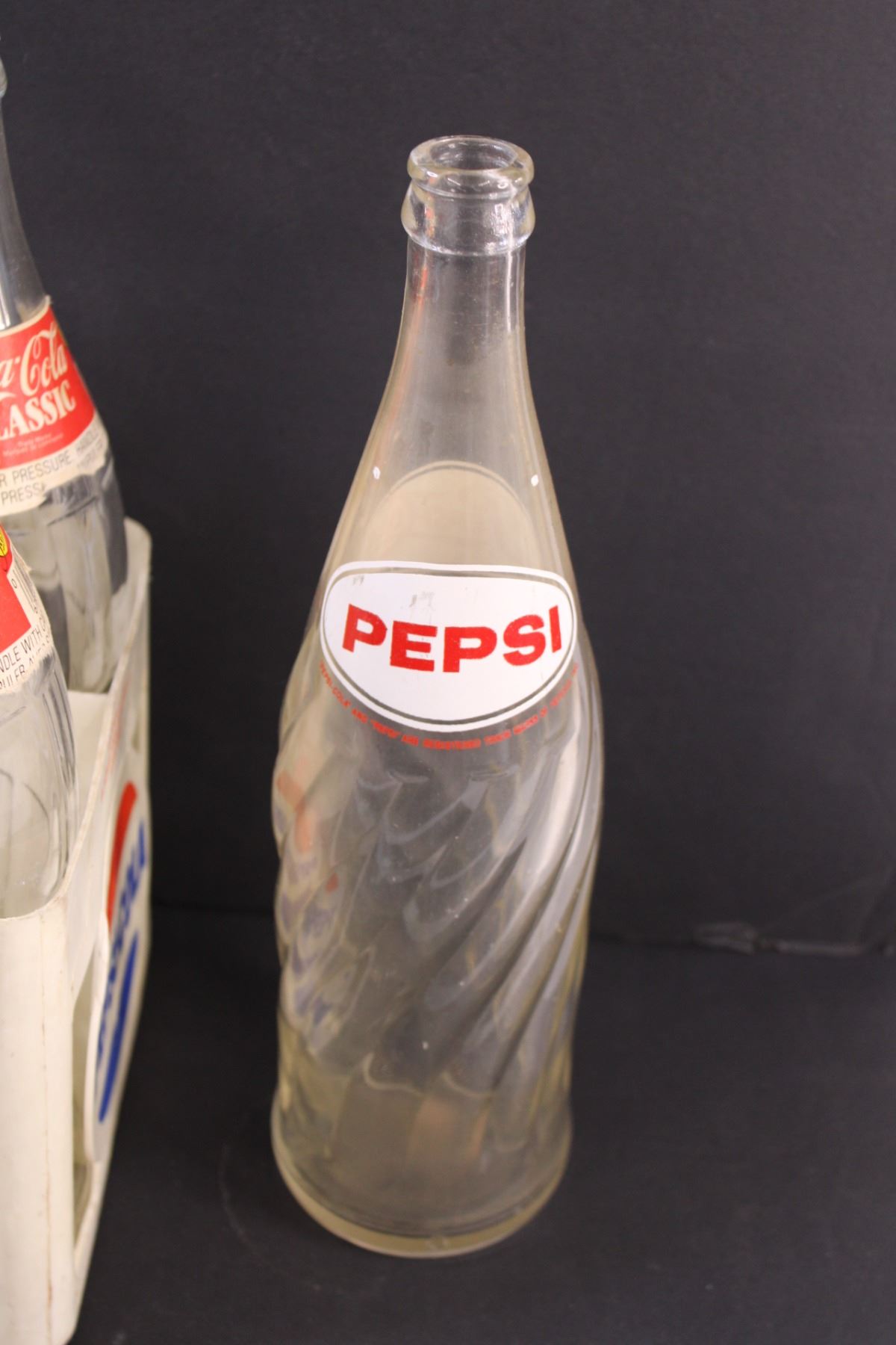 (6) Vintage Coca Cola & Pepsi 1 Litre Glass Bottles & Pepsi Plastic Carrier