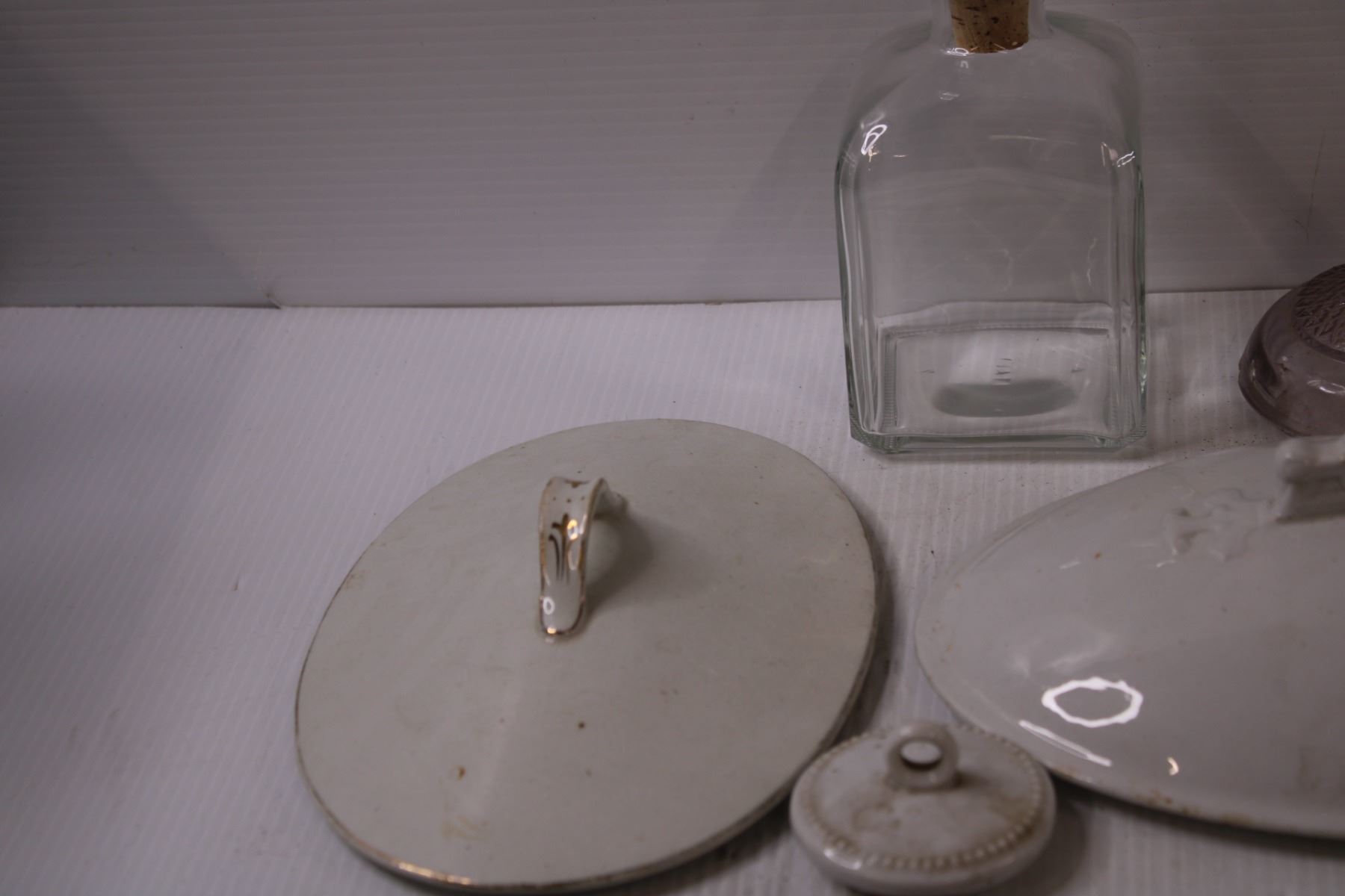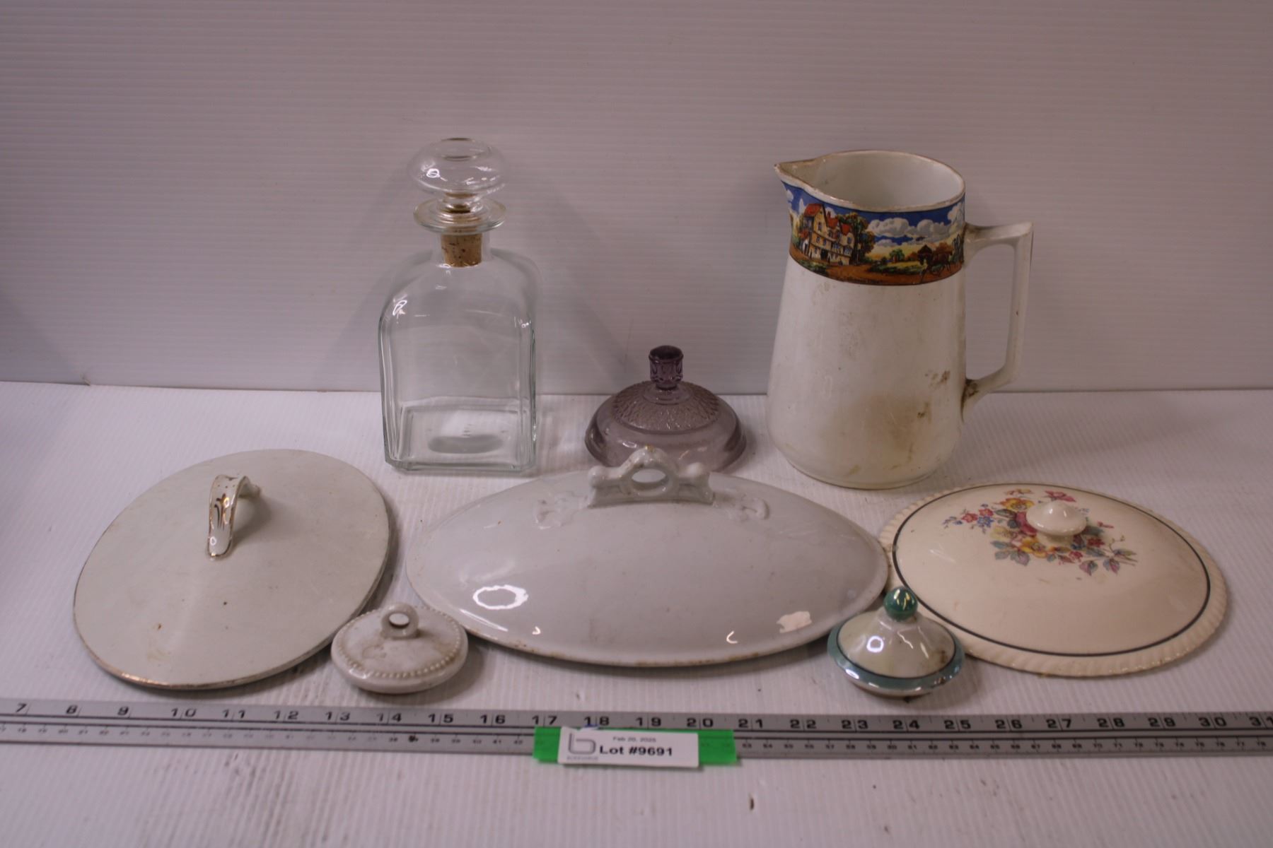 (6) Vintage Lids (Assorted), Glass Decanter, Village Ceramic Pitcher