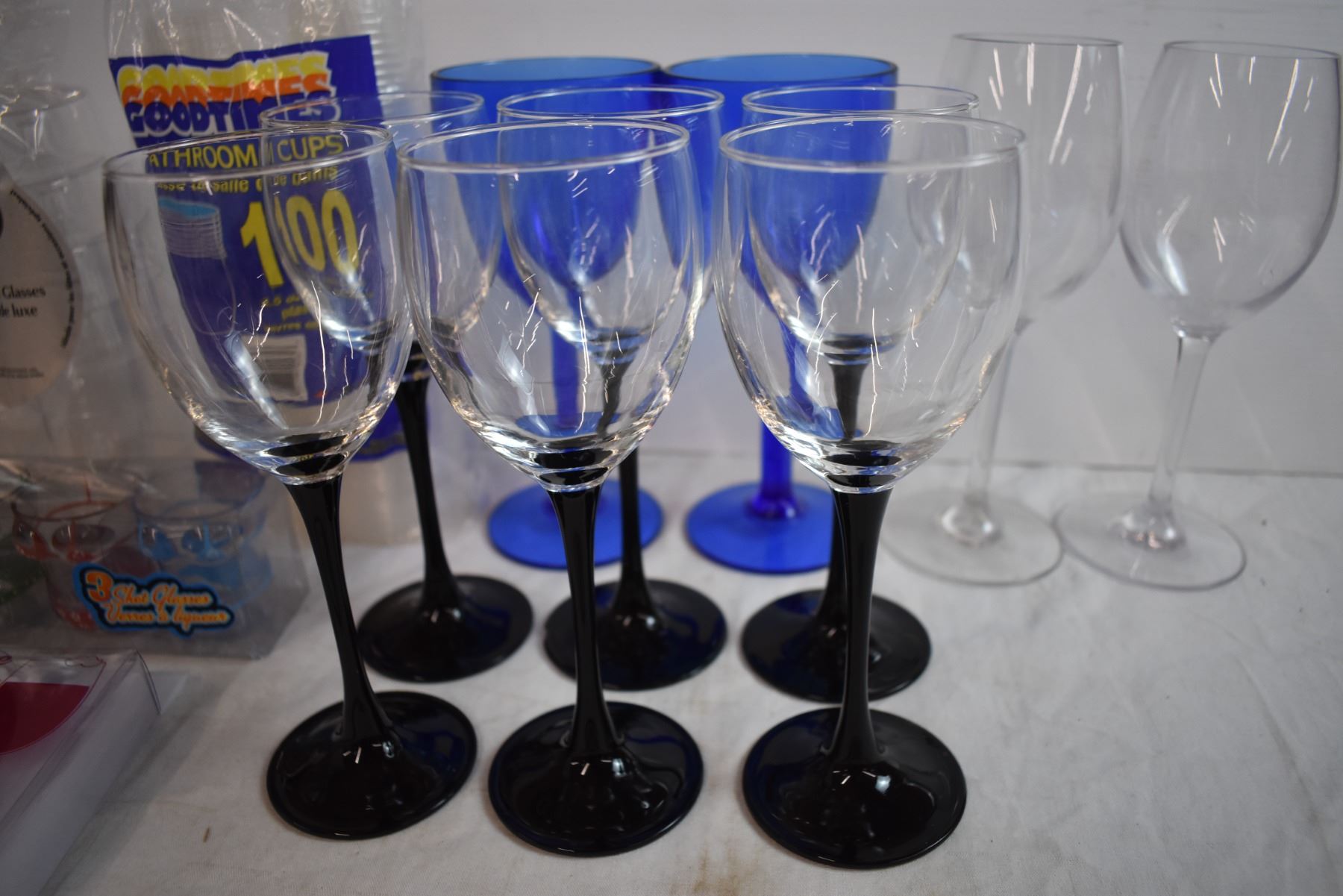 (6) Wine Glasses With Plastic Wine Cups, Plastic Cups and Shot Glasses