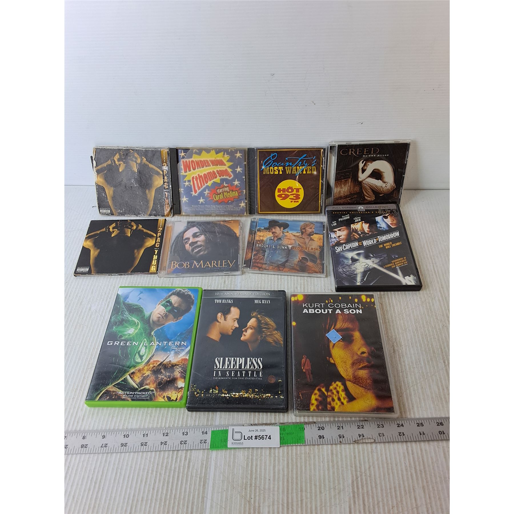 (7) CDs- Creed, Tupac, Brooks & Dunn & (4) DVDs- Kurt Cobain, Green Lantern, Misc.