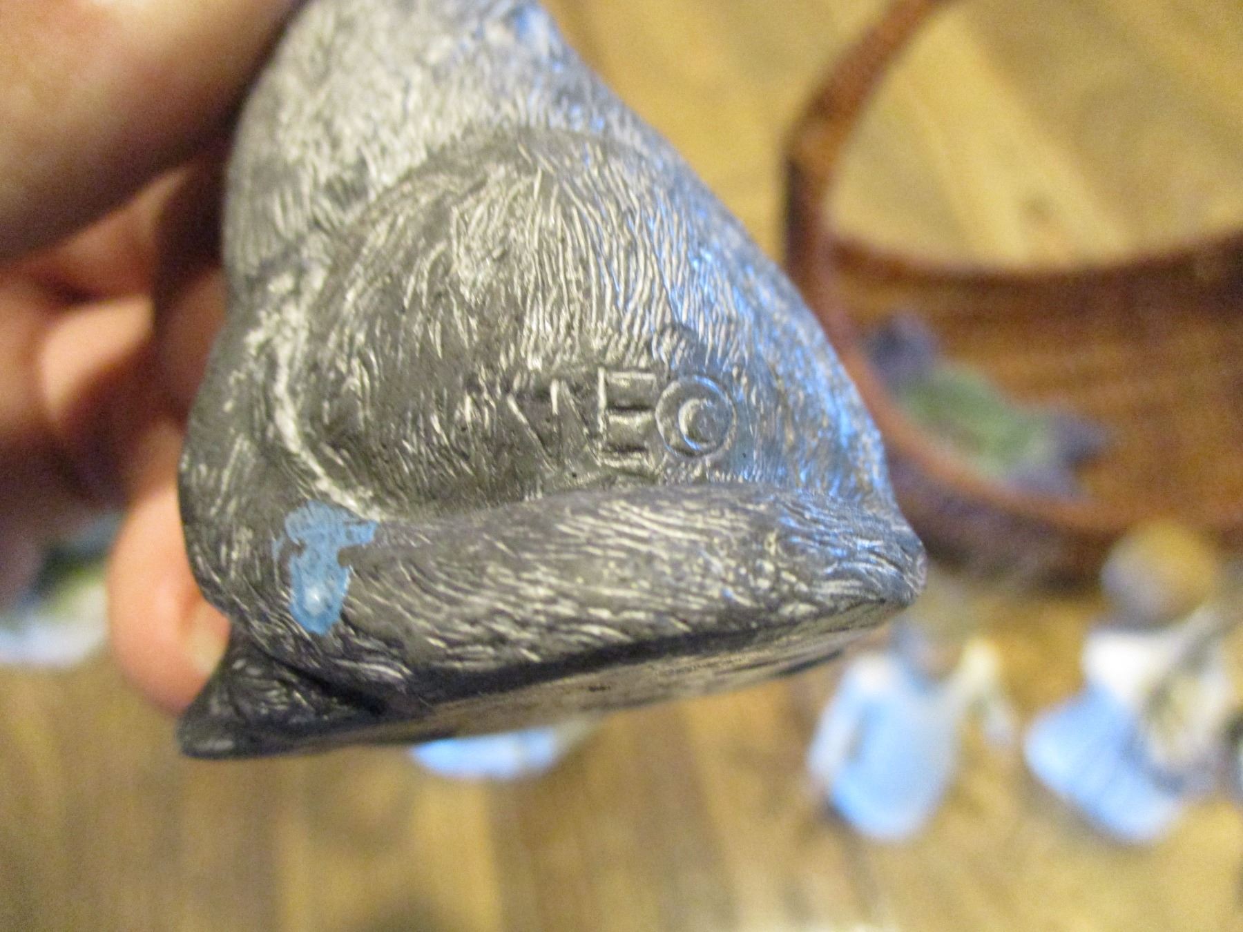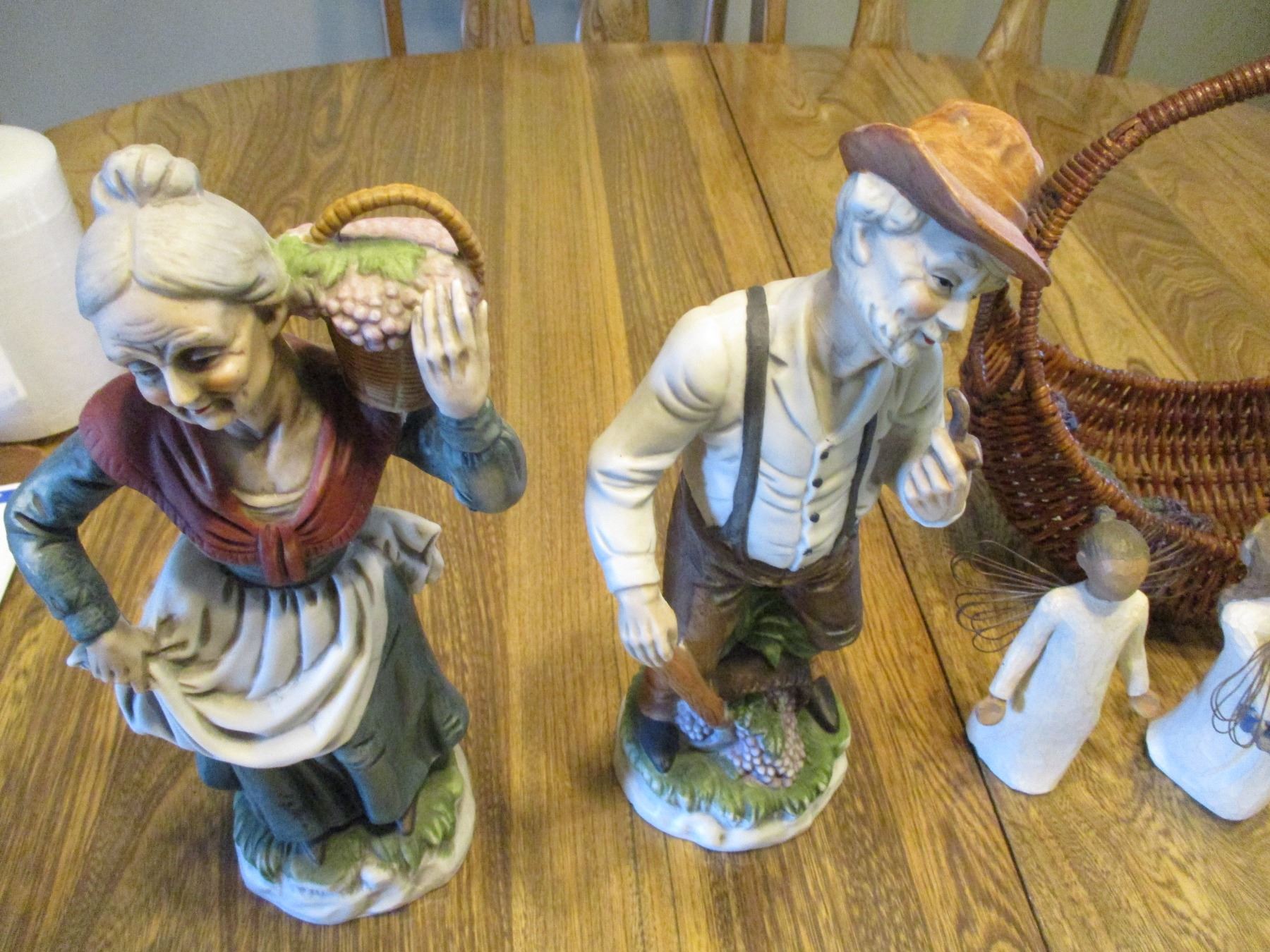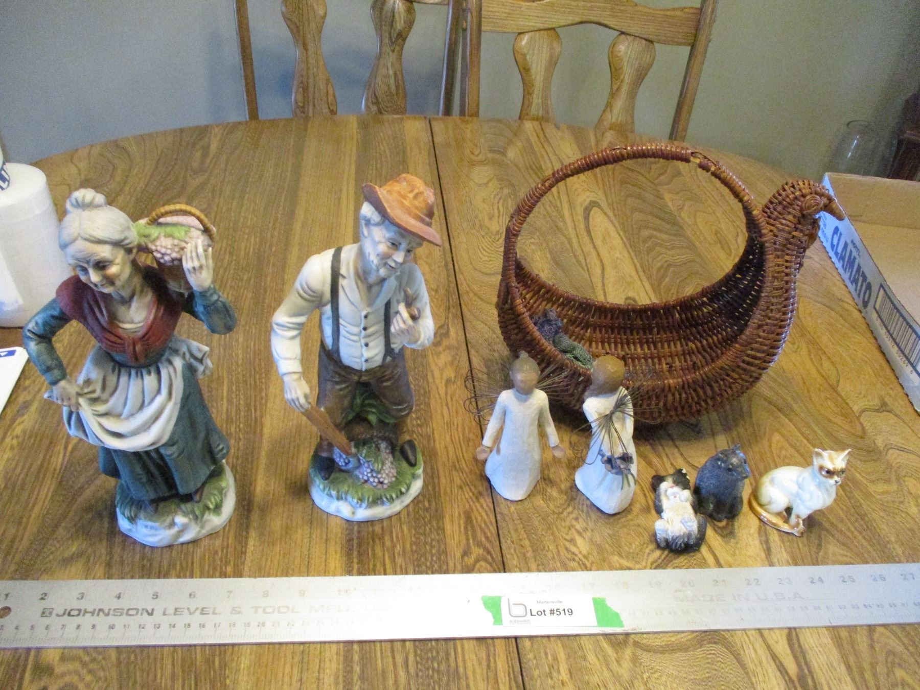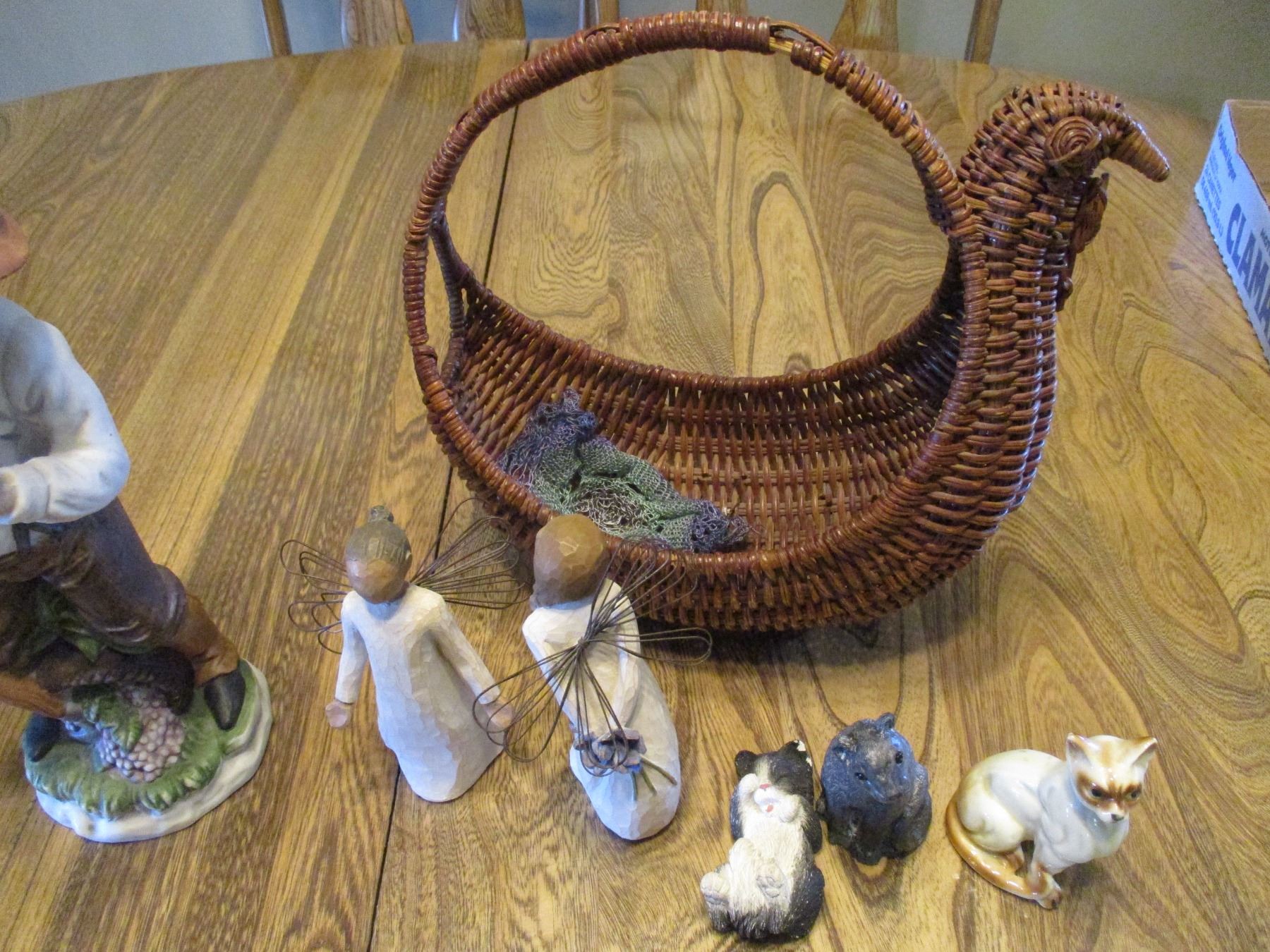 (7) Ceramic/Porcelain Figurines & Woven Chicken Basket