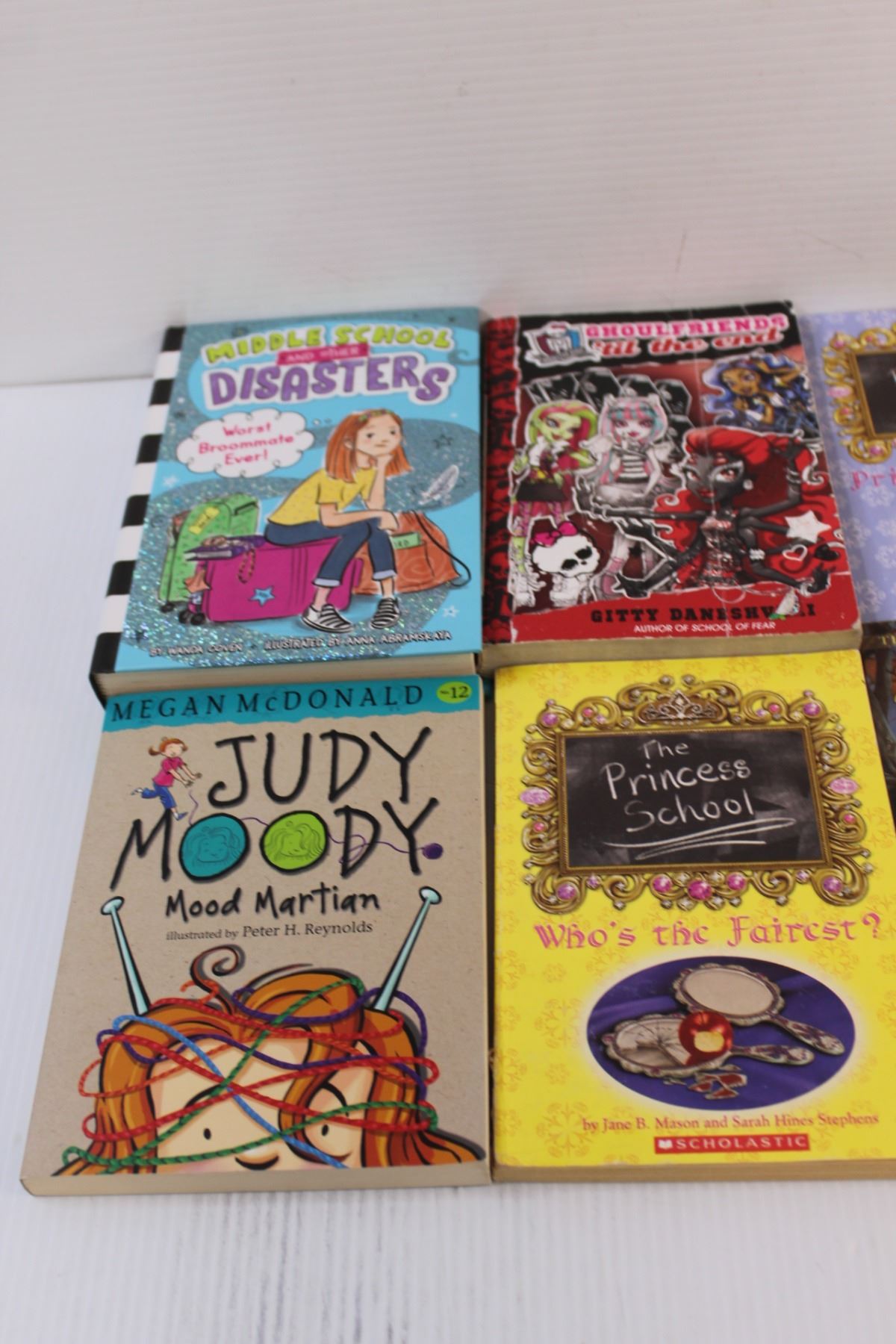 (7) Children's Books: (Girls Lot) Judy Moody, Monster High, Unicorns, Princess, Middle School Disast