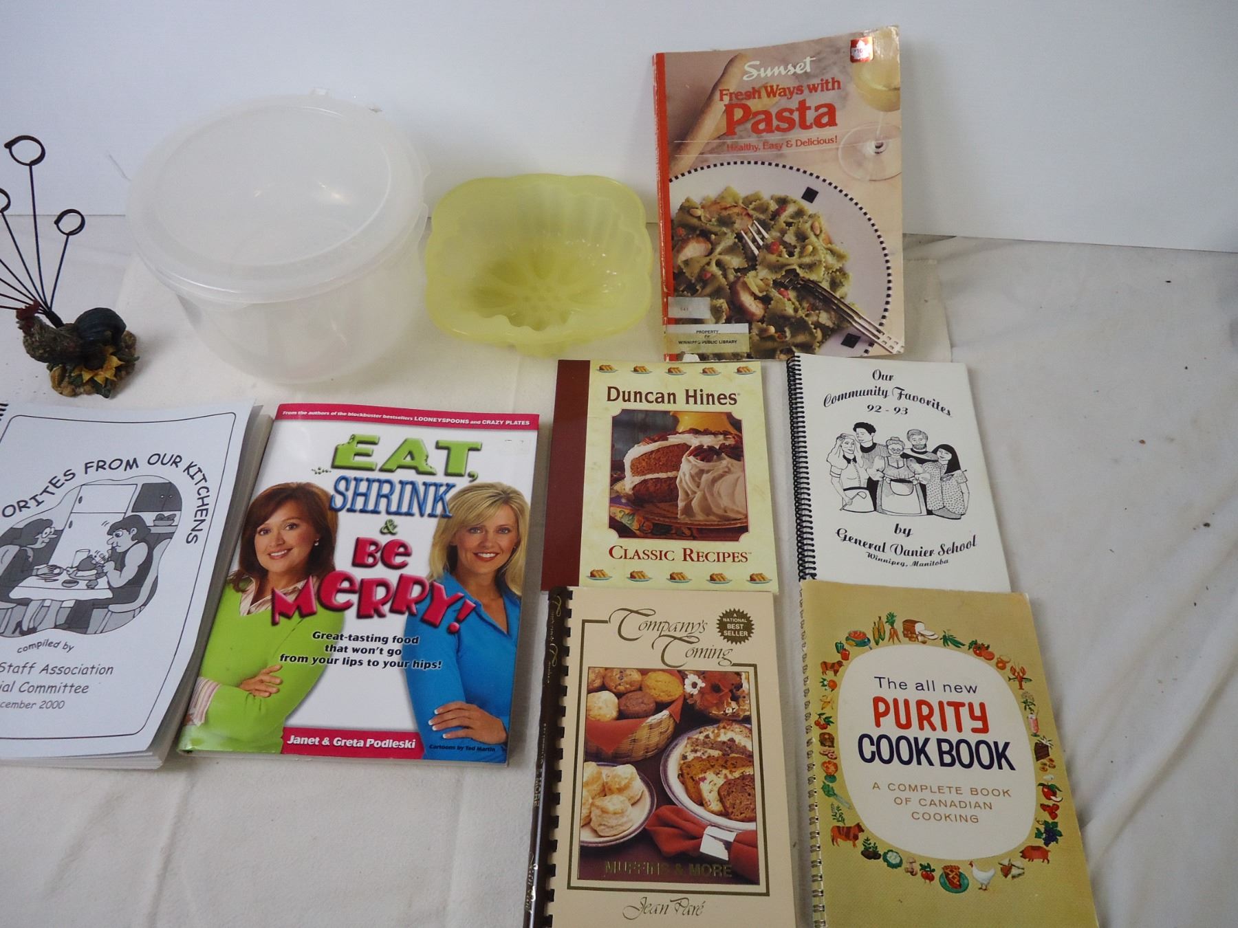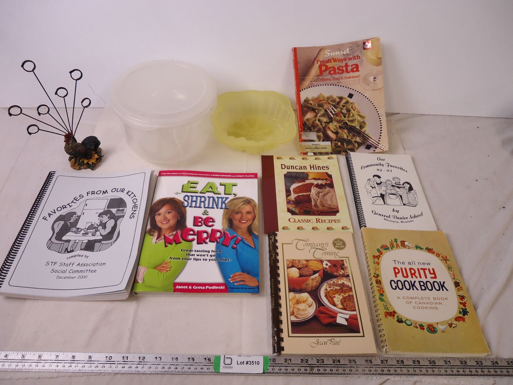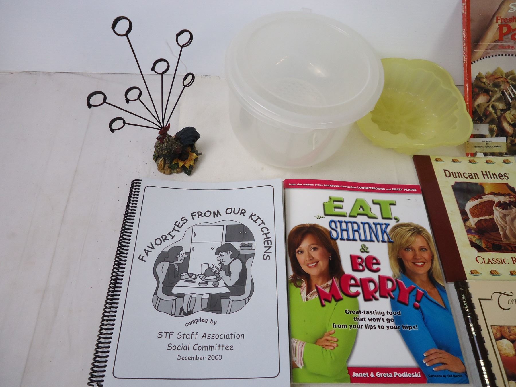 (7) Cookbooks, jello mold, strainer,napkin holder