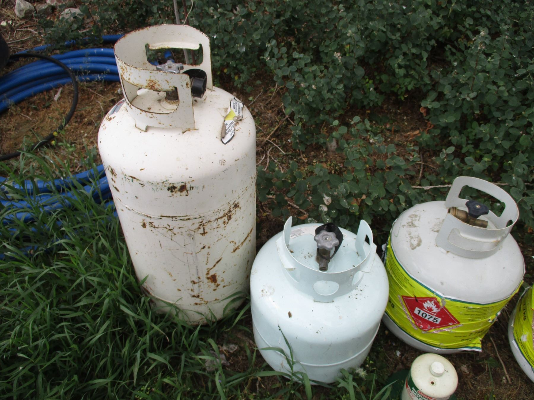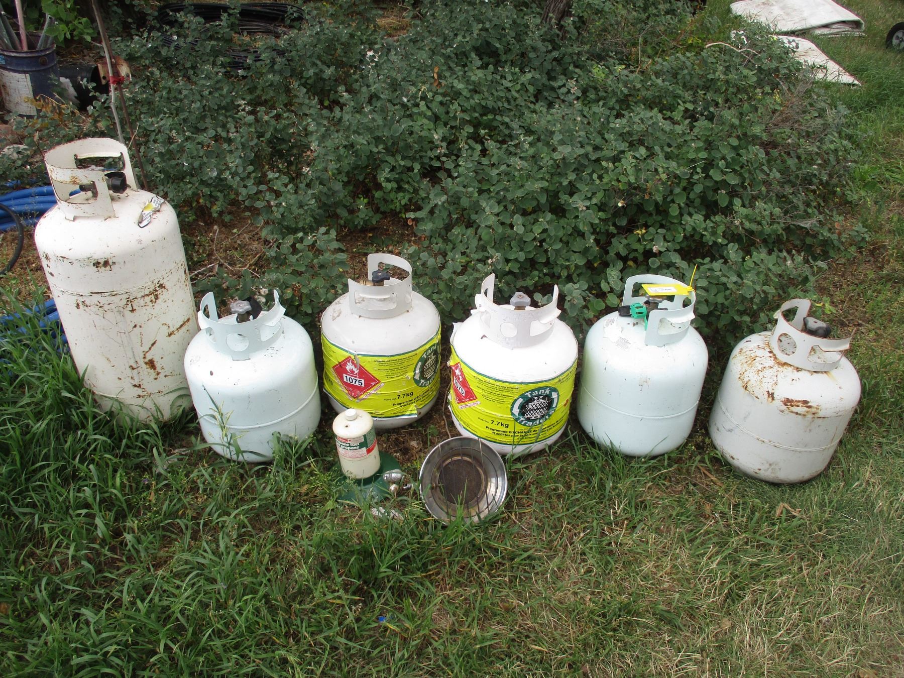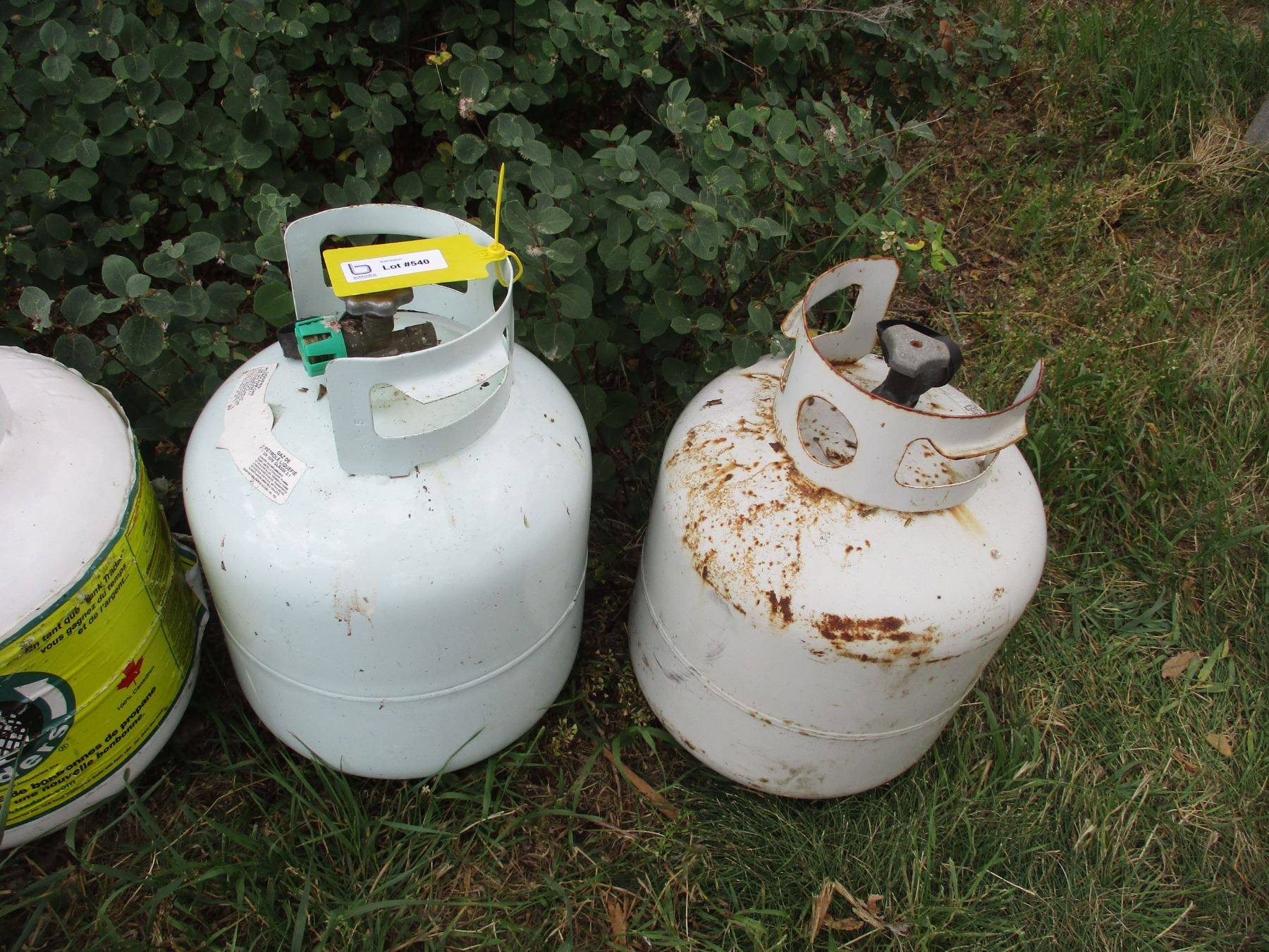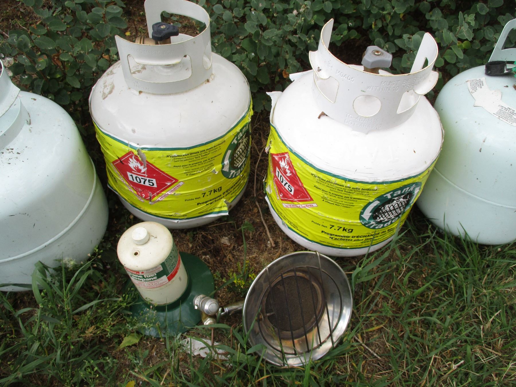 (7) Propane Tanks - 1 Full, Small Propane Heater
