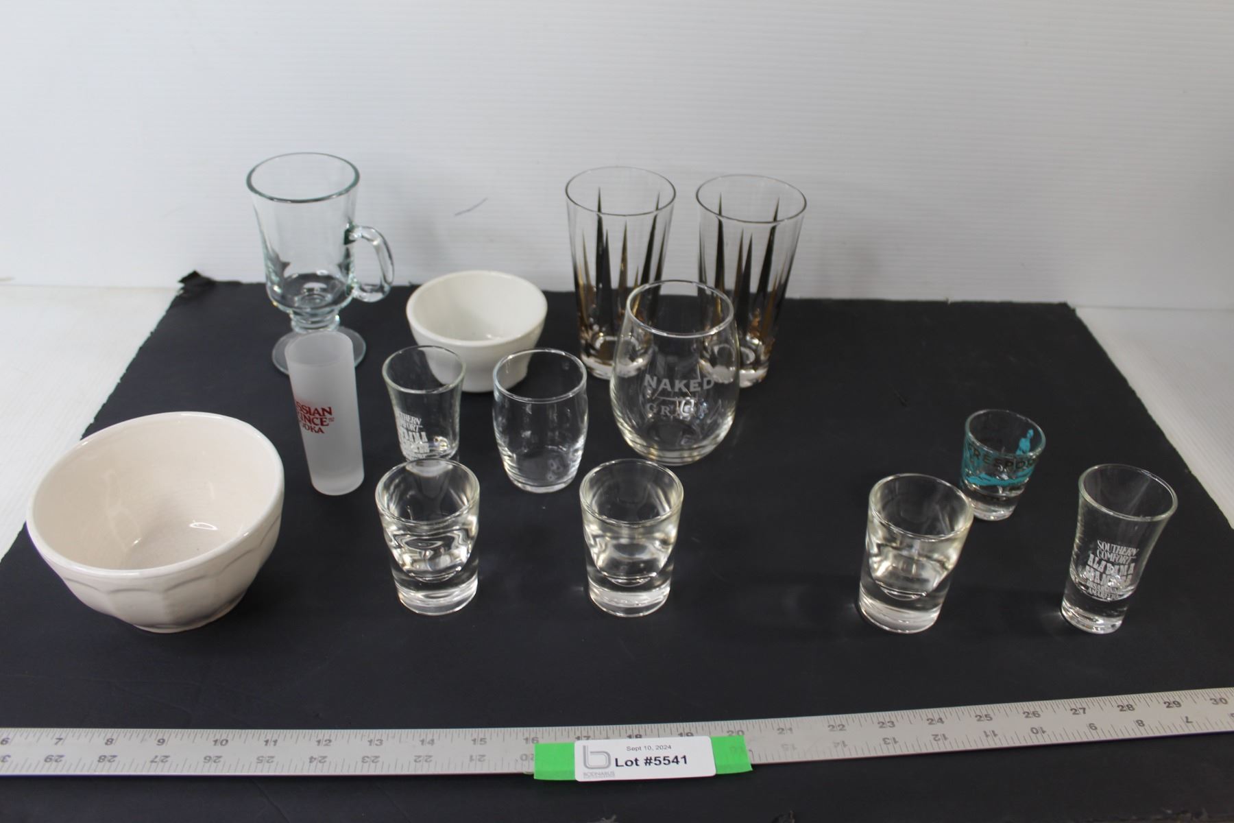(7) Shots Glasses, Wine Glass, (2) Bowls, (3) Cups