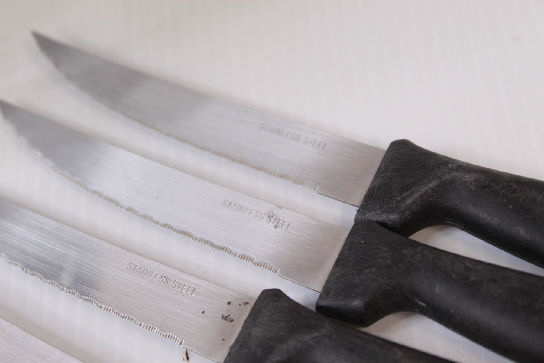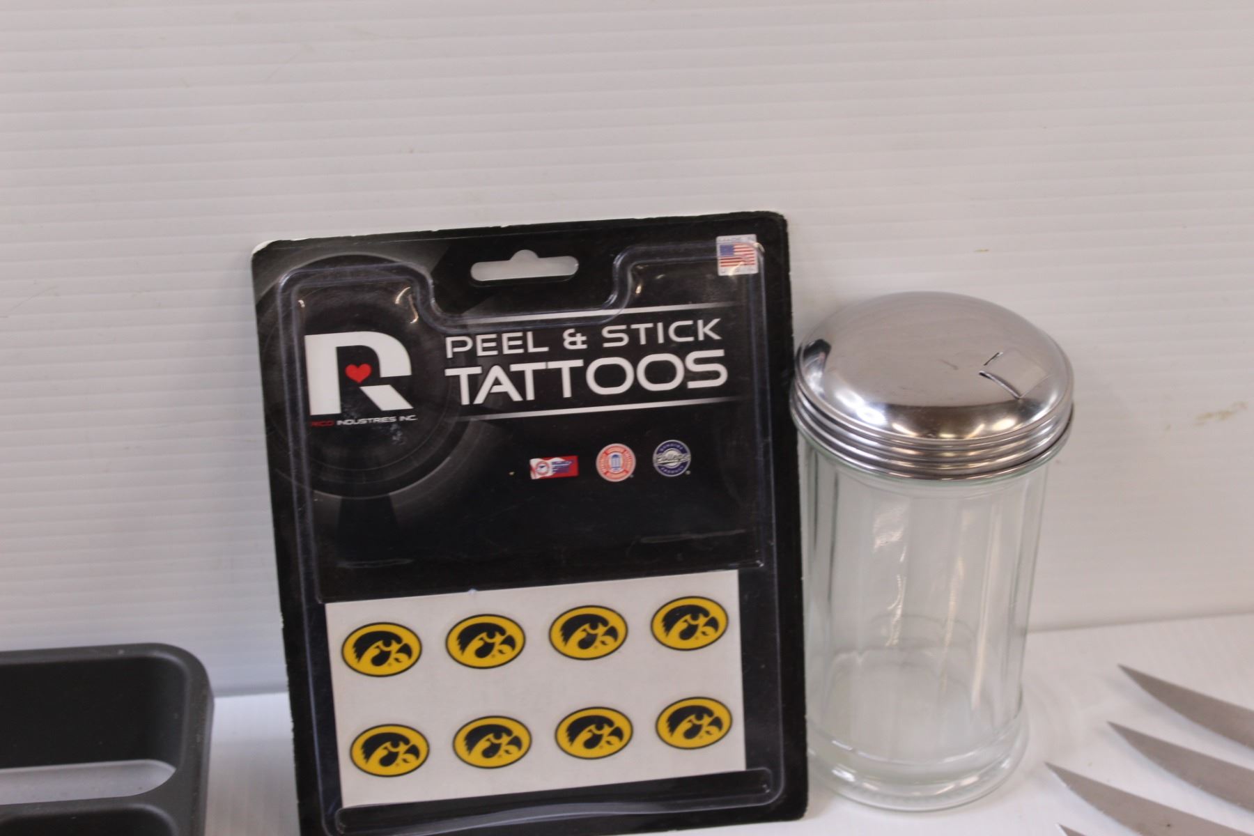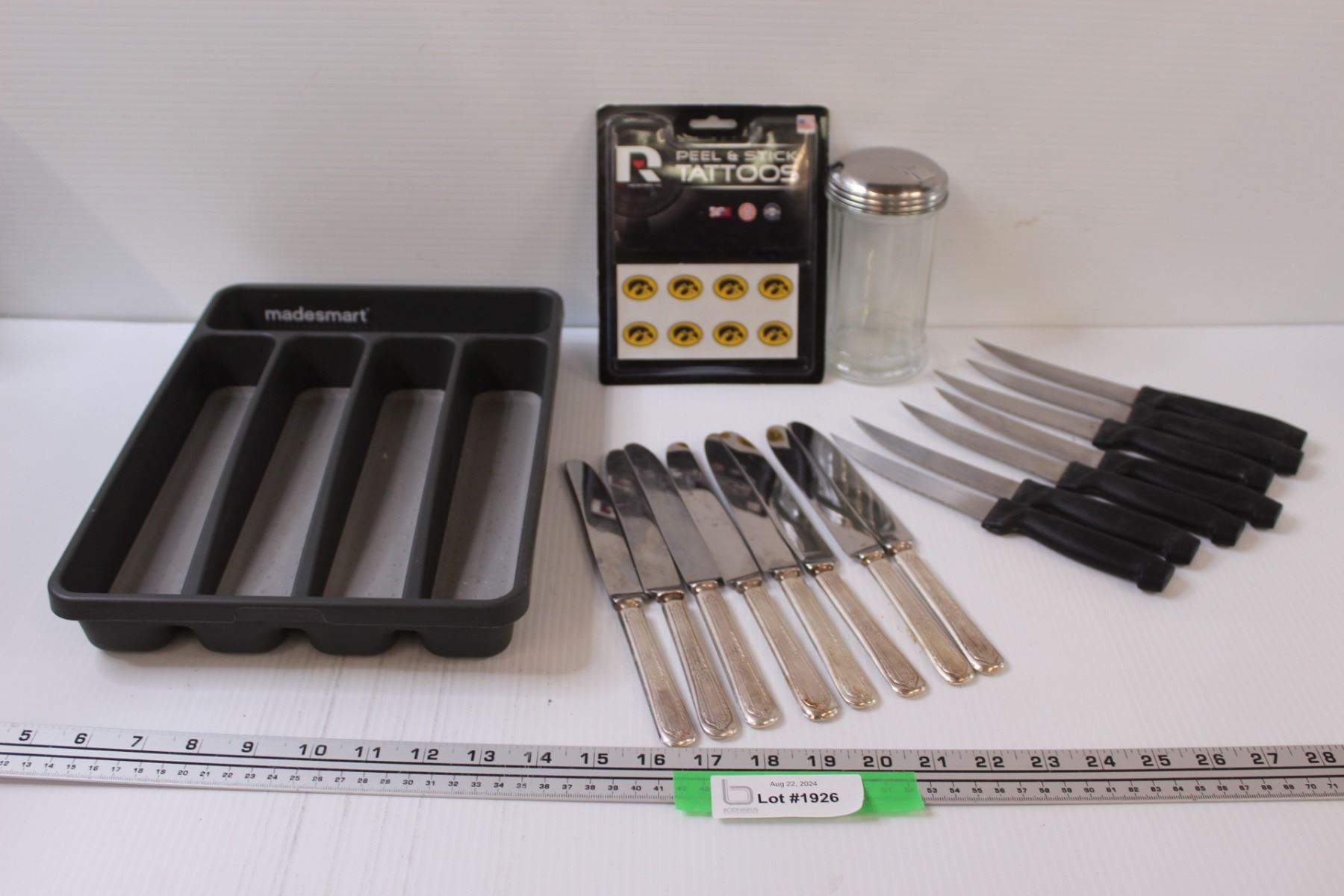 (7) Stainless Steel Steak Knives, (8) WM Rogers Butter Knives, Cutlery Organizer, Sugar Shaker, Peel & Stick Tattoos