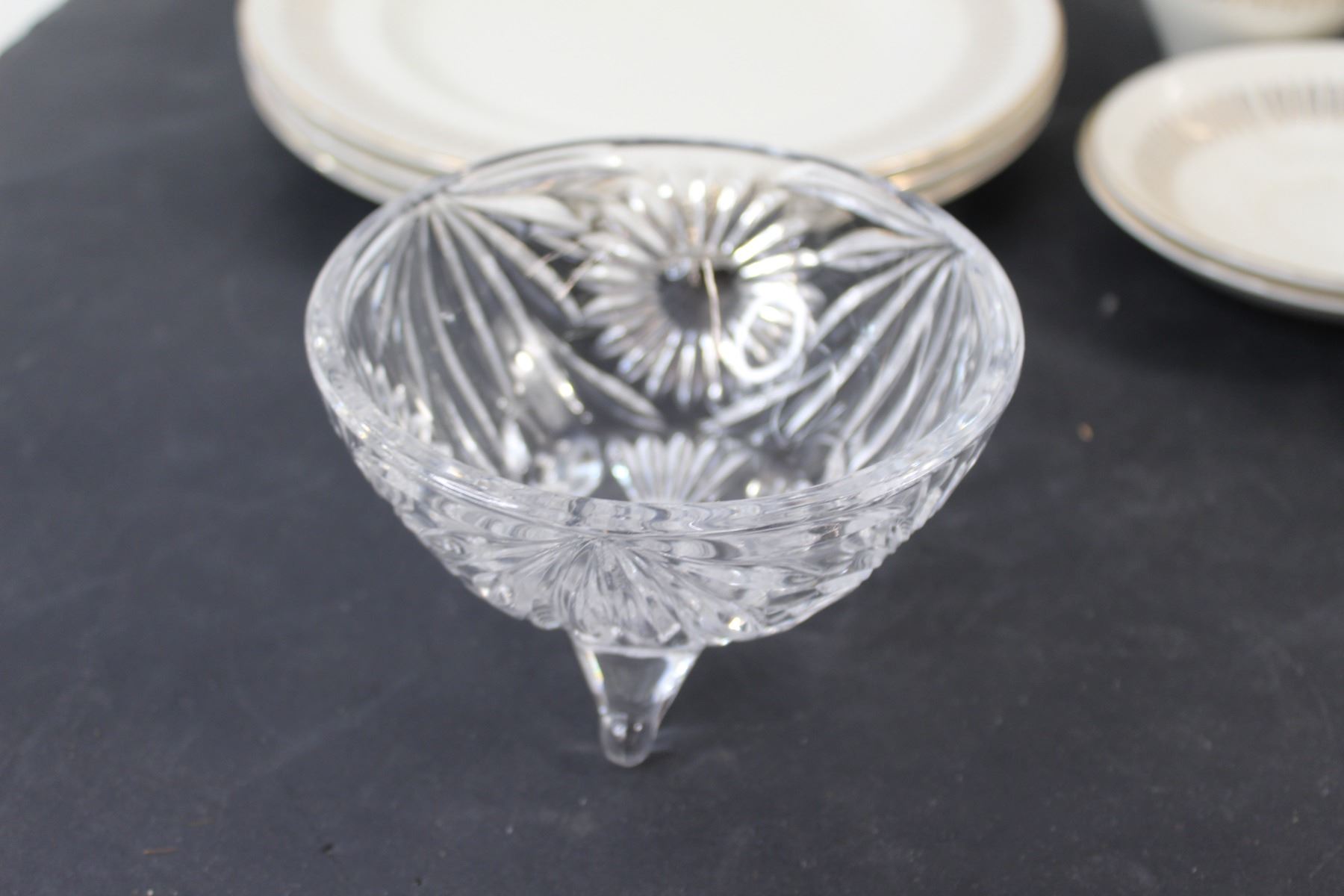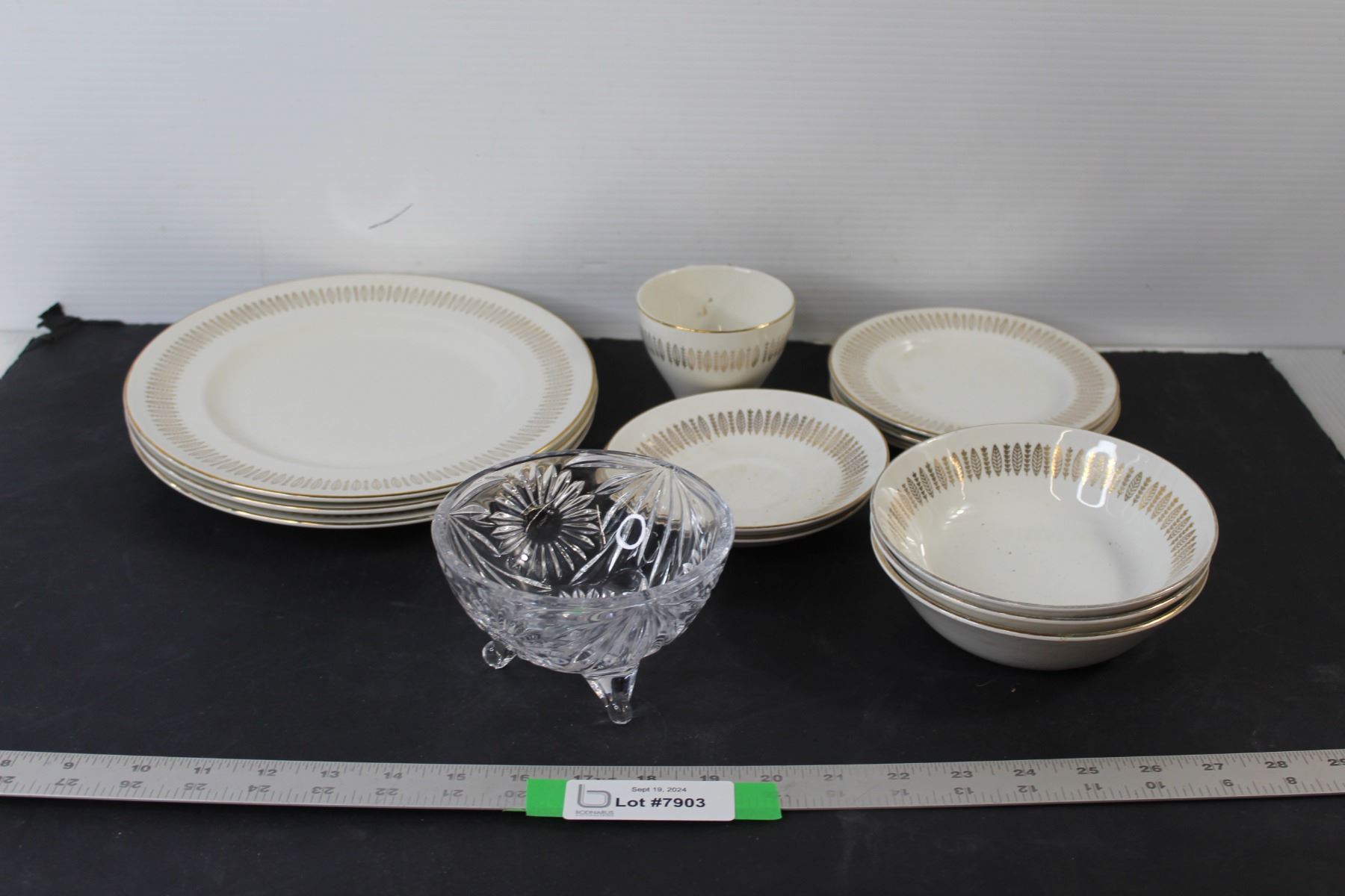 Glass Candy Dish, (3) Bowls, (2) Saucers, Teacup, (3) Small Plates, (3) Plates