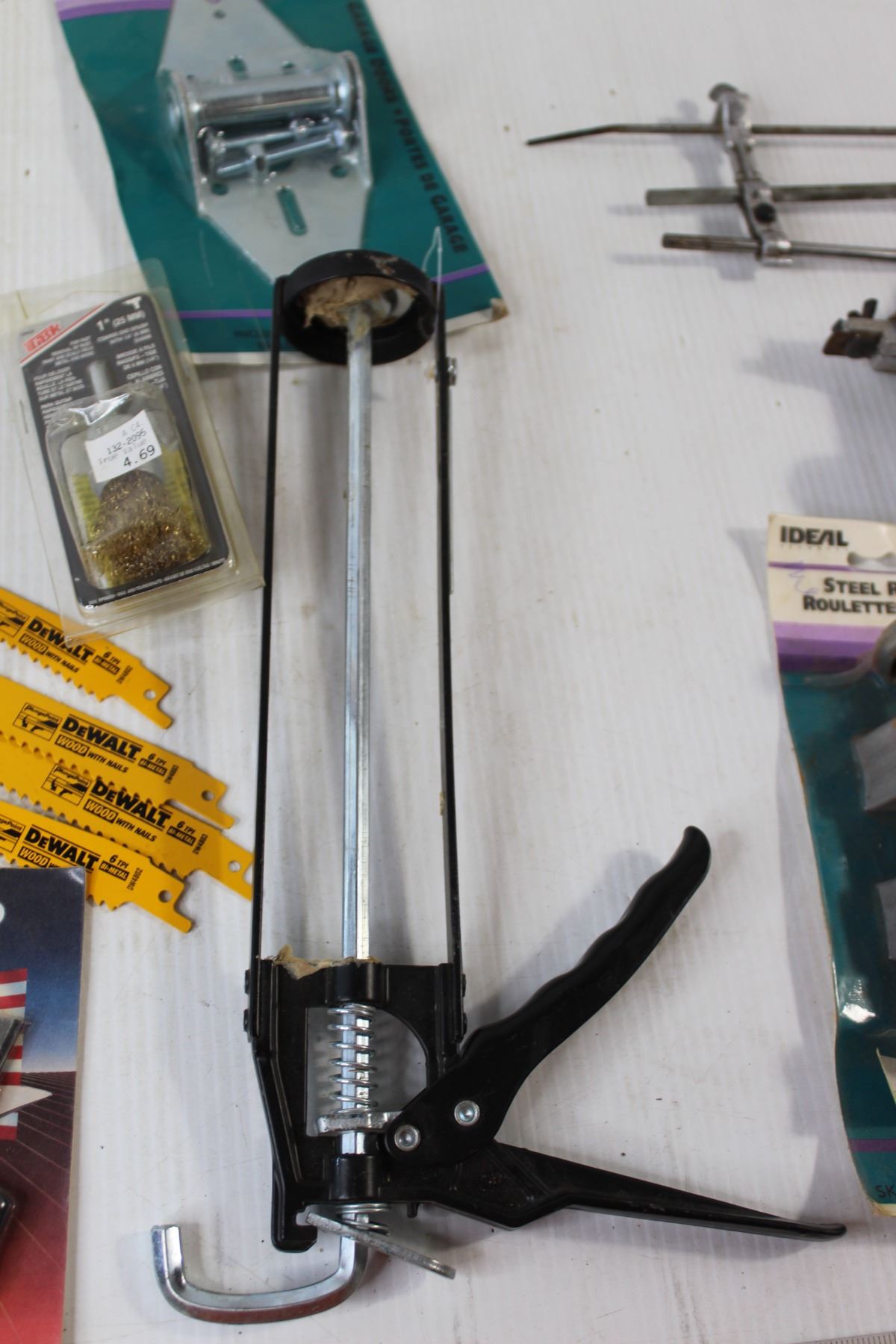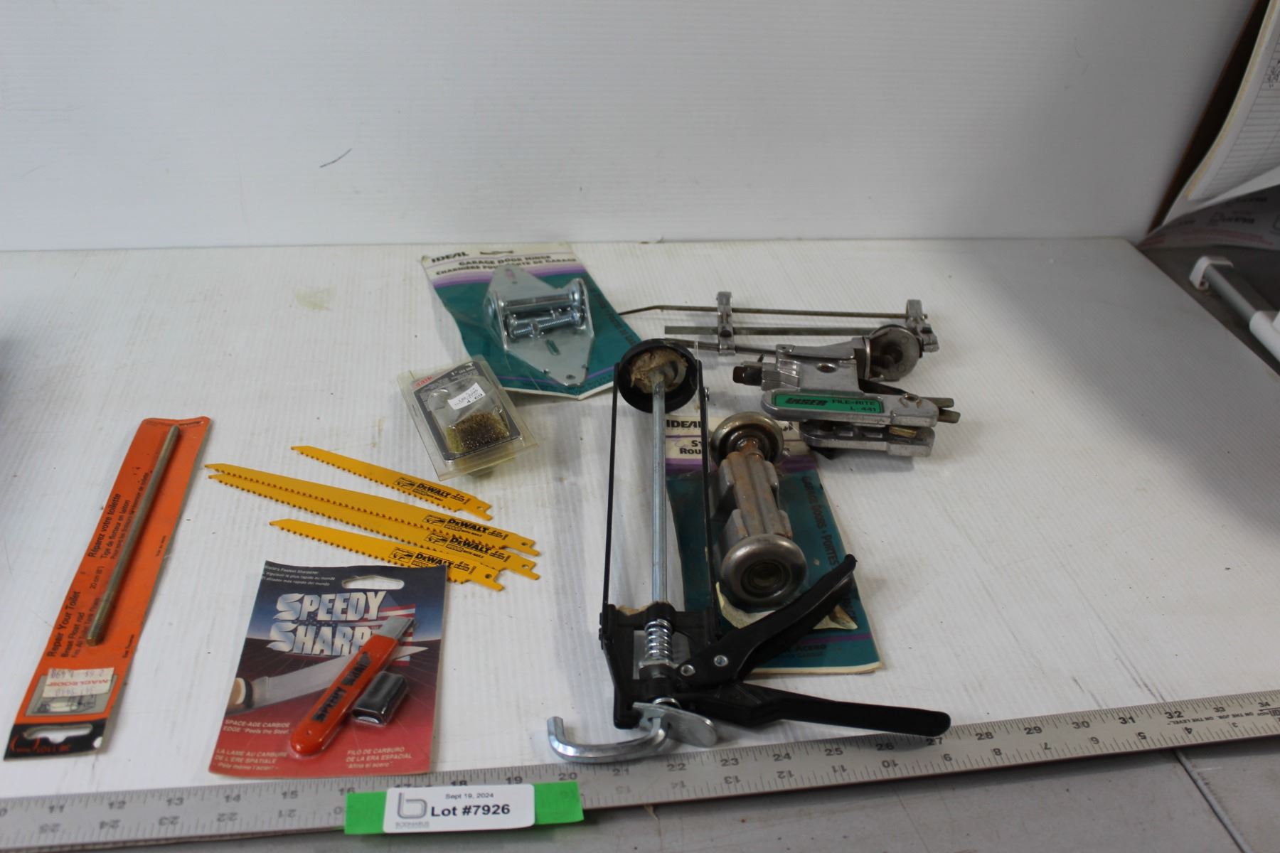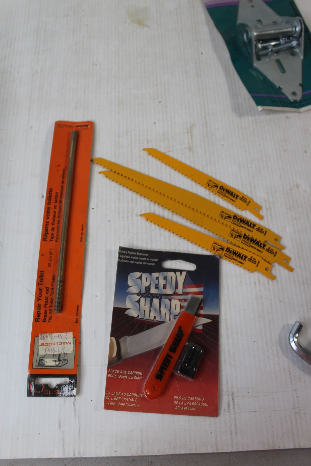 (4) DeWalt Saw Blades, Caulk Gun, Laser File-Rite, Garage Door Hinge, Drill Coarse End Brush, Speedy Sharp, Toilet Brass Float Rod, Steel Rollers