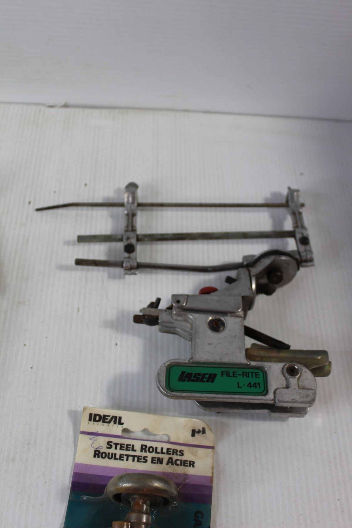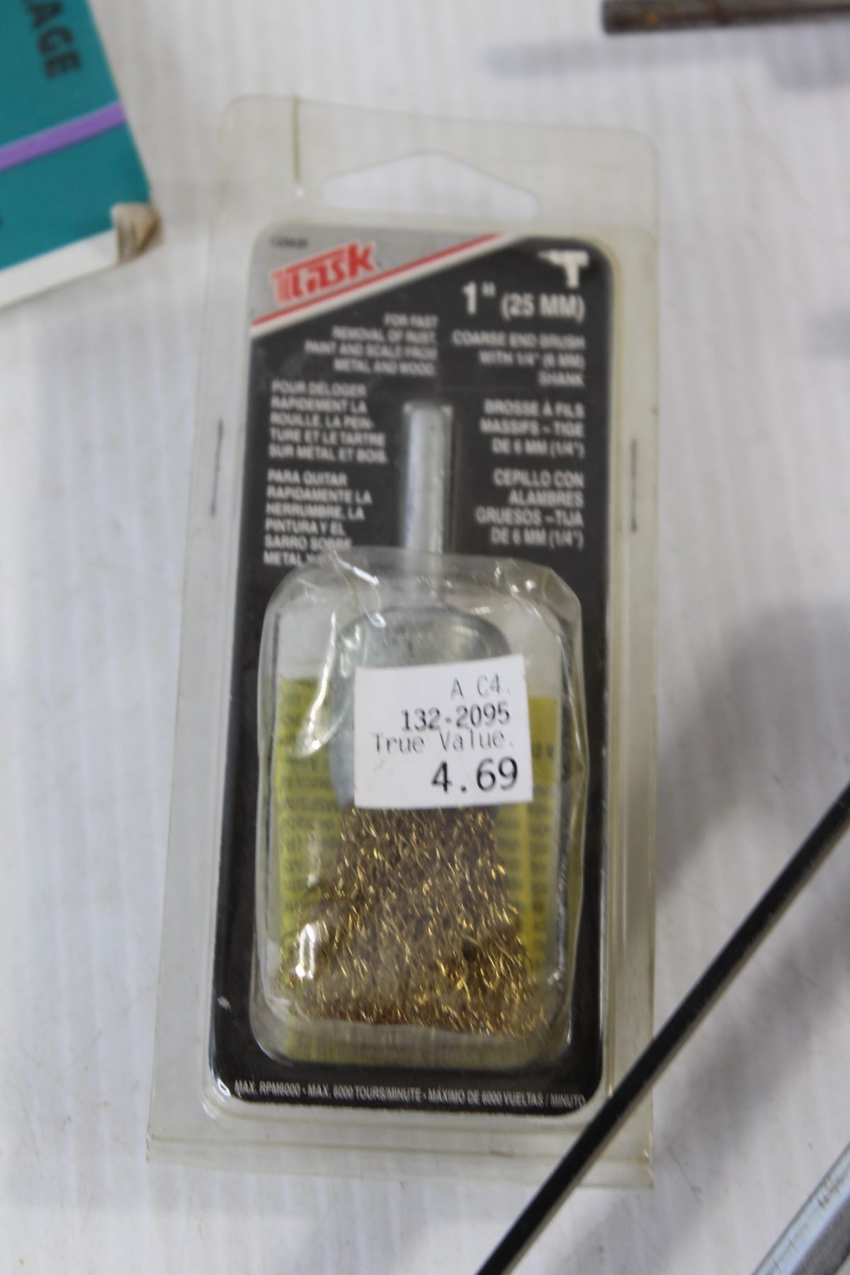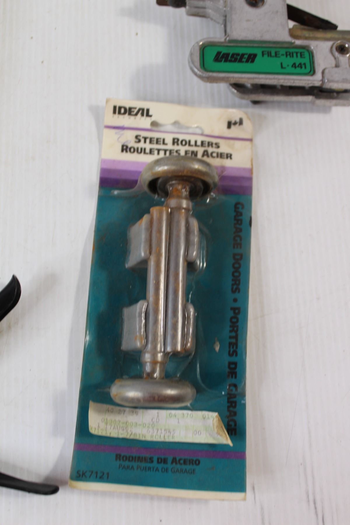 (4) DeWalt Saw Blades, Caulk Gun, Laser File-Rite, Garage Door Hinge, Drill Coarse End Brush, Speedy Sharp, Toilet Brass Float Rod, Steel Rollers