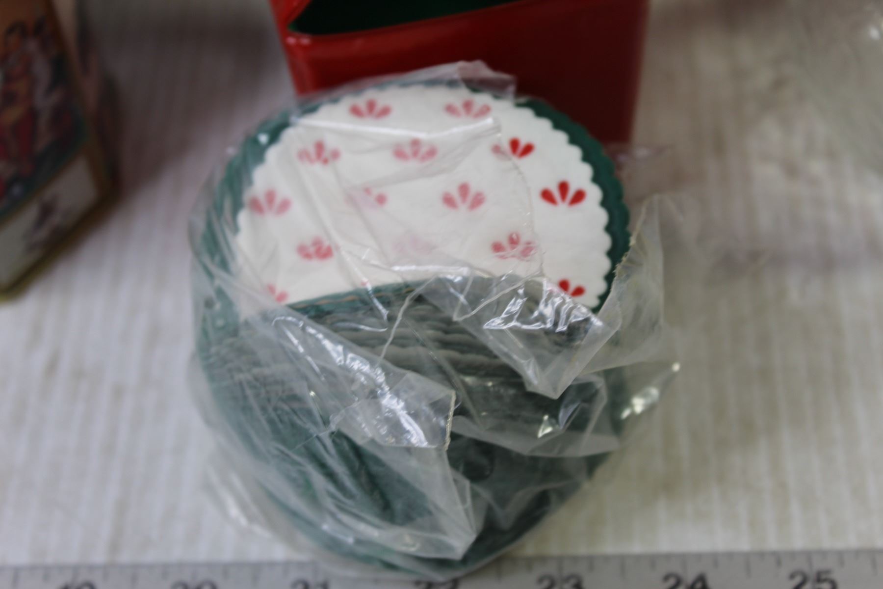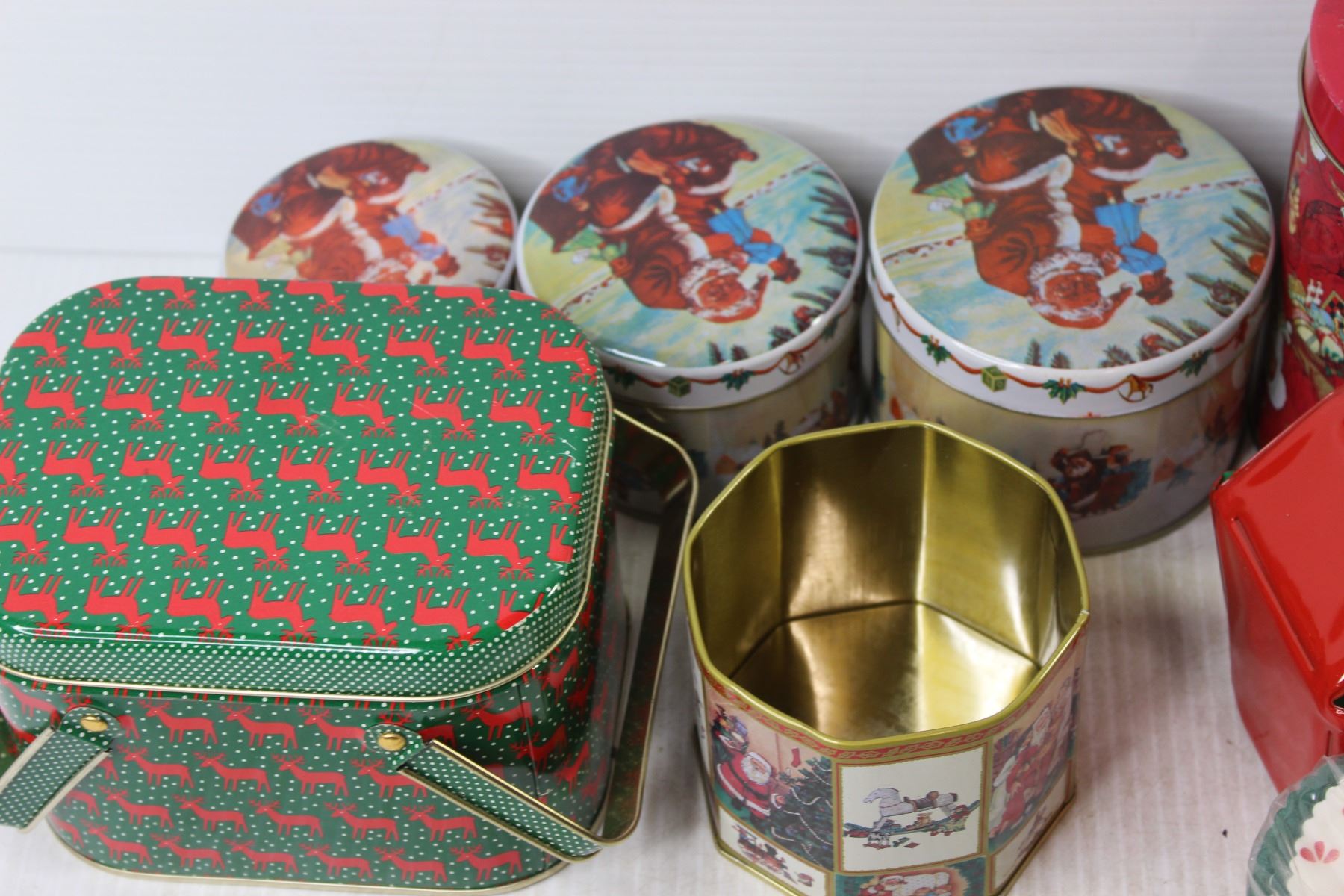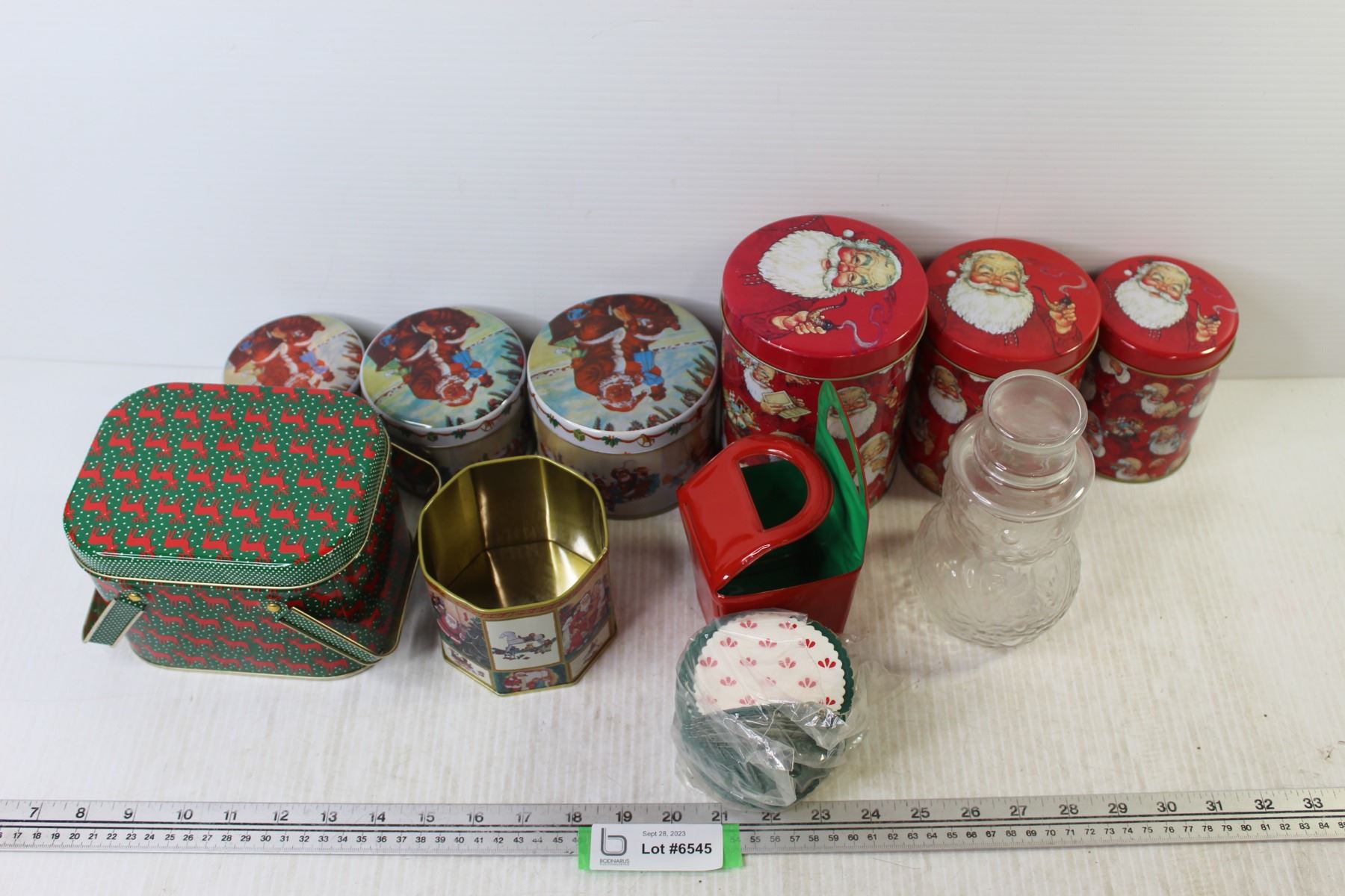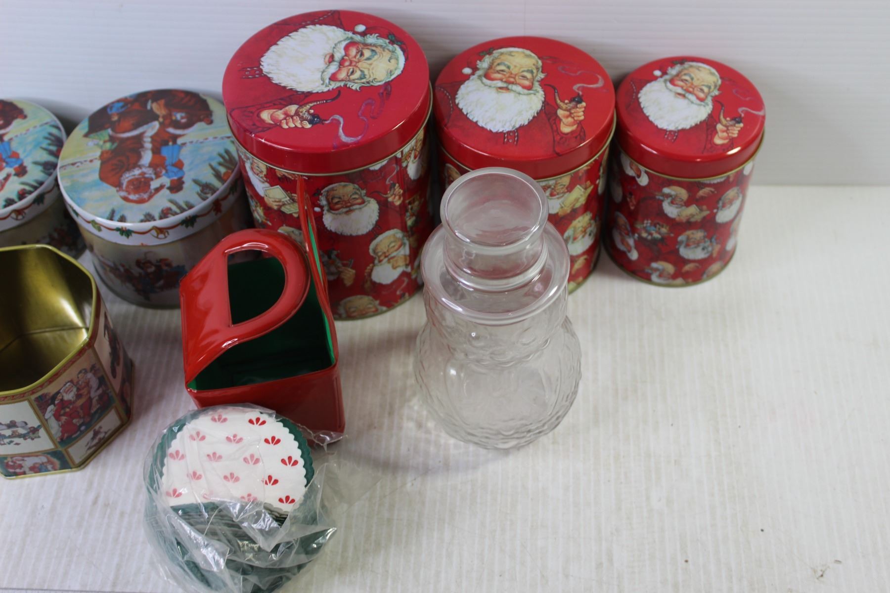 (8) Christmas Tins (1) without Lid + Coasters + Snowman Glass