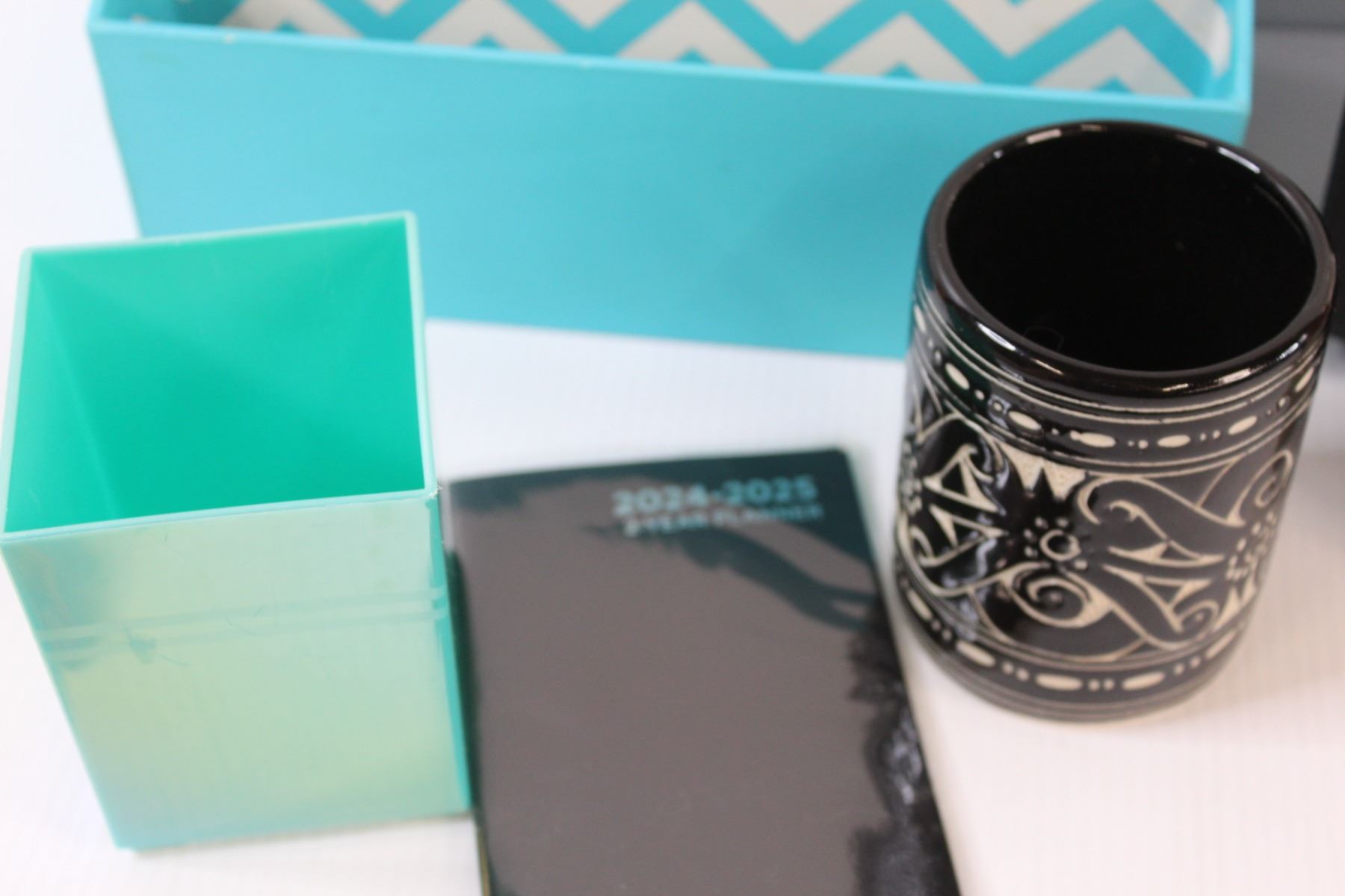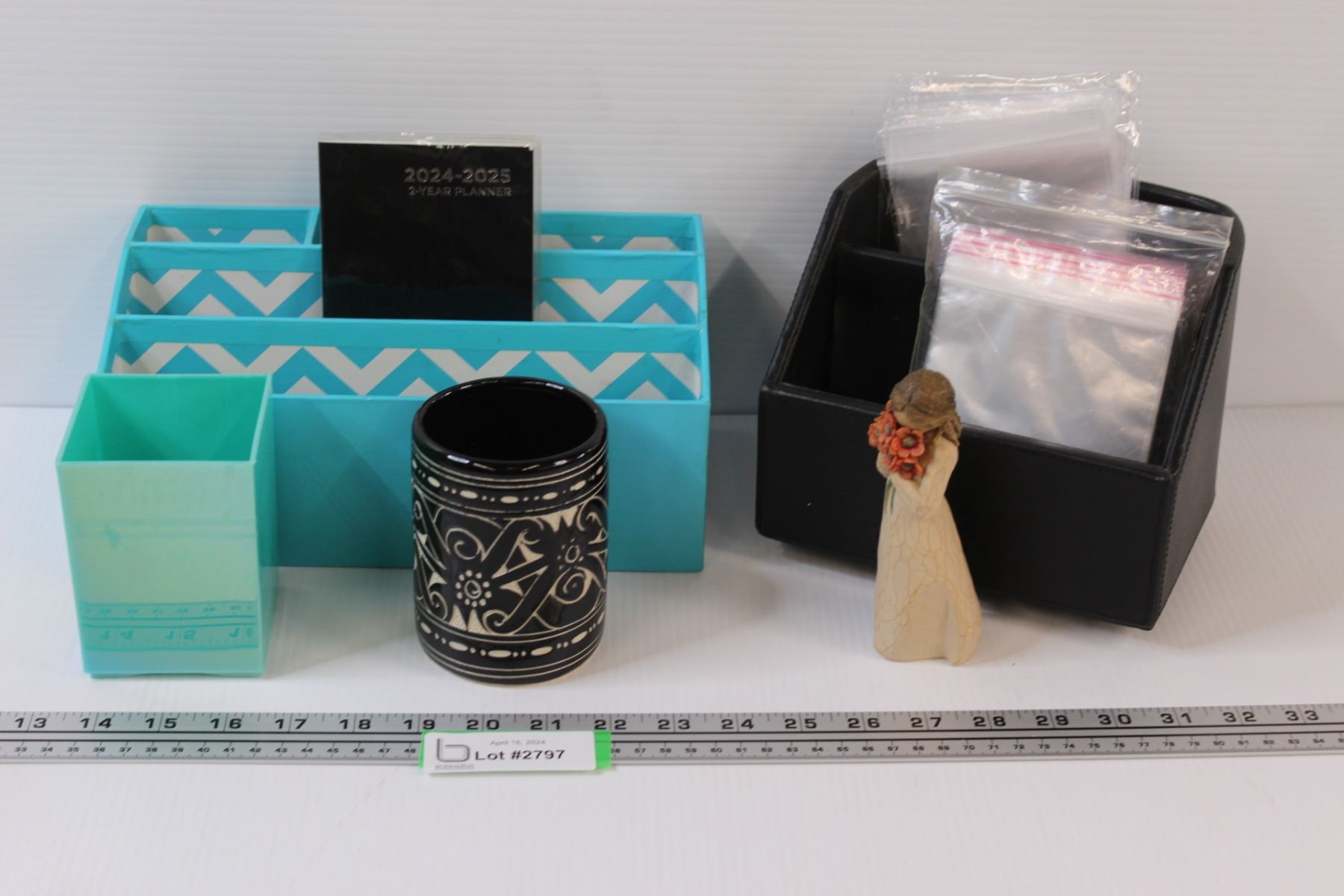 (8) Lot of Misc. Items: 2 - Storage Caddies; Plastic storage bags; Figurine; Pen Mug