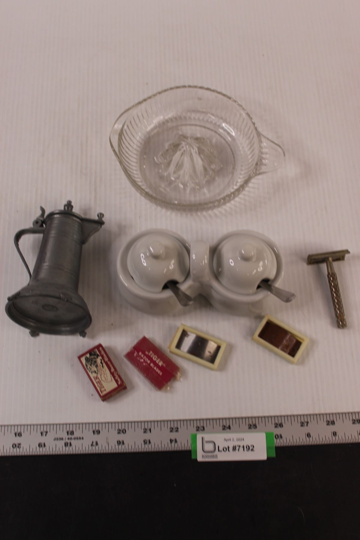 (8) misc. items (straight razor, blades, lemon juicer dish, etc.)