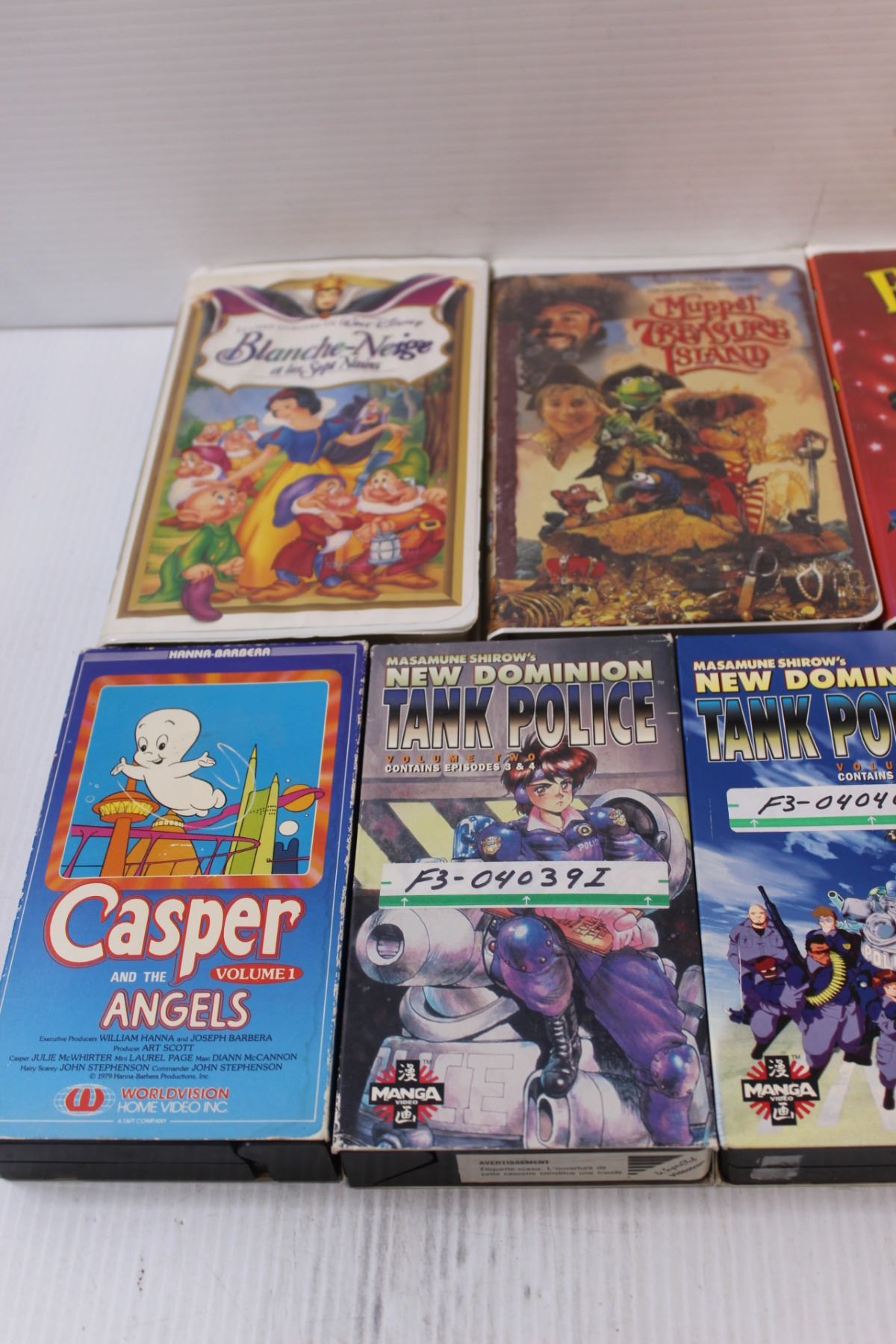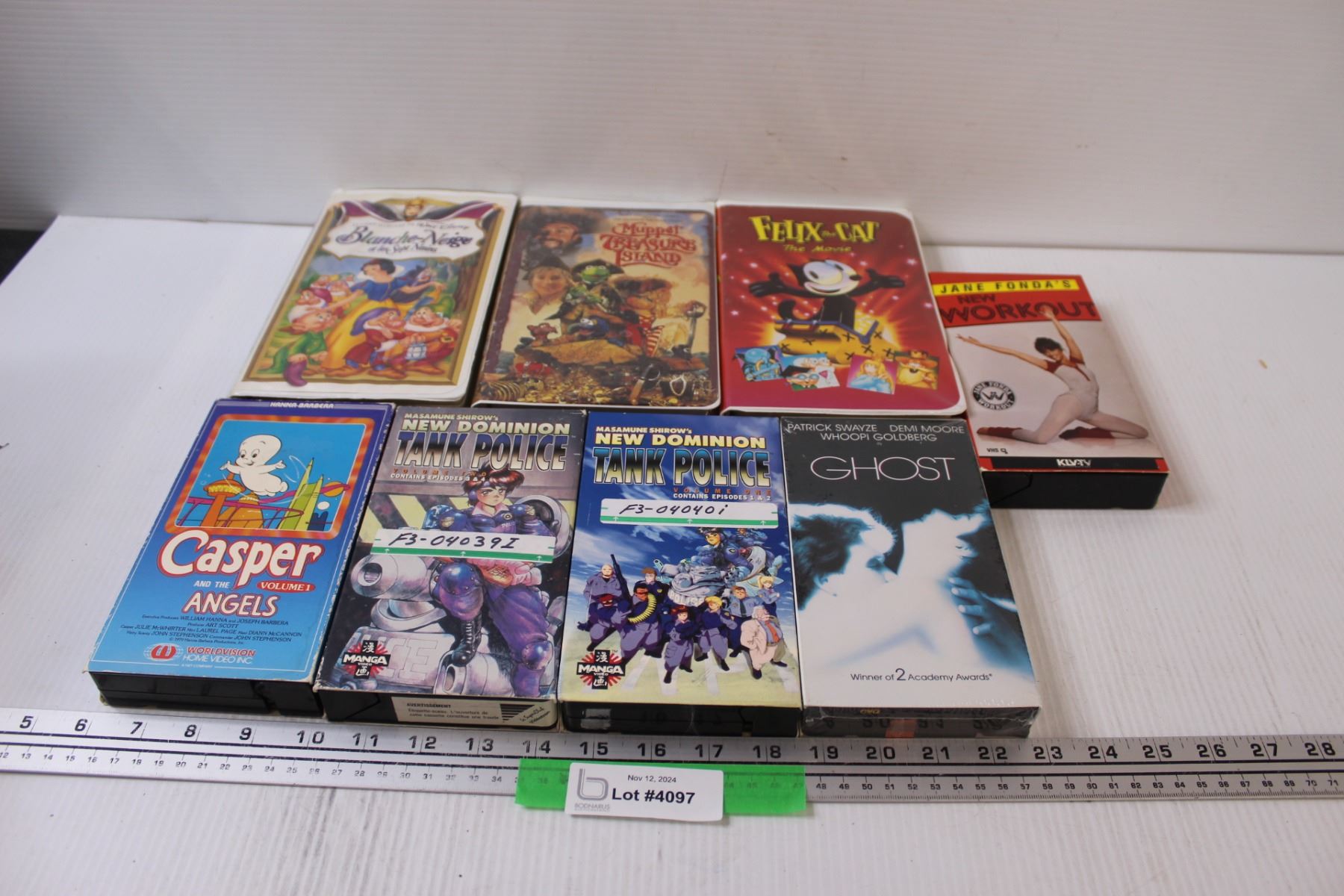 (8) VHS: Jane Fonda, Ghost, French Snow White, Muppet Treasure Island, Casper, Tank Police, Misc.