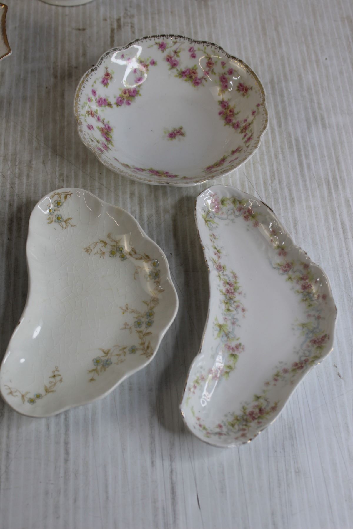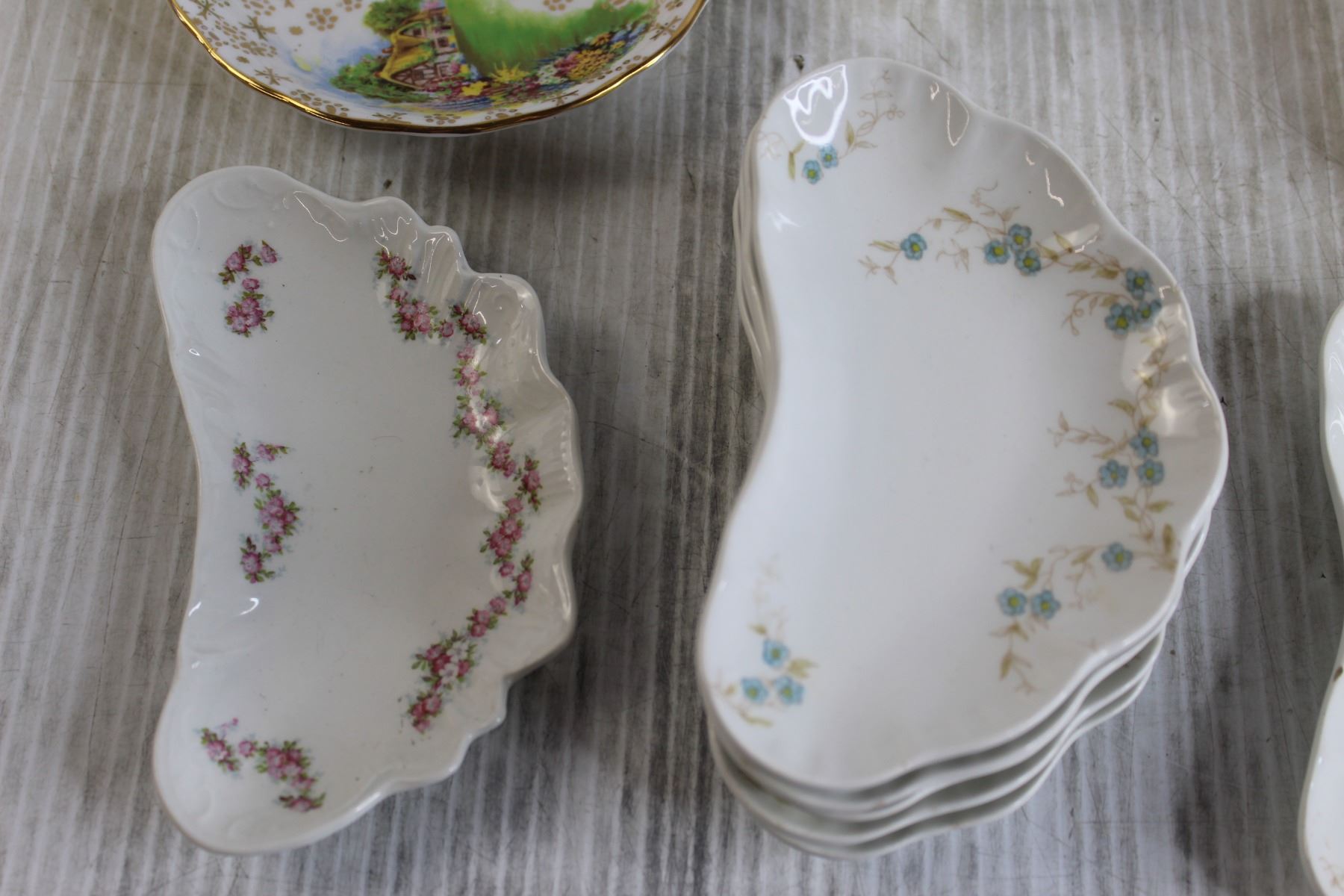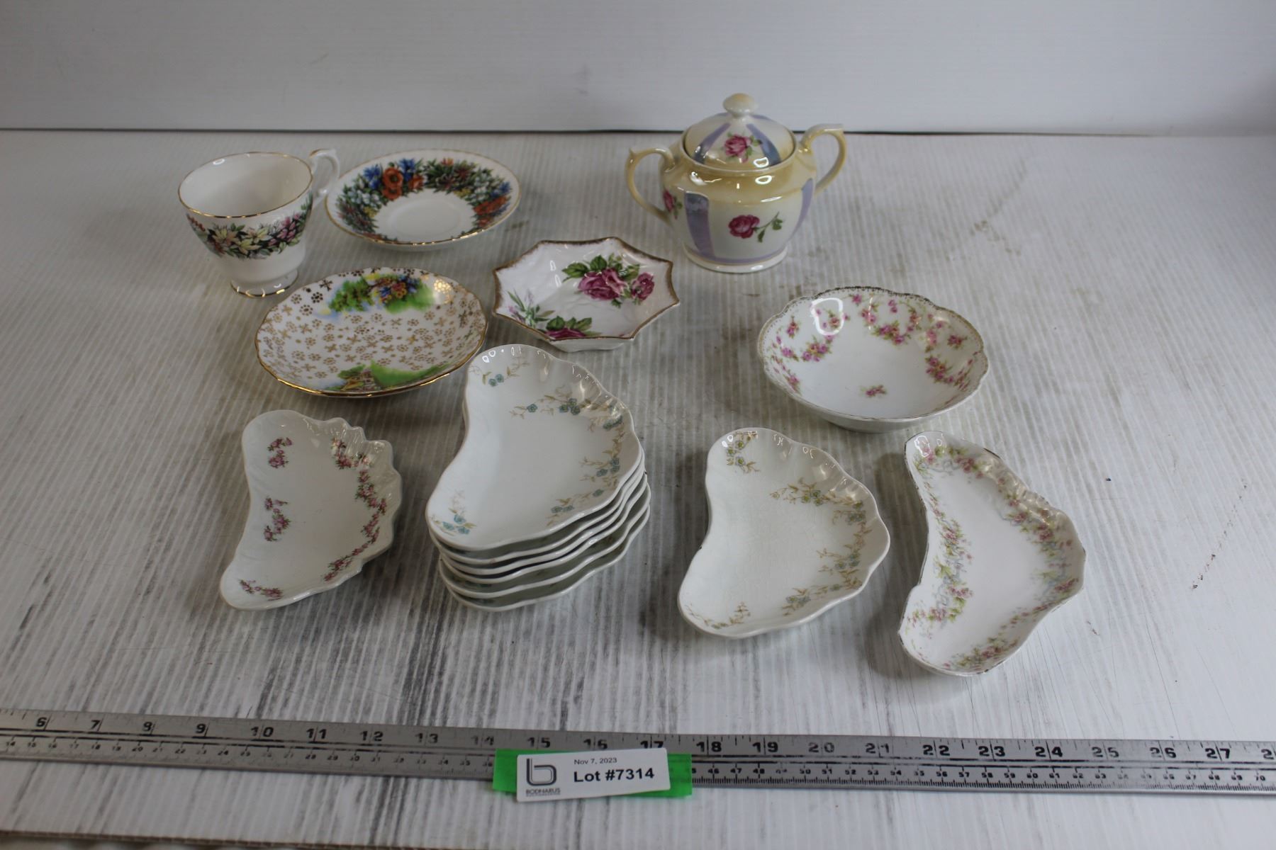 (9) Bone Dishes, (4) Small Bowls/Saucers, Teacup, Sugar Holder