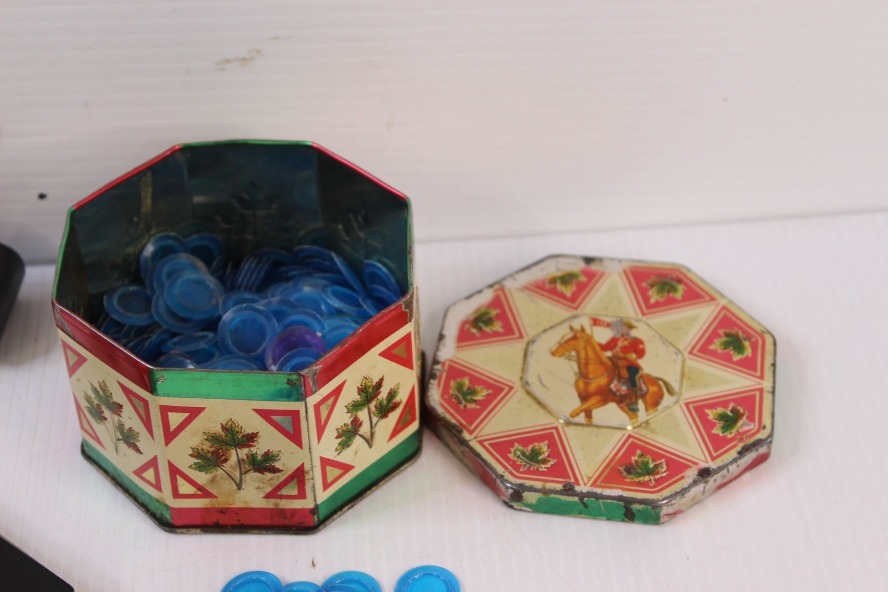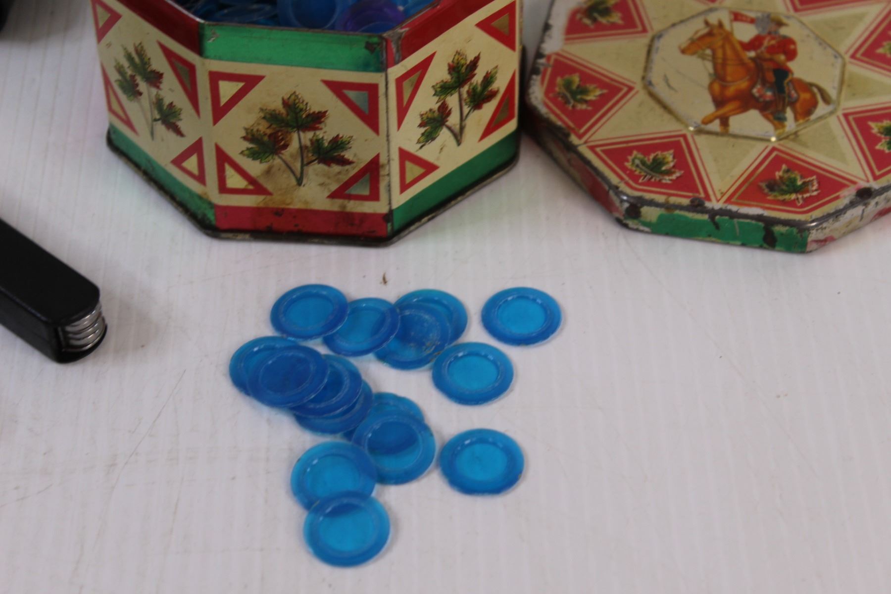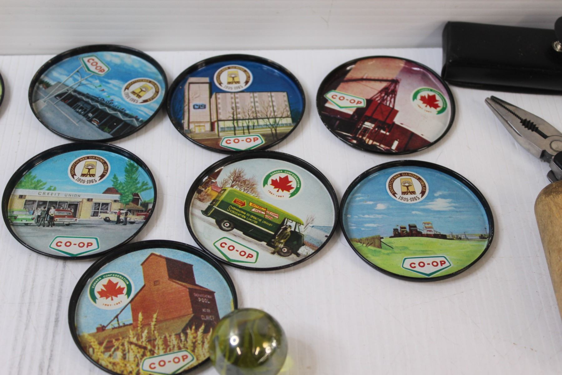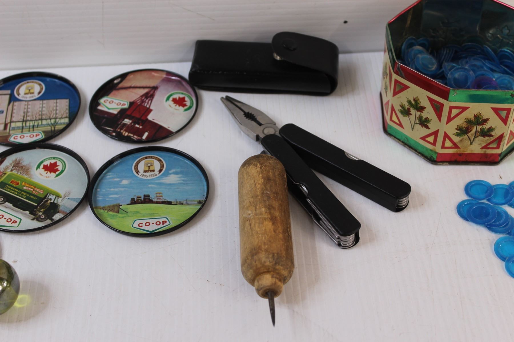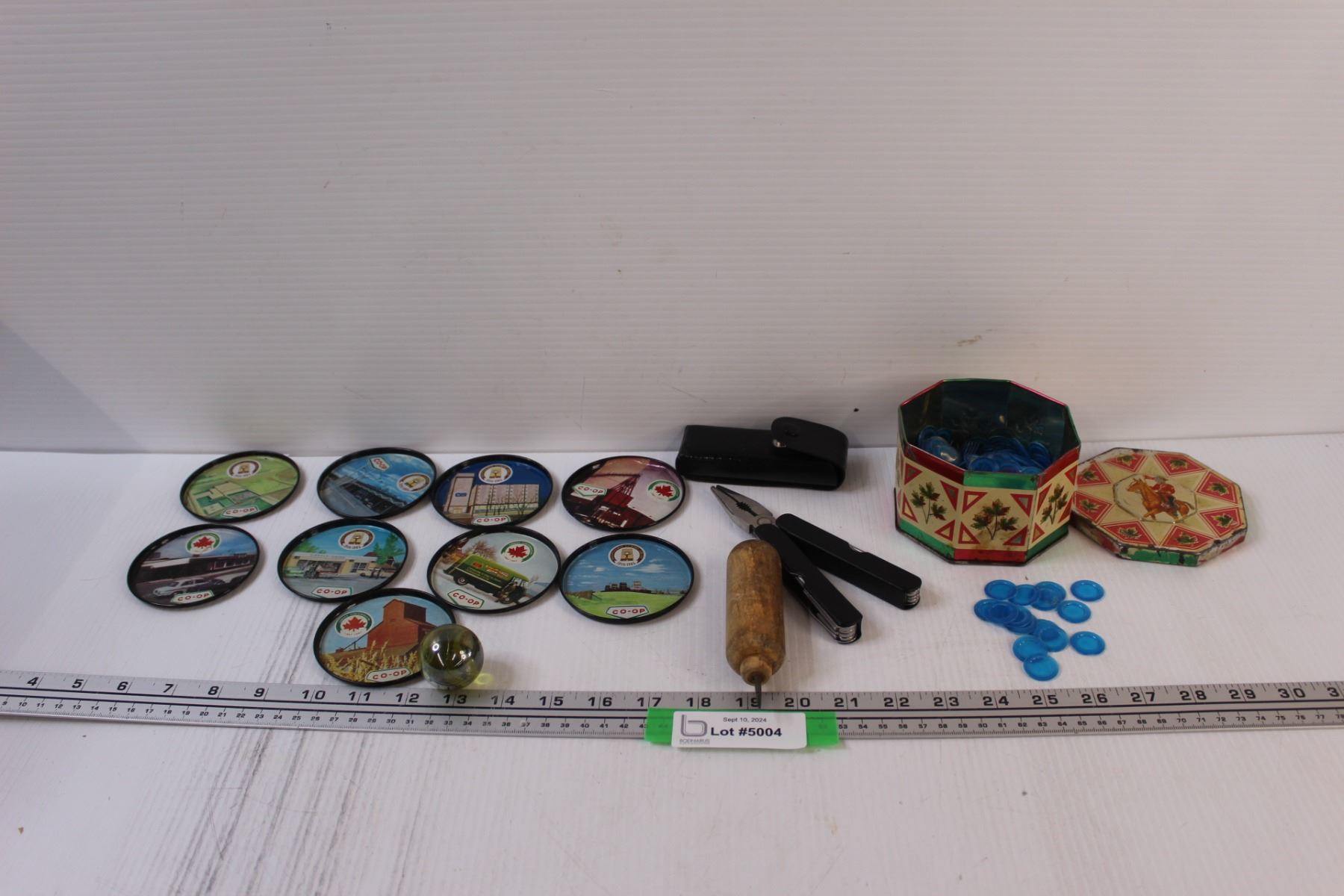 (9) Co-op Vintage Coasters, Utility Folding Knife in Holster, Blue Chips in Vintage Tin, Marble Shooter