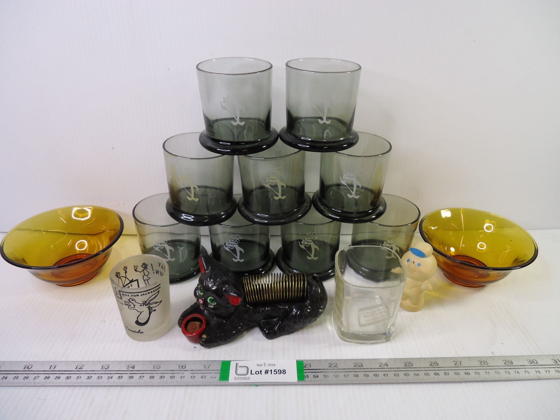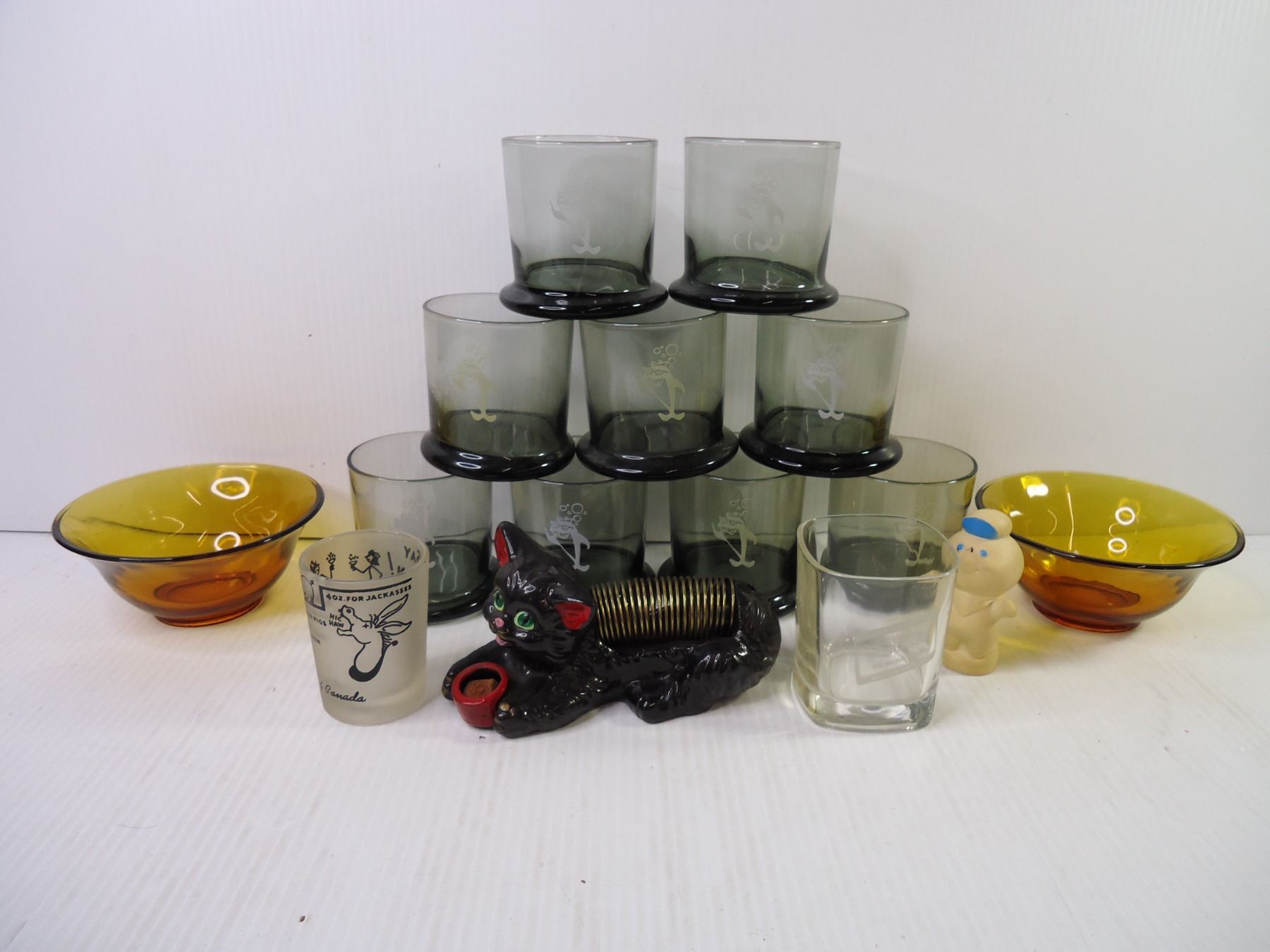 (9) Highball Glasses,(2) Gold Dessert Dishes(chips) ,Ornaments and Glasses