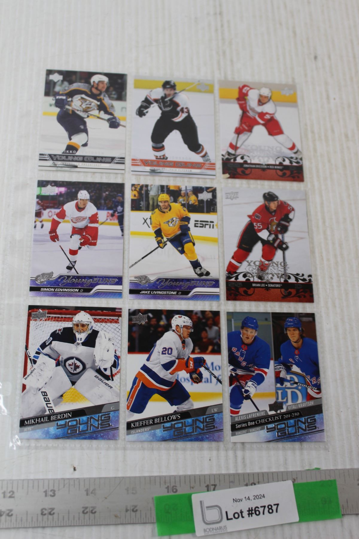 (9) Upper Deck Young Guns Hockey Rookie Cards - Brian Lee, Mikko Lehtonen, Lars Jonsson, Jonathon Ericsson, Jake Livingstone, Simon EdvinssonKieffer Bellows, Mikhail Berdin, and YG Checklist, From Various Upper Deck Hockey Cards Series, Consigner Says Mint Condition