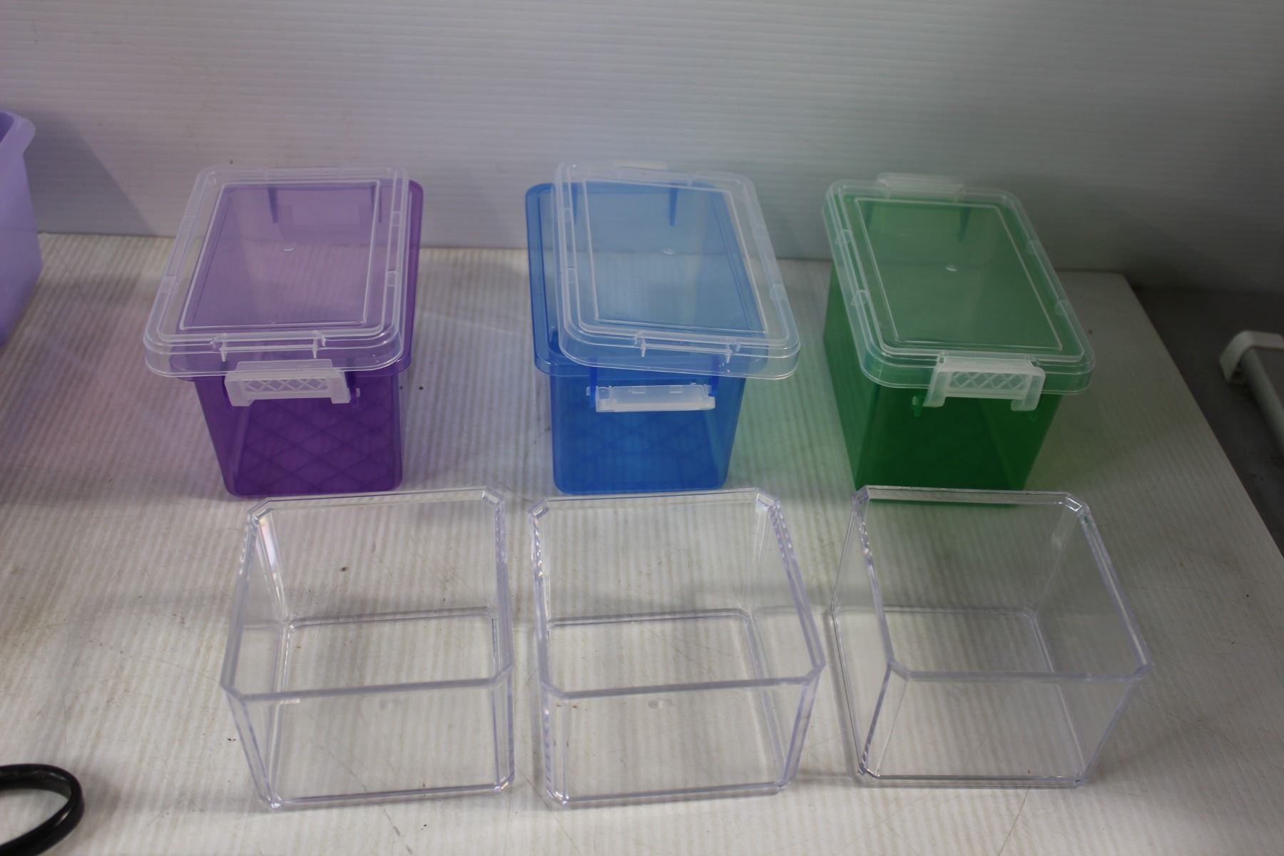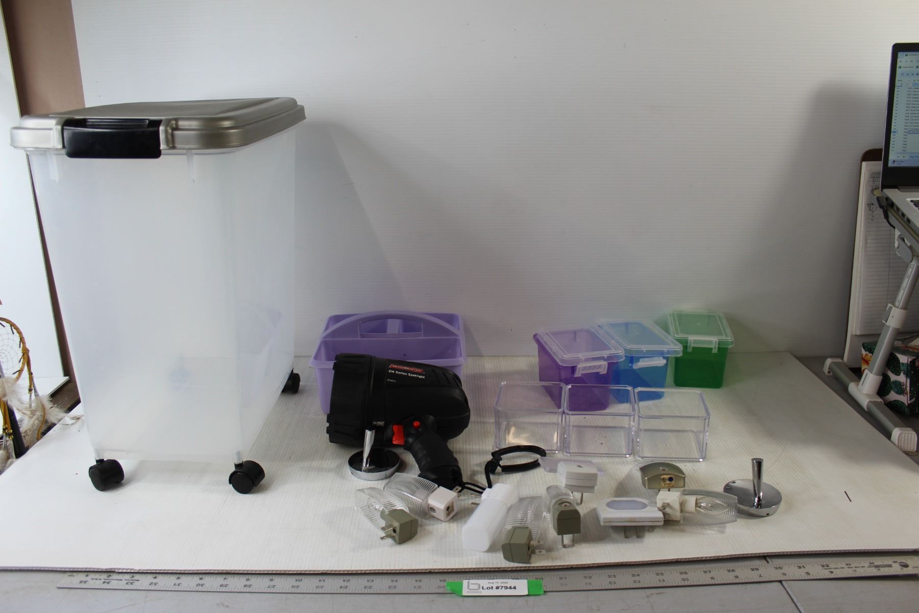 (9) Wall Lamps, (7) Plastic Containers, (2) Bathroom Door Hooks, Motomaster 2M Series Spotlight, Big Rolling Plastic Tub