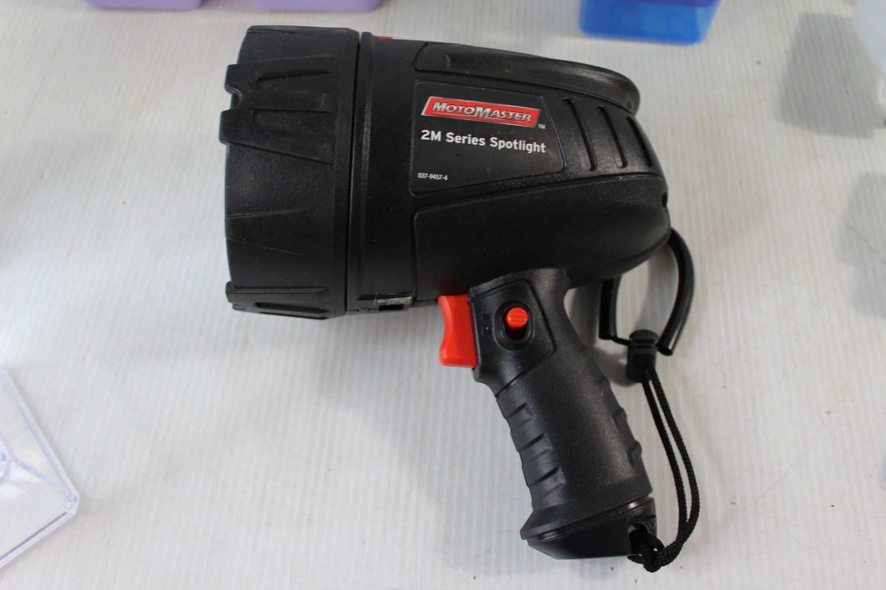 (9) Wall Lamps, (7) Plastic Containers, (2) Bathroom Door Hooks, Motomaster 2M Series Spotlight, Big