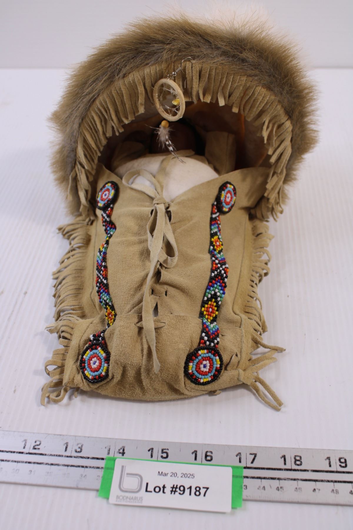Aboriginal Wall Hanging featuring a baby in a Leather,Fur and Beaded Bed (11x8x7")