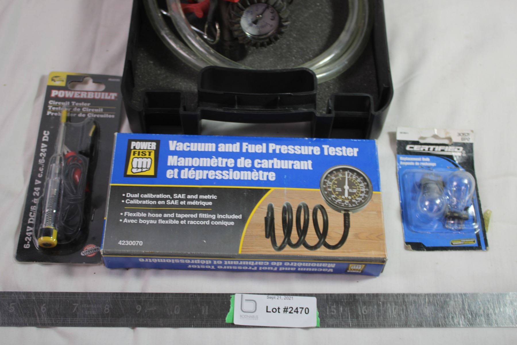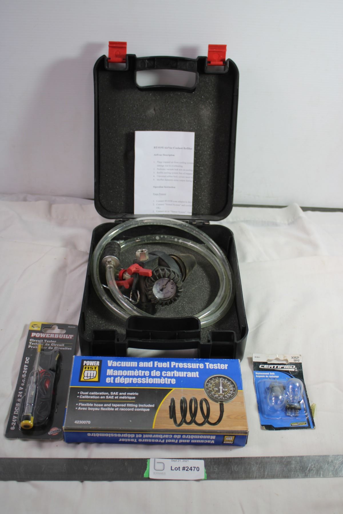 Air coolant refiller + vacume and fuel pressure tester + circuit tester + hologen bulbs 3057/BP2