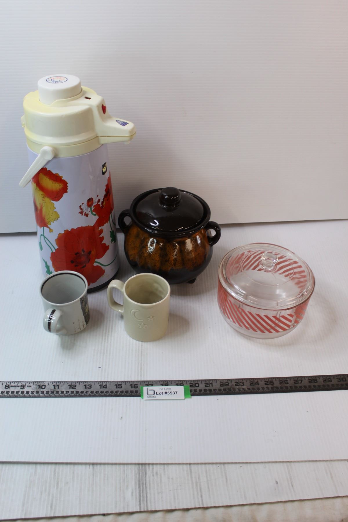 Airpot, Bean Pot, Glass Casserole With Lid, (2) Owl Mugs