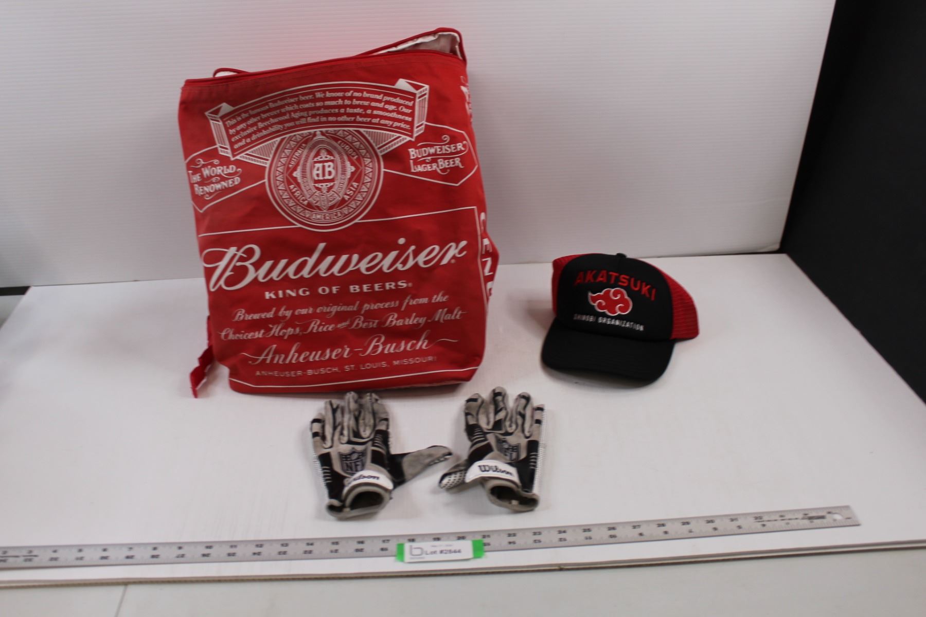 "Akatsuki: Shanobi Organization" Mess Snap Back Cap, Used Wilson NFL Football Gloves (Size Med) & Budweiser Beer Cooler Bag (Used , A Bit Dirty Inside)