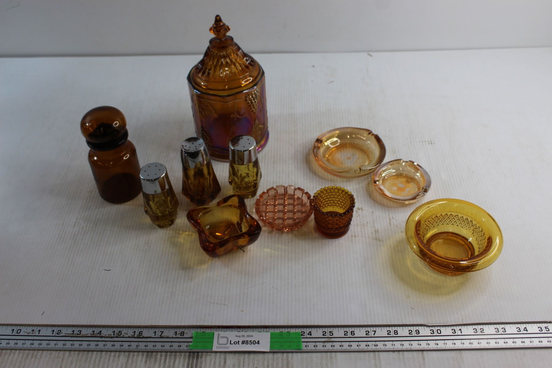 Amber Glass Salt & Pepper Shakers, Carnival Glass Ashtrays, Tobacco Jar and Assorted Glassware