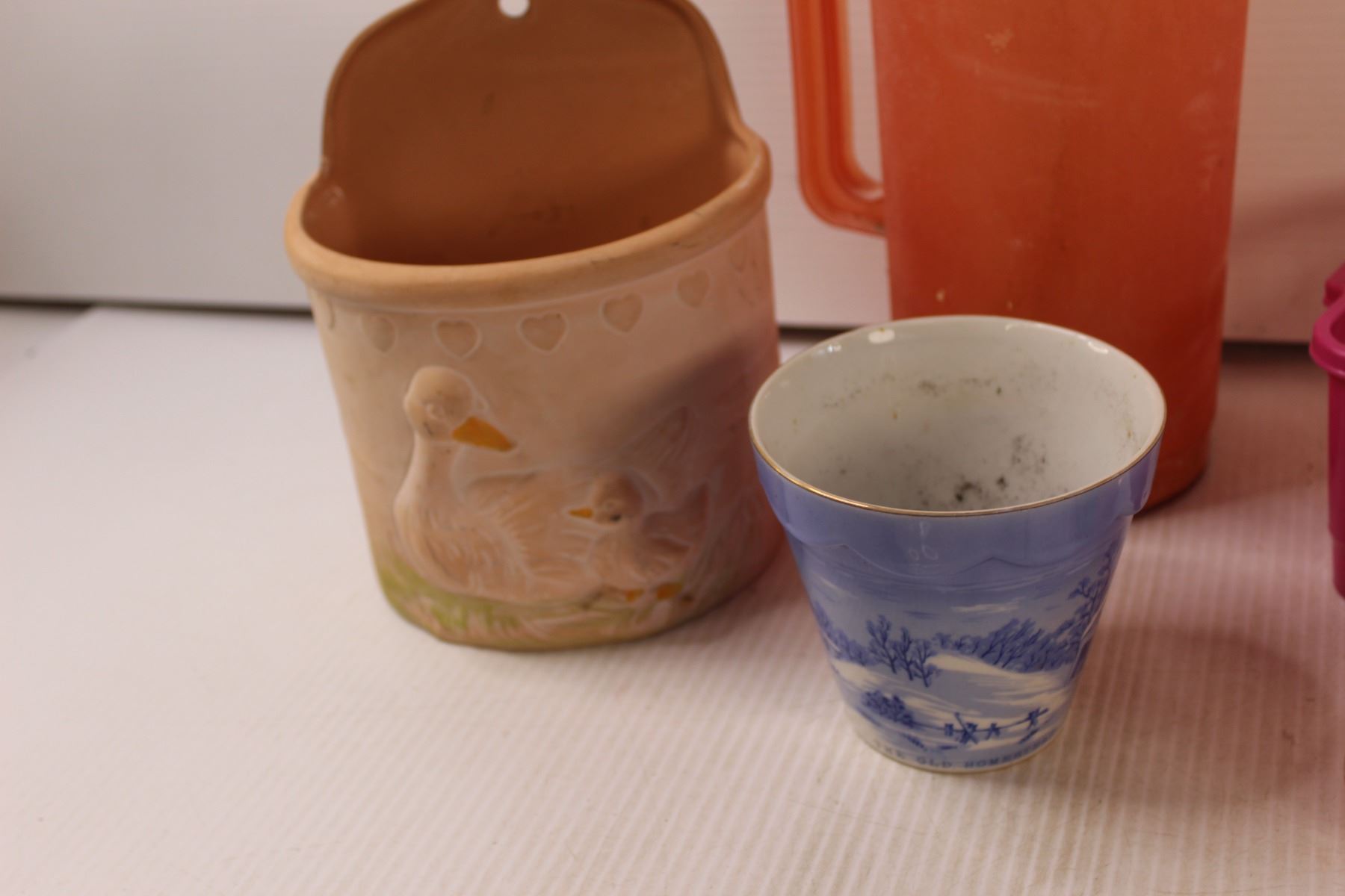 American Beauty Bone China Serving Platter, Wall Mount Planter, Plastic Basket Containing Lamp parts, Footer Planter Base, Plant Pot, Citronella Candle & Plant Watering Pitcher