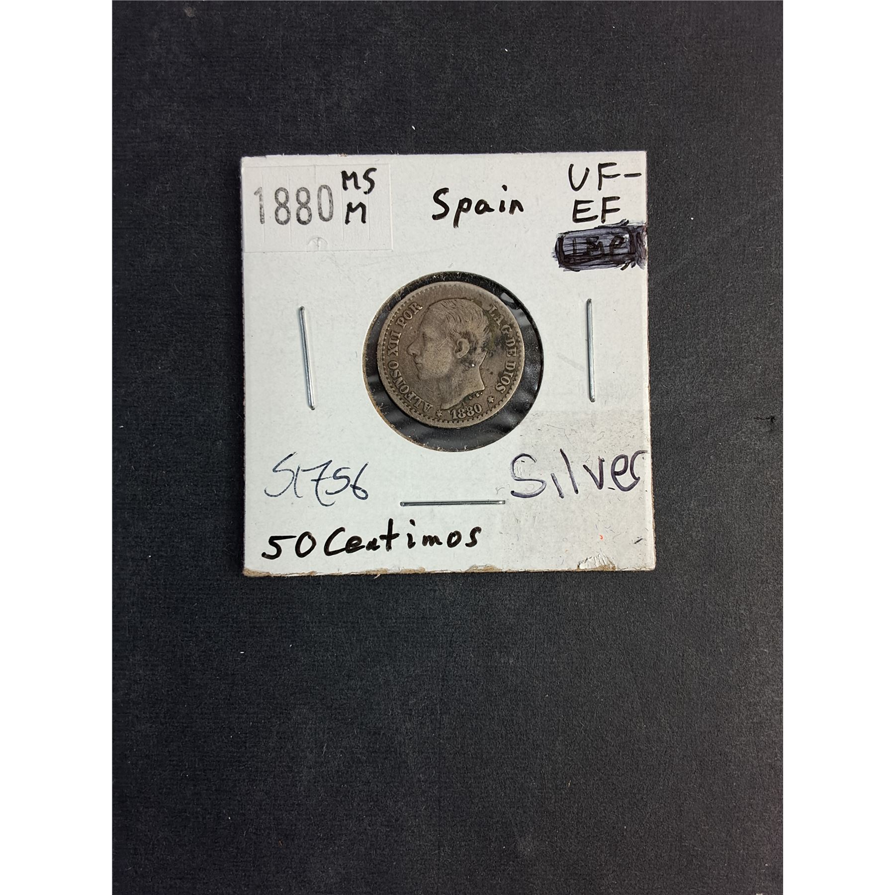 Antique 1880 Spanish 50 Centimos Silver Coin