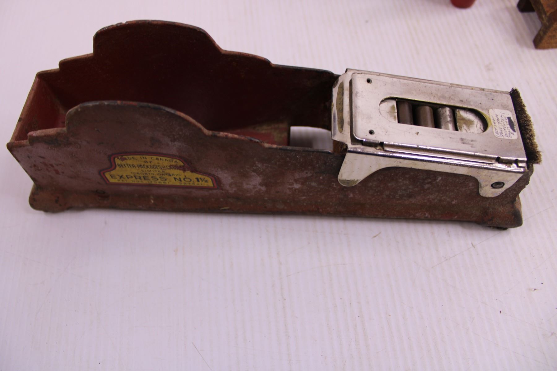 Antique Cast Iron Express Tape Dispenser, Antique Radio Headphones, Vintage Metal Trunk Handle, Set of 10 Mini Wooden Bowling Pins, Wooden Eyeglass Holder