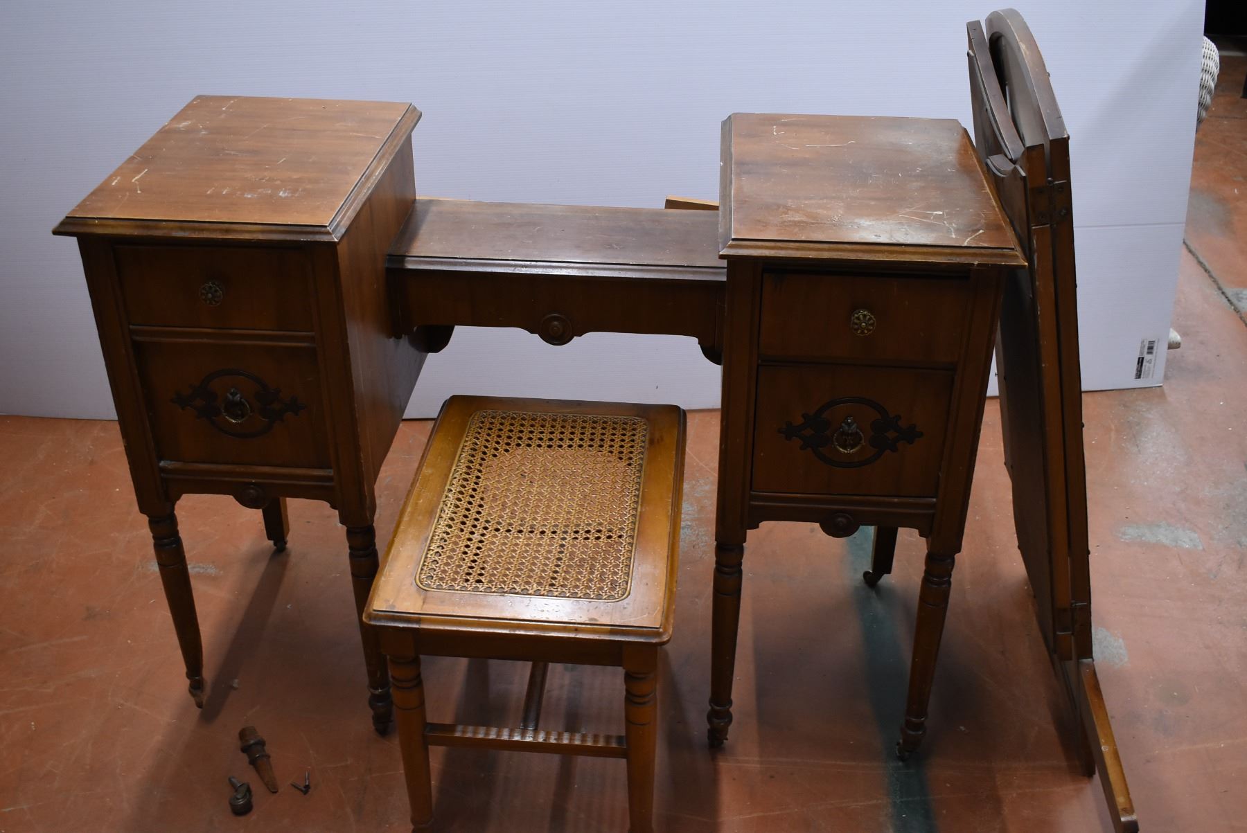 Antique Dresser (on castors) with 3 Piece Mirror + Stool (one broken foot on desk needs repair)