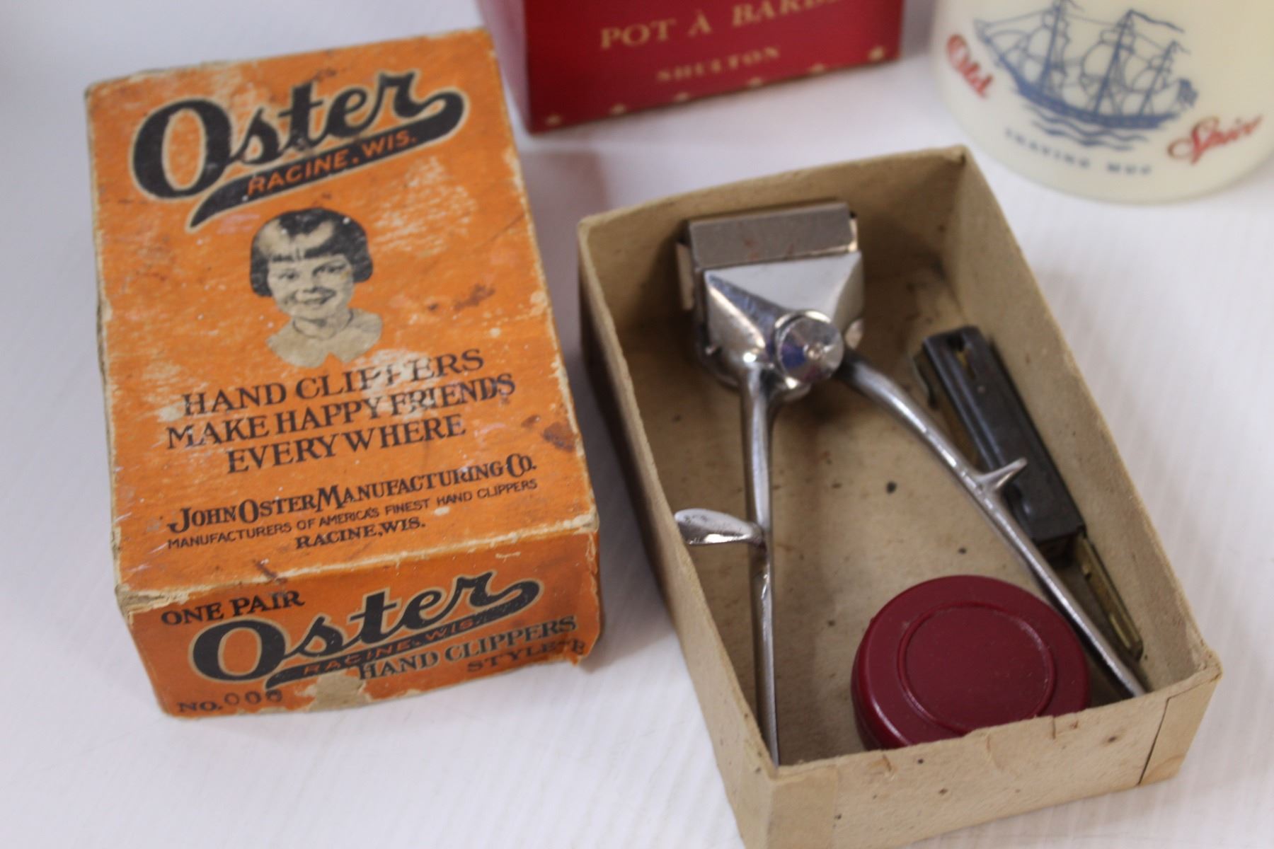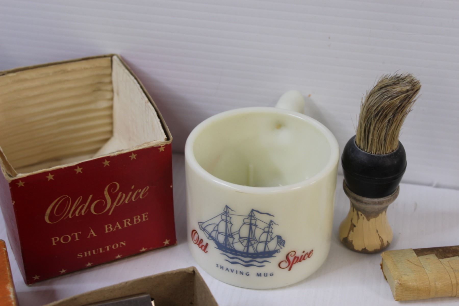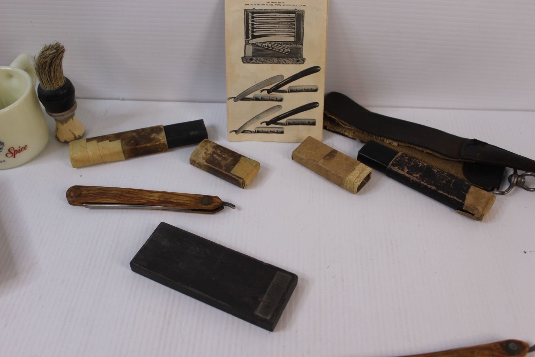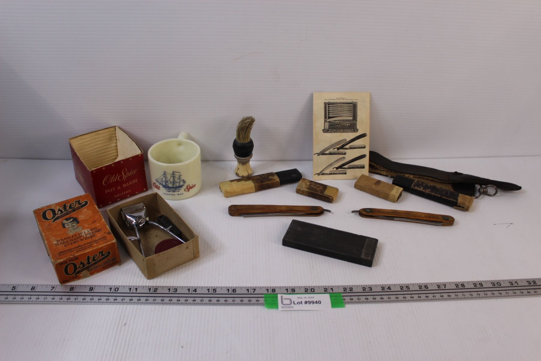 Antique Shaving Lot: Razors, Shaving Cream Mug & Brush, Trimmer, Sharpening Stone
