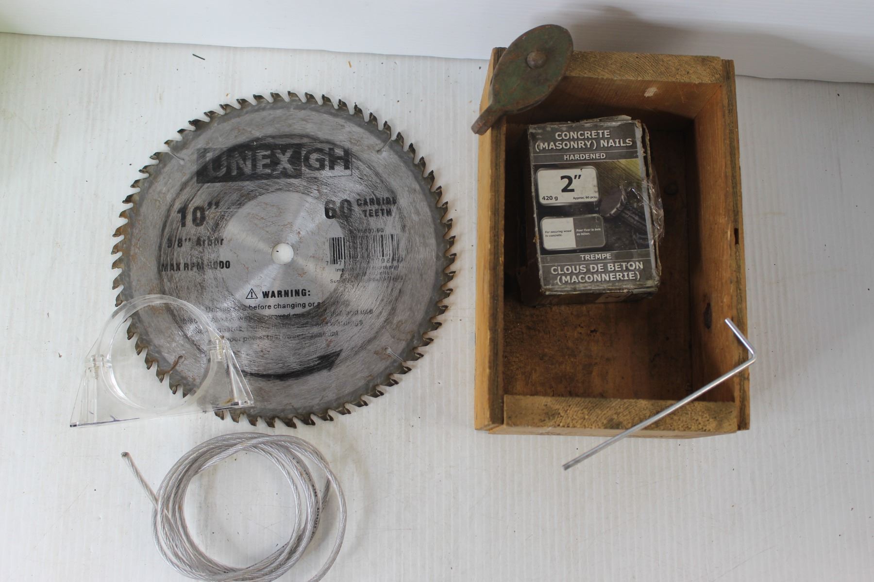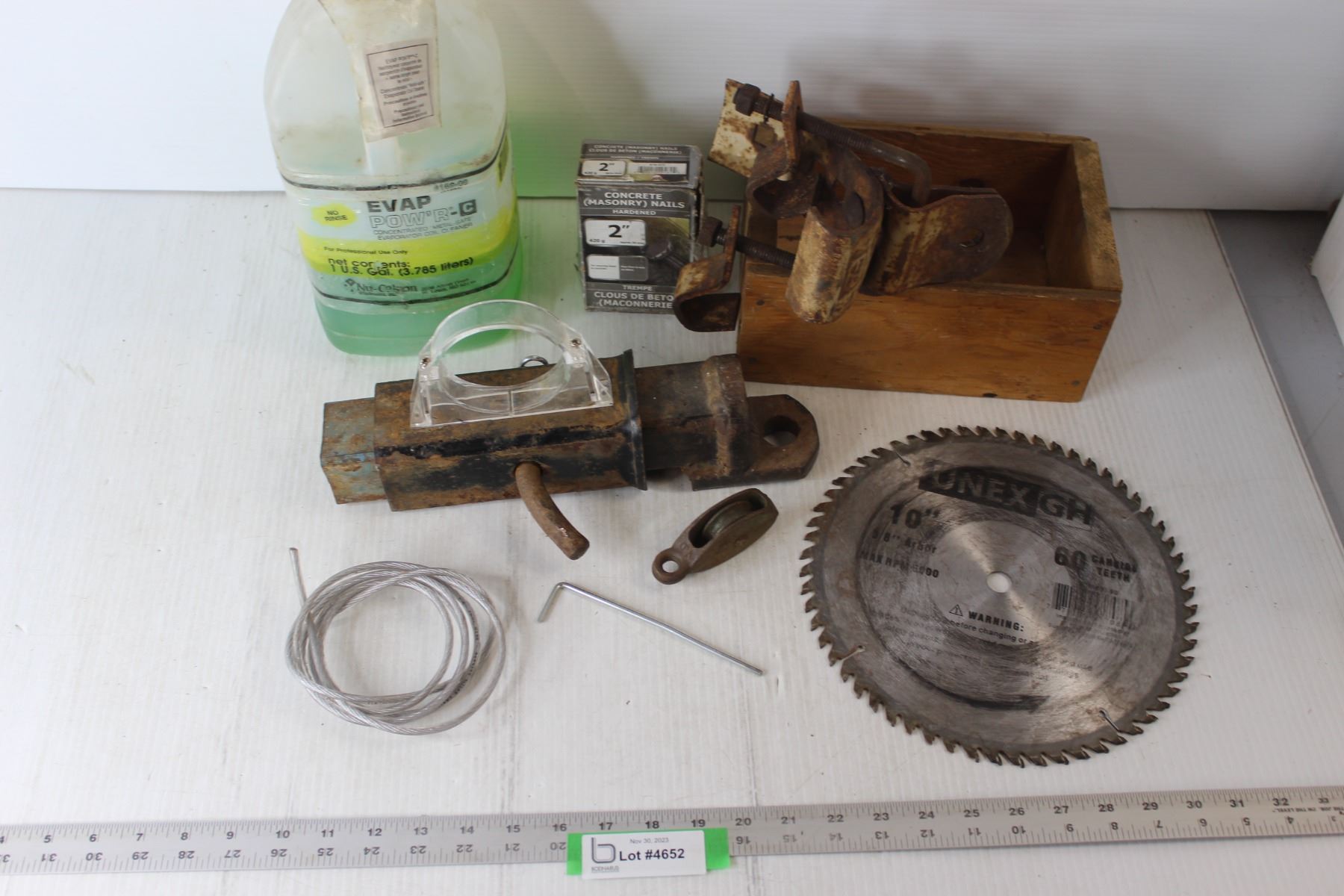 Antique Trailer Hitch, Receiver, 10" Saw Blade, Concrete Nails, Pulley, Wooden Box, Evaporator Coil Cleaner