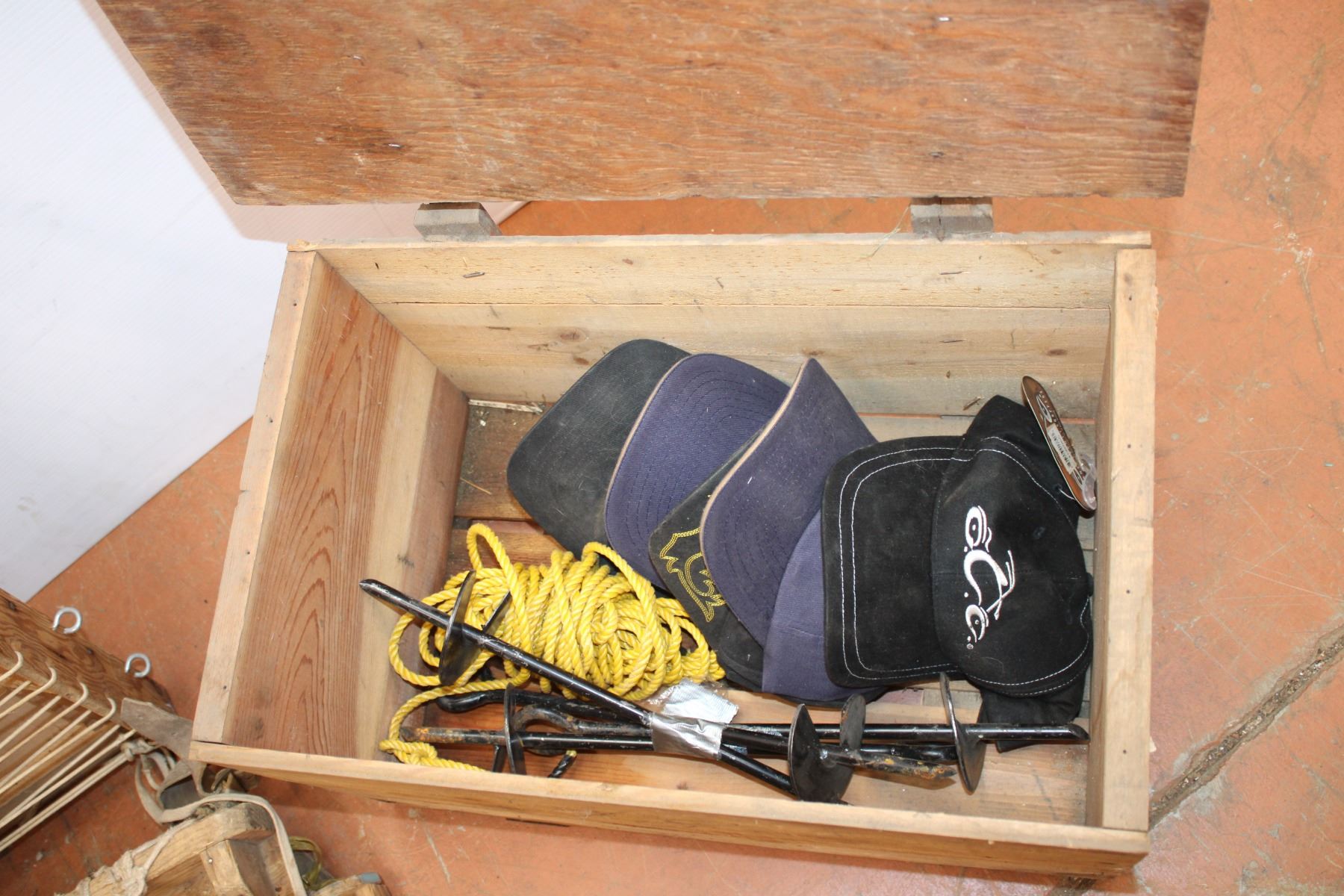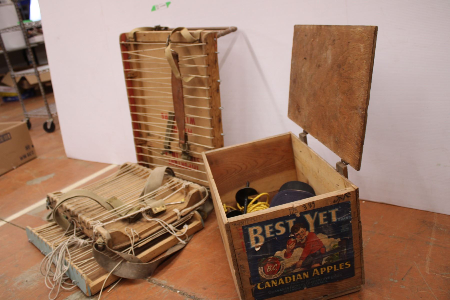 *Apple Crate w/ (5) hats, rope + (3) Camp Bag Frames