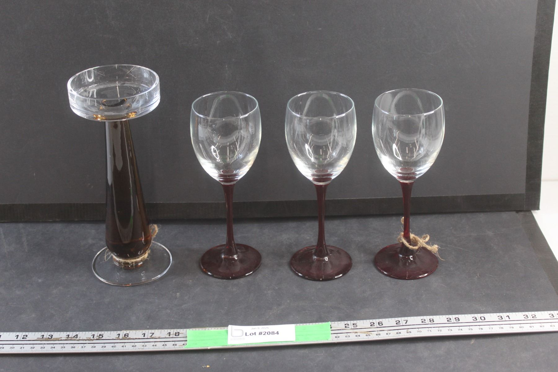 Art Glass Candle Holder and (3) Ruby Luminar Wine Goblets
