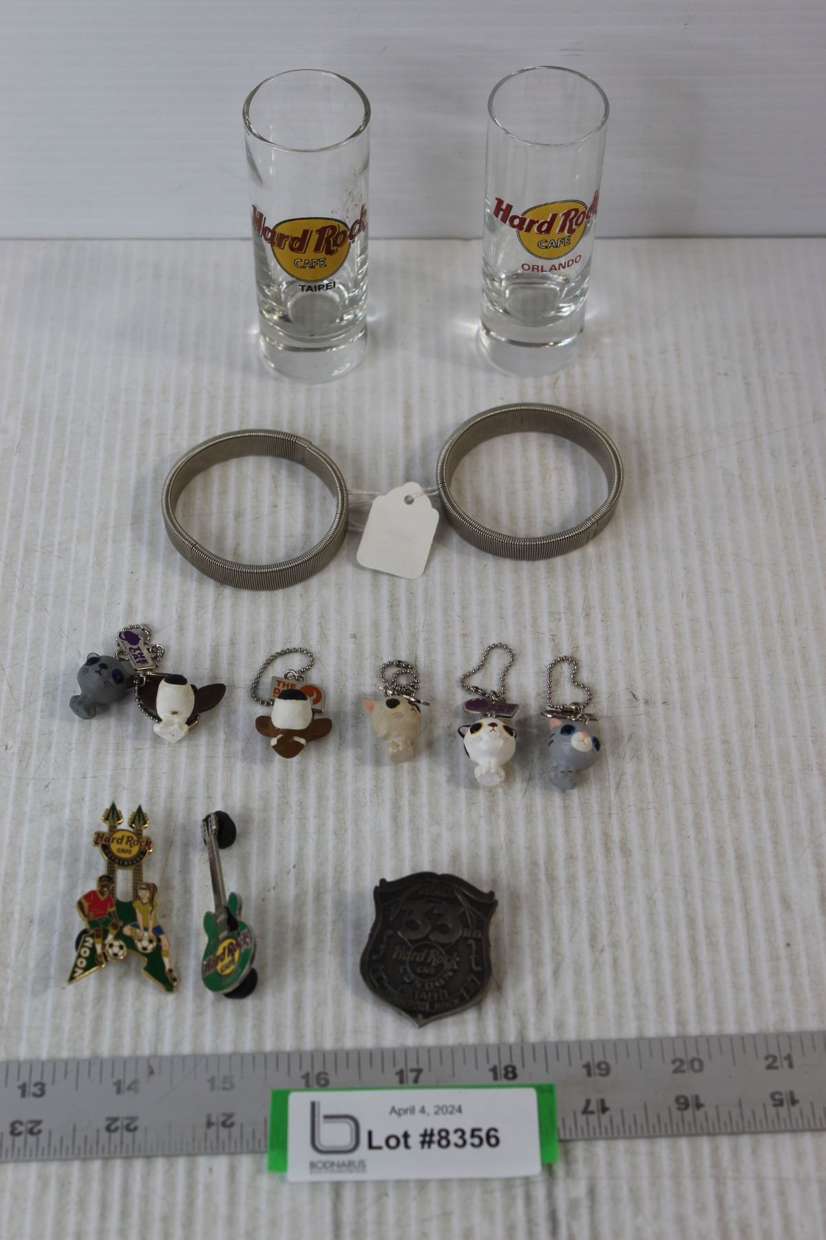 Artist Collection Key Chains, (2) Vintage Men's Arm Bands, Hard Rock Cafe Shot Glasses, Hard Rock Cafe Pins