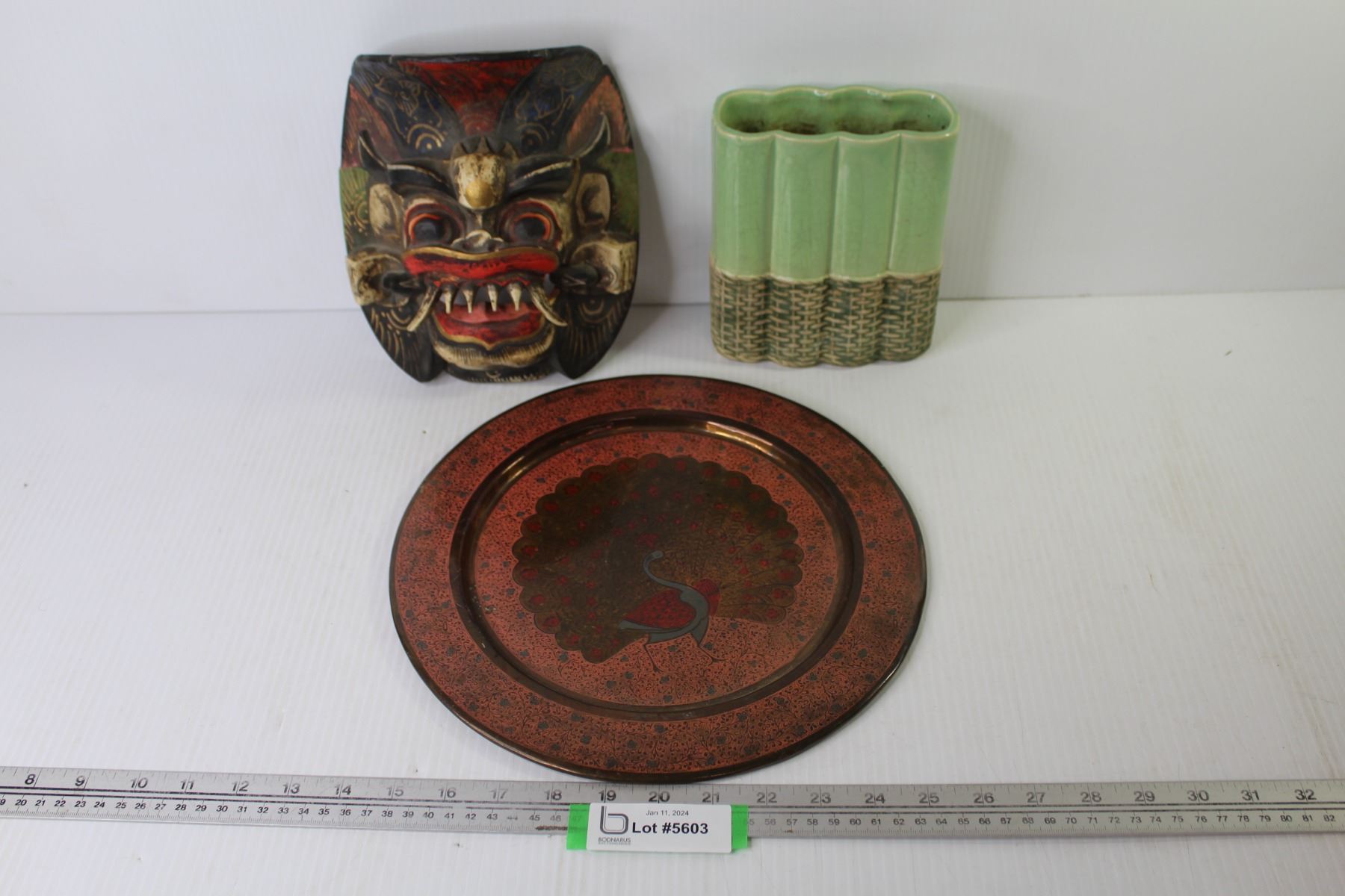 Asian Themed Metal Peacock Plate - Carved Wooden Face - Ceramic Vase