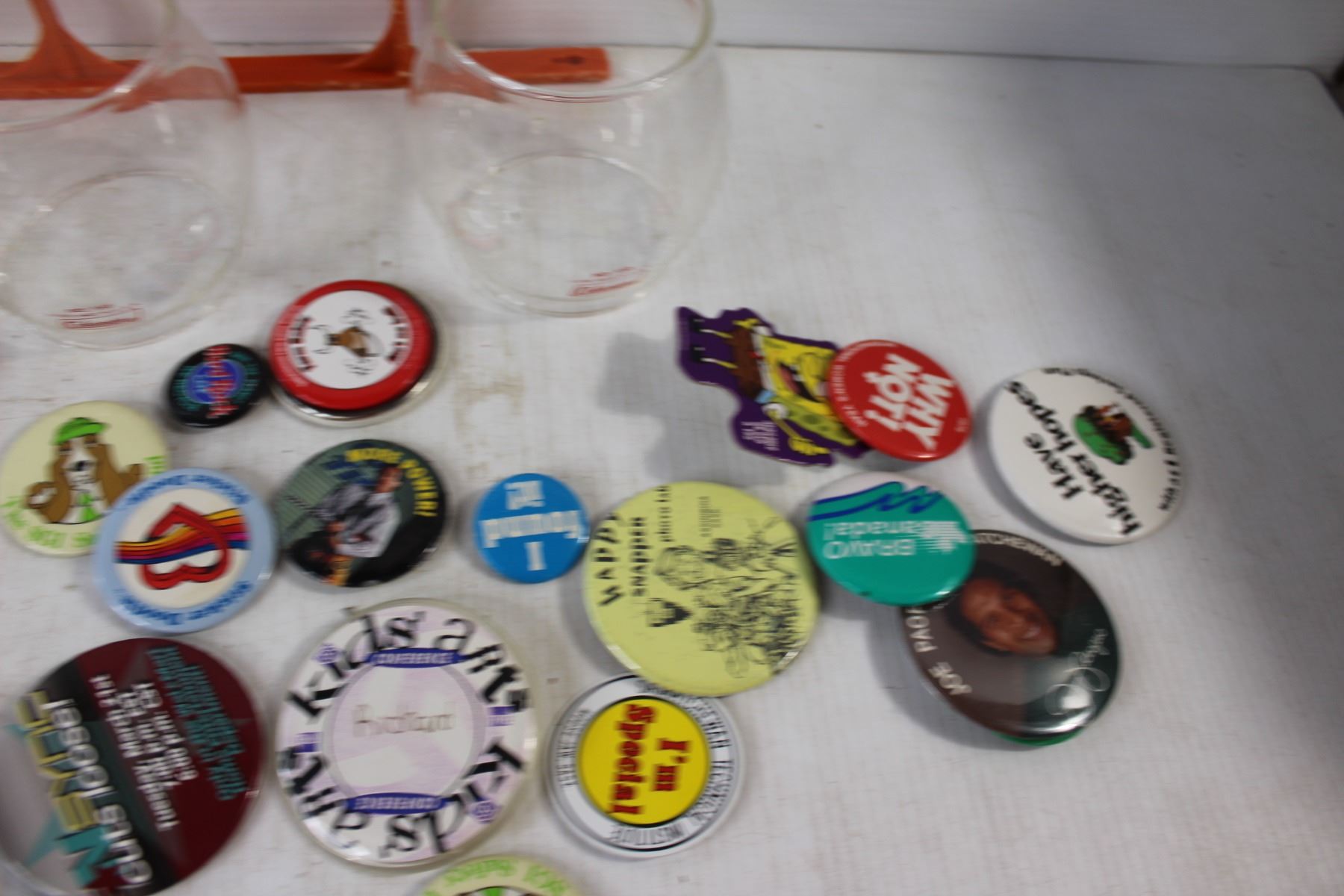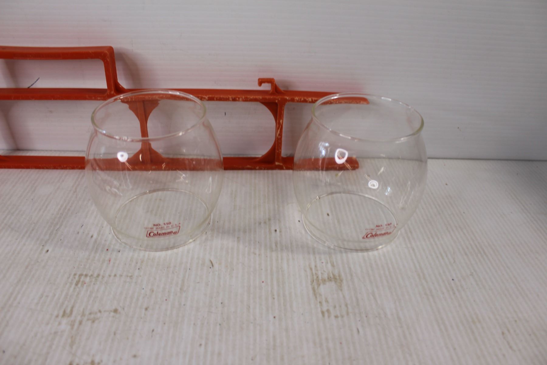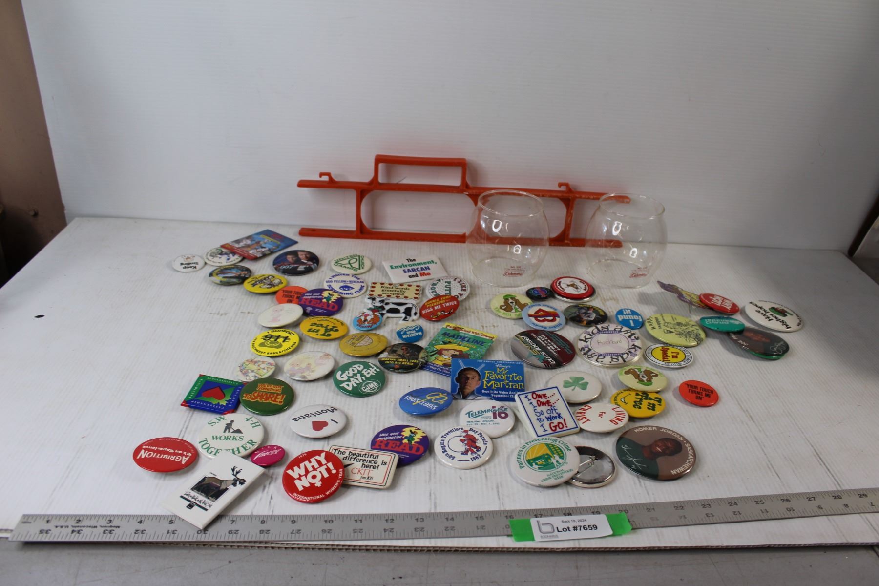 Assorted Button Pins, Coleman Lamp Chimneys, Extension Cord Holder