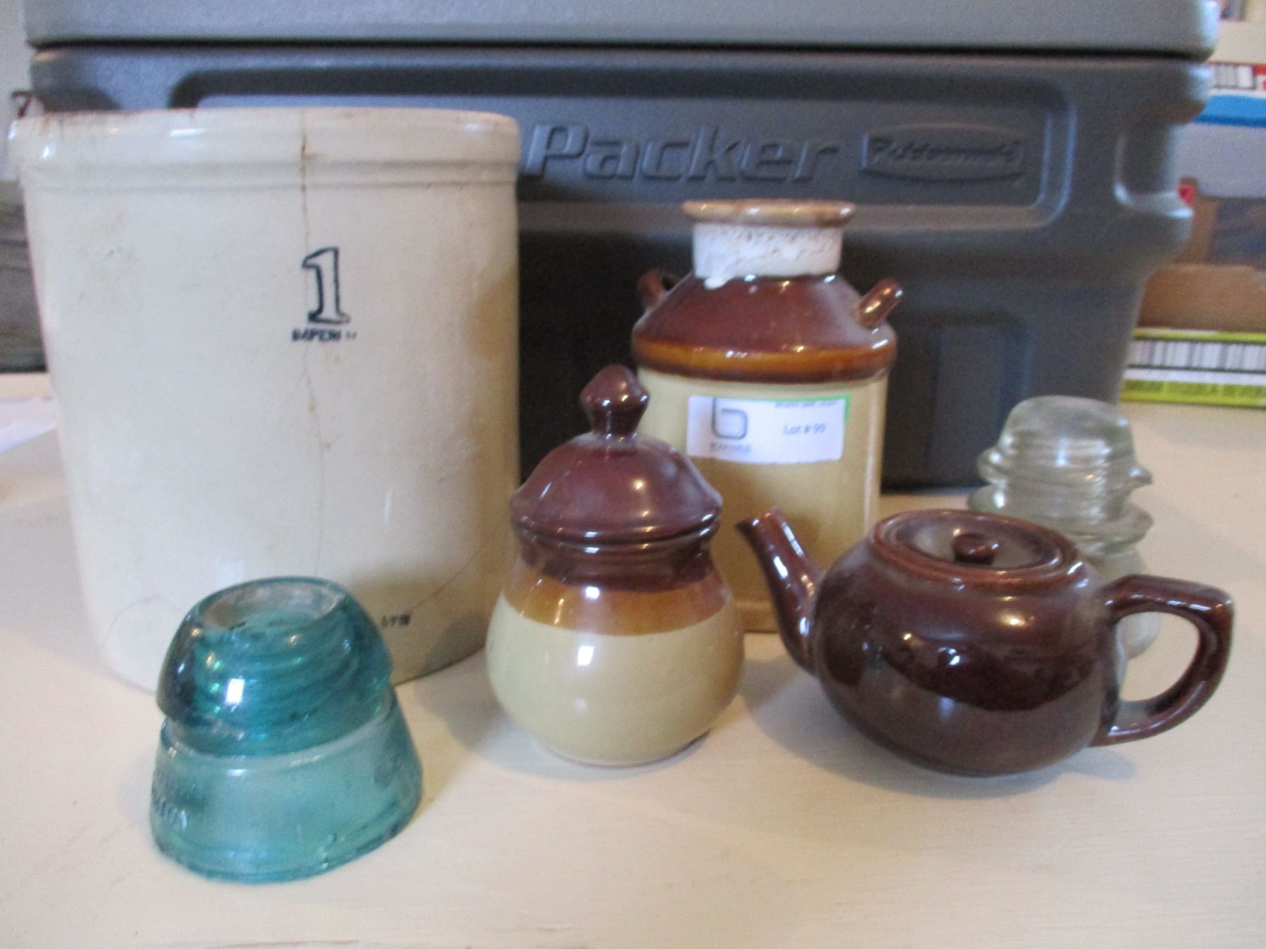 Assorted Crockery Pieces and 2 Telephone Insulators